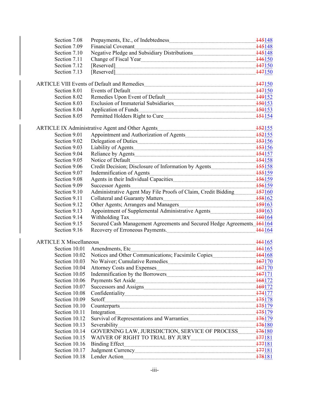 Section 7.08 Prepayments, Etc., of Indebtedness 145148 Section 7.09 Financial Covenant 145148 Section 7.10 Negative Pledge and Subsidiary Distributions 145148 Section 7.11 Change of Fiscal Year 146150 Section 7.12 [Reserved] 147150 Section 7.13 [Reserved] 147150 ARTICLE VIII Events of Default and Remedies 147150 Section 8.01 Events of Default 147150 Section 8.02 Remedies Upon Event of Default 149152 Section 8.03 Exclusion of Immaterial Subsidiaries 150153 Section 8.04 Application of Funds 150153 Section 8.05 Permitted Holders Right to Cure 151154 ARTICLE IX Administrative Agent and Other Agents 152155 Section 9.01 Appointment and Authorization of Agents 152155 Section 9.02 Delegation of Duties 153156 Section 9.03 Liability of Agents 153156 Section 9.04 Reliance by Agents 154157 Section 9.05 Notice of Default 154158 Section 9.06 Credit Decision; Disclosure of Information by Agents 155158 Section 9.07 Indemnification of Agents 155159 Section 9.08 Agents in their Individual Capacities 156159 Section 9.09 Successor Agents 156159 Section 9.10 Administrative Agent May File Proofs of Claim, Credit Bidding 157160 Section 9.11 Collateral and Guaranty Matters 158162 Section 9.12 Other Agents; Arrangers and Managers 159163 Section 9.13 Appointment of Supplemental Administrative Agents 159163 Section 9.14 Withholding Tax 160164 Section 9.15 Secured Cash Management Agreements and Secured Hedge Agreements 161164 Section 9.16 Recovery of Erroneous Payments. 161164 ARTICLE X Miscellaneous 161165 Section 10.01 Amendments, Etc 161165 Section 10.02 Notices and Other Communications; Facsimile Copies 164168 Section 10.03 No Waiver; Cumulative Remedies 167170 Section 10.04 Attorney Costs and Expenses 167170 Section 10.05 Indemnification by the Borrowers 167171 Section 10.06 Payments Set Aside 168172 Section 10.07 Successors and Assigns 169172 Section 10.08 Confidentiality 174177 Section 10.09 Setoff 175178 Section 10.10 Counterparts 175179 Section 10.11 Integration 175179 Section 10.12 Survival of Representations and Warranties 176179 Section 10.13 Severability 176180 Section 10.14 GOVERNING LAW, JURISDICTION, SERVICE OF PROCESS 176180 Section 10.15 WAIVER OF RIGHT TO TRIAL BY JURY 177181 Section 10.16 Binding Effect 177181 Section 10.17 Judgment Currency 177181 Section 10.18 Lender Action 178181 -iii-