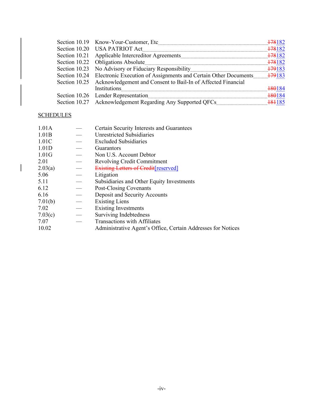Section 10.19 Know-Your-Customer, Etc 178182 Section 10.20 USA PATRIOT Act 178182 Section 10.21 Applicable Intercreditor Agreements 178182 Section 10.22 Obligations Absolute 178182 Section 10.23 No Advisory or Fiduciary Responsibility 179183 Section 10.24 Electronic Execution of Assignments and Certain Other Documents 179183 Section 10.25 Acknowledgement and Consent to Bail-In of Affected Financial Institutions 180184 Section 10.26 Lender Representation 180184 Section 10.27 Acknowledgement Regarding Any Supported QFCs 181185 SCHEDULES 1.01A — Certain Security Interests and Guarantees 1.01B — Unrestricted Subsidiaries 1.01C — Excluded Subsidiaries 1.01D — Guarantors 1.01G — Non U.S. Account Debtor 2.01 — Revolving Credit Commitment 2.03(a) — Existing Letters of Credit[reserved] 5.06 — Litigation 5.11 — Subsidiaries and Other Equity Investments 6.12 — Post-Closing Covenants 6.16 — Deposit and Security Accounts 7.01(b) — Existing Liens 7.02 — Existing Investments 7.03(c) — Surviving Indebtedness 7.07 — Transactions with Affiliates 10.02 Administrative Agent’s Office, Certain Addresses for Notices -iv-