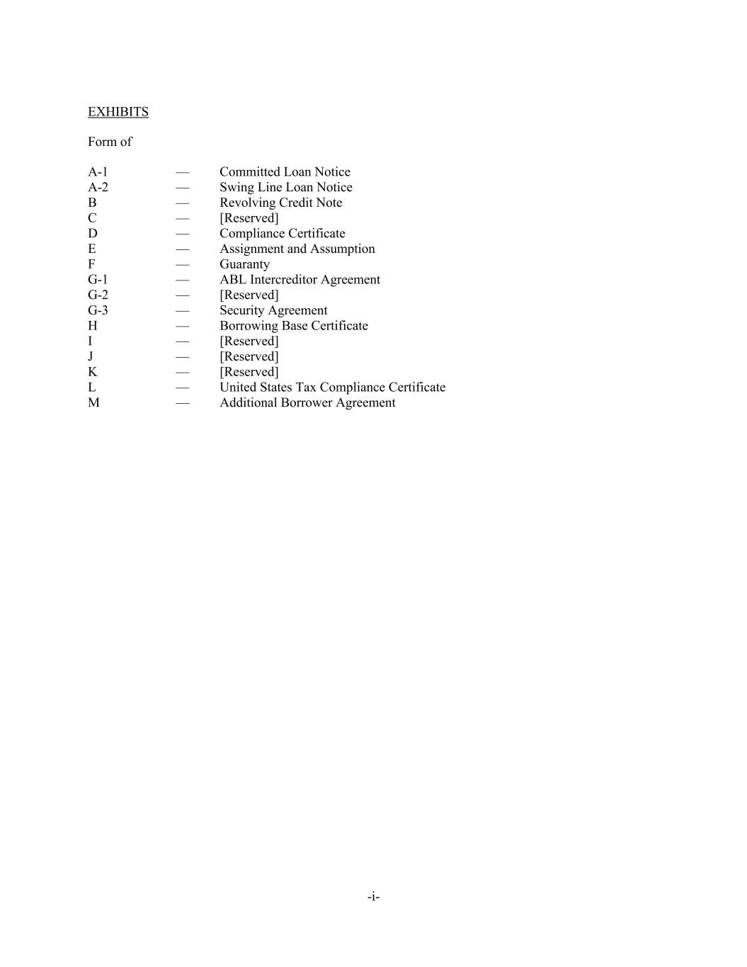 EXHIBITS Form of A-1 — Committed Loan Notice A-2 — Swing Line Loan Notice B — Revolving Credit Note C — [Reserved] D — Compliance Certificate E — Assignment and Assumption F — Guaranty G-1 — ABL Intercreditor Agreement G-2 — [Reserved] G-3 — Security Agreement H — Borrowing Base Certificate I — [Reserved] J — [Reserved] K — [Reserved] L — United States Tax Compliance Certificate M — Additional Borrower Agreement -i-