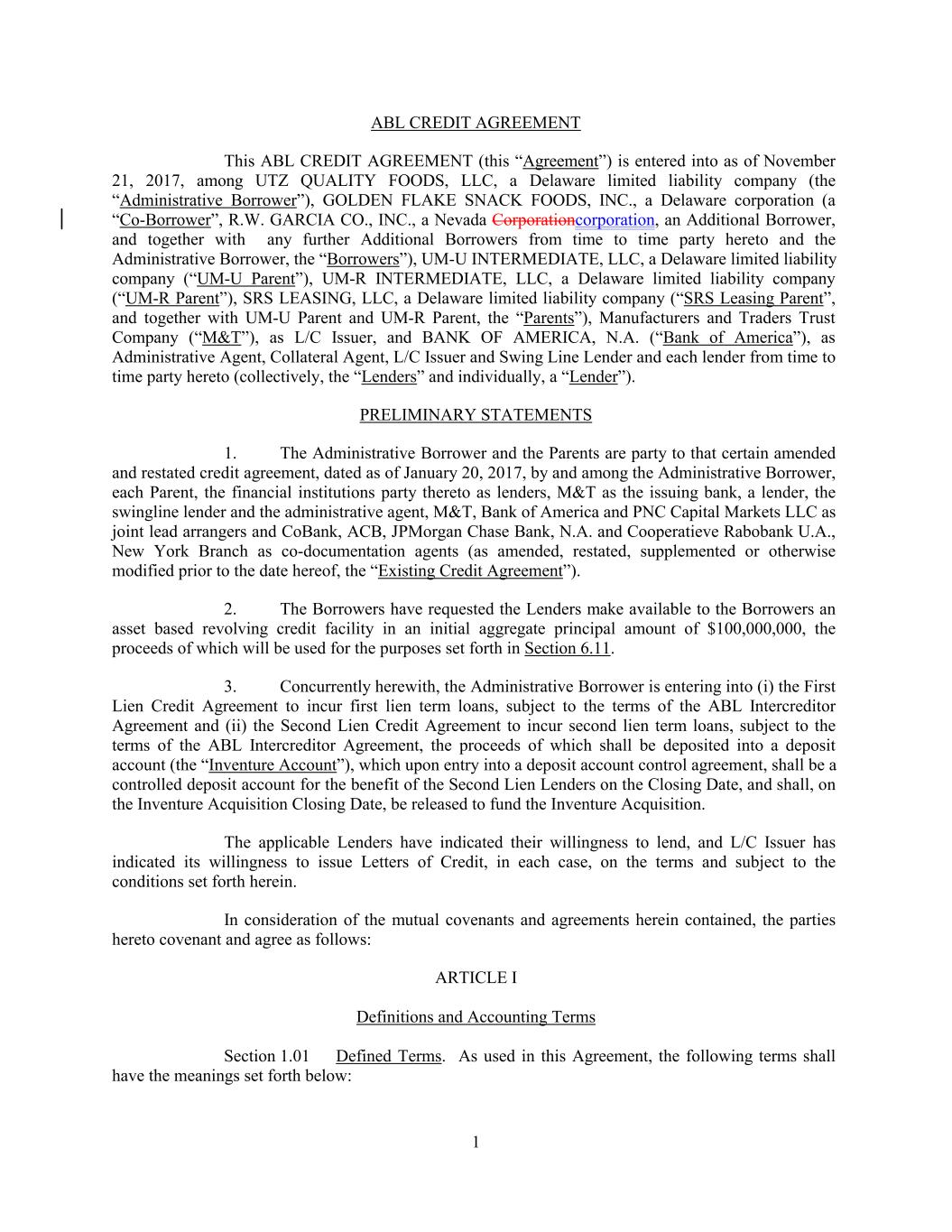 ABL CREDIT AGREEMENT This ABL CREDIT AGREEMENT (this “Agreement”) is entered into as of November 21, 2017, among UTZ QUALITY FOODS, LLC, a Delaware limited liability company (the “Administrative Borrower”), GOLDEN FLAKE SNACK FOODS, INC., a Delaware corporation (a “Co-Borrower”, R.W. GARCIA CO., INC., a Nevada Corporationcorporation, an Additional Borrower, and together with any further Additional Borrowers from time to time party hereto and the Administrative Borrower, the “Borrowers”), UM-U INTERMEDIATE, LLC, a Delaware limited liability company (“UM-U Parent”), UM-R INTERMEDIATE, LLC, a Delaware limited liability company (“UM-R Parent”), SRS LEASING, LLC, a Delaware limited liability company (“SRS Leasing Parent”, and together with UM-U Parent and UM-R Parent, the “Parents”), Manufacturers and Traders Trust Company (“M&T”), as L/C Issuer, and BANK OF AMERICA, N.A. (“Bank of America”), as Administrative Agent, Collateral Agent, L/C Issuer and Swing Line Lender and each lender from time to time party hereto (collectively, the “Lenders” and individually, a “Lender”). PRELIMINARY STATEMENTS 1. The Administrative Borrower and the Parents are party to that certain amended and restated credit agreement, dated as of January 20, 2017, by and among the Administrative Borrower, each Parent, the financial institutions party thereto as lenders, M&T as the issuing bank, a lender, the swingline lender and the administrative agent, M&T, Bank of America and PNC Capital Markets LLC as joint lead arrangers and CoBank, ACB, JPMorgan Chase Bank, N.A. and Cooperatieve Rabobank U.A., New York Branch as co-documentation agents (as amended, restated, supplemented or otherwise modified prior to the date hereof, the “Existing Credit Agreement”). 2. The Borrowers have requested the Lenders make available to the Borrowers an asset based revolving credit facility in an initial aggregate principal amount of $100,000,000, the proceeds of which will be used for the purposes set forth in Section 6.11. 3. Concurrently herewith, the Administrative Borrower is entering into (i) the First Lien Credit Agreement to incur first lien term loans, subject to the terms of the ABL Intercreditor Agreement and (ii) the Second Lien Credit Agreement to incur second lien term loans, subject to the terms of the ABL Intercreditor Agreement, the proceeds of which shall be deposited into a deposit account (the “Inventure Account”), which upon entry into a deposit account control agreement, shall be a controlled deposit account for the benefit of the Second Lien Lenders on the Closing Date, and shall, on the Inventure Acquisition Closing Date, be released to fund the Inventure Acquisition. The applicable Lenders have indicated their willingness to lend, and L/C Issuer has indicated its willingness to issue Letters of Credit, in each case, on the terms and subject to the conditions set forth herein. In consideration of the mutual covenants and agreements herein contained, the parties hereto covenant and agree as follows: ARTICLE I Definitions and Accounting Terms Section 1.01 Defined Terms. As used in this Agreement, the following terms shall have the meanings set forth below: 1