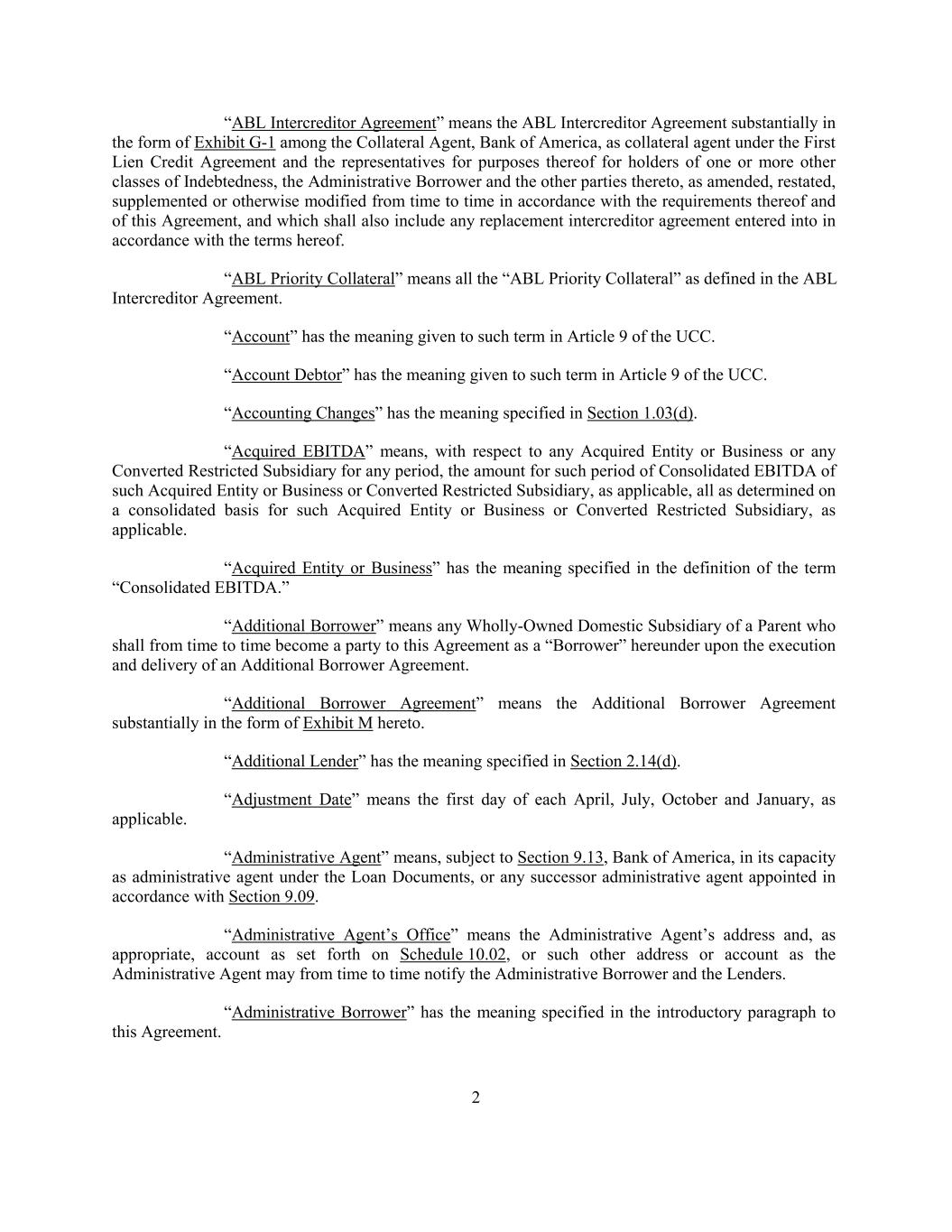 “ABL Intercreditor Agreement” means the ABL Intercreditor Agreement substantially in the form of Exhibit G-1 among the Collateral Agent, Bank of America, as collateral agent under the First Lien Credit Agreement and the representatives for purposes thereof for holders of one or more other classes of Indebtedness, the Administrative Borrower and the other parties thereto, as amended, restated, supplemented or otherwise modified from time to time in accordance with the requirements thereof and of this Agreement, and which shall also include any replacement intercreditor agreement entered into in accordance with the terms hereof. “ABL Priority Collateral” means all the “ABL Priority Collateral” as defined in the ABL Intercreditor Agreement. “Account” has the meaning given to such term in Article 9 of the UCC. “Account Debtor” has the meaning given to such term in Article 9 of the UCC. “Accounting Changes” has the meaning specified in Section 1.03(d). “Acquired EBITDA” means, with respect to any Acquired Entity or Business or any Converted Restricted Subsidiary for any period, the amount for such period of Consolidated EBITDA of such Acquired Entity or Business or Converted Restricted Subsidiary, as applicable, all as determined on a consolidated basis for such Acquired Entity or Business or Converted Restricted Subsidiary, as applicable. “Acquired Entity or Business” has the meaning specified in the definition of the term “Consolidated EBITDA.” “Additional Borrower” means any Wholly-Owned Domestic Subsidiary of a Parent who shall from time to time become a party to this Agreement as a “Borrower” hereunder upon the execution and delivery of an Additional Borrower Agreement. “Additional Borrower Agreement” means the Additional Borrower Agreement substantially in the form of Exhibit M hereto. “Additional Lender” has the meaning specified in Section 2.14(d). “Adjustment Date” means the first day of each April, July, October and January, as applicable. “Administrative Agent” means, subject to Section 9.13, Bank of America, in its capacity as administrative agent under the Loan Documents, or any successor administrative agent appointed in accordance with Section 9.09. “Administrative Agent’s Office” means the Administrative Agent’s address and, as appropriate, account as set forth on Schedule 10.02, or such other address or account as the Administrative Agent may from time to time notify the Administrative Borrower and the Lenders. “Administrative Borrower” has the meaning specified in the introductory paragraph to this Agreement. 2