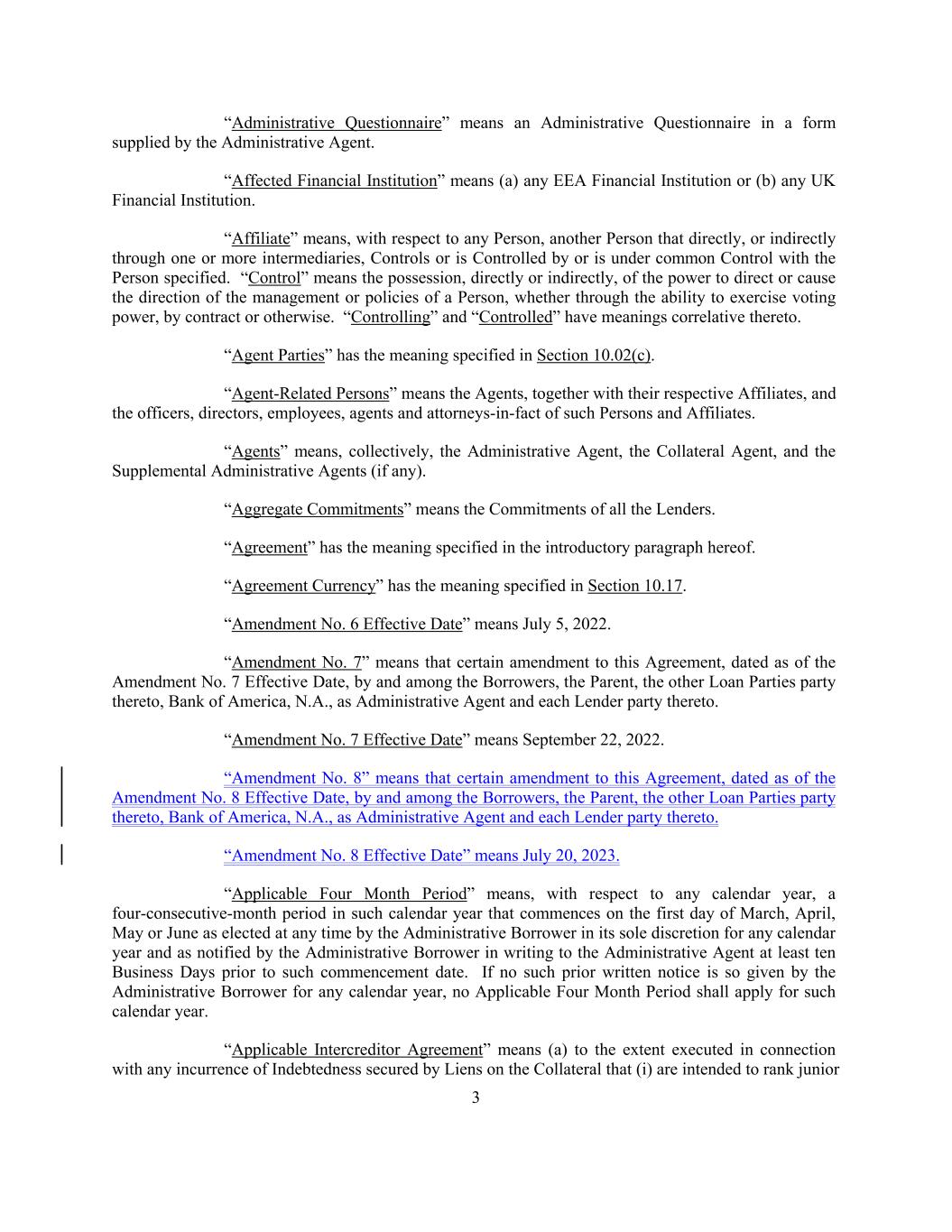 “Administrative Questionnaire” means an Administrative Questionnaire in a form supplied by the Administrative Agent. “Affected Financial Institution” means (a) any EEA Financial Institution or (b) any UK Financial Institution. “Affiliate” means, with respect to any Person, another Person that directly, or indirectly through one or more intermediaries, Controls or is Controlled by or is under common Control with the Person specified. “Control” means the possession, directly or indirectly, of the power to direct or cause the direction of the management or policies of a Person, whether through the ability to exercise voting power, by contract or otherwise. “Controlling” and “Controlled” have meanings correlative thereto. “Agent Parties” has the meaning specified in Section 10.02(c). “Agent-Related Persons” means the Agents, together with their respective Affiliates, and the officers, directors, employees, agents and attorneys-in-fact of such Persons and Affiliates. “Agents” means, collectively, the Administrative Agent, the Collateral Agent, and the Supplemental Administrative Agents (if any). “Aggregate Commitments” means the Commitments of all the Lenders. “Agreement” has the meaning specified in the introductory paragraph hereof. “Agreement Currency” has the meaning specified in Section 10.17. “Amendment No. 6 Effective Date” means July 5, 2022. “Amendment No. 7” means that certain amendment to this Agreement, dated as of the Amendment No. 7 Effective Date, by and among the Borrowers, the Parent, the other Loan Parties party thereto, Bank of America, N.A., as Administrative Agent and each Lender party thereto. “Amendment No. 7 Effective Date” means September 22, 2022. “Amendment No. 8” means that certain amendment to this Agreement, dated as of the Amendment No. 8 Effective Date, by and among the Borrowers, the Parent, the other Loan Parties party thereto, Bank of America, N.A., as Administrative Agent and each Lender party thereto. “Amendment No. 8 Effective Date” means July 20, 2023. “Applicable Four Month Period” means, with respect to any calendar year, a four-consecutive-month period in such calendar year that commences on the first day of March, April, May or June as elected at any time by the Administrative Borrower in its sole discretion for any calendar year and as notified by the Administrative Borrower in writing to the Administrative Agent at least ten Business Days prior to such commencement date. If no such prior written notice is so given by the Administrative Borrower for any calendar year, no Applicable Four Month Period shall apply for such calendar year. “Applicable Intercreditor Agreement” means (a) to the extent executed in connection with any incurrence of Indebtedness secured by Liens on the Collateral that (i) are intended to rank junior 3