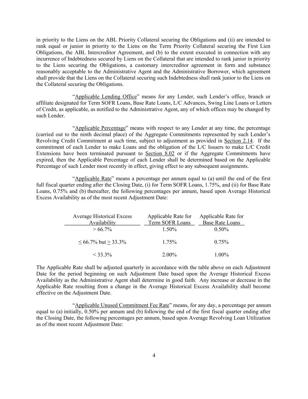 4 0.50% Applicable Rate for Term SOFR Loans in priority to the Liens on the ABL Priority Collateral securing the Obligations and (ii) are intended to rank equal or junior in priority to the Liens on the Term Priority Collateral securing the First Lien Obligations, the ABL Intercreditor Agreement, and (b) to the extent executed in connection with any incurrence of Indebtedness secured by Liens on the Collateral that are intended to rank junior in priority to the Liens securing the Obligations, a customary intercreditor agreement in form and substance reasonably acceptable to the Administrative Agent and the Administrative Borrower, which agreement shall provide that the Liens on the Collateral securing such Indebtedness shall rank junior to the Liens on the Collateral securing the Obligations. “Applicable Lending Office” means for any Lender, such Lender’s office, branch or affiliate designated for Term SOFR Loans, Base Rate Loans, L/C Advances, Swing Line Loans or Letters of Credit, as applicable, as notified to the Administrative Agent, any of which offices may be changed by such Lender. “Applicable Percentage” means with respect to any Lender at any time, the percentage (carried out to the ninth decimal place) of the Aggregate Commitments represented by such Lender’s Revolving Credit Commitment at such time, subject to adjustment as provided in Section 2.14. If the commitment of each Lender to make Loans and the obligation of the L/C Issuers to make L/C Credit Extensions have been terminated pursuant to Section 8.02 or if the Aggregate Commitments have expired, then the Applicable Percentage of each Lender shall be determined based on the Applicable Percentage of such Lender most recently in effect, giving effect to any subsequent assignments. “Applicable Rate” means a percentage per annum equal to (a) until the end of the first full fiscal quarter ending after the Closing Date, (i) for Term SOFR Loans, 1.75%, and (ii) for Base Rate Loans, 0.75% and (b) thereafter, the following percentages per annum, based upon Average Historical Excess Availability as of the most recent Adjustment Date: ≤ 66.7% but > 33.3% Applicable Rate for Base Rate Loans 1.75% 0.75% < 33.3% ˃ 66.7% 2.00% Average Historical Excess Availability 1.00% 1.50% The Applicable Rate shall be adjusted quarterly in accordance with the table above on each Adjustment Date for the period beginning on such Adjustment Date based upon the Average Historical Excess Availability as the Administrative Agent shall determine in good faith. Any increase or decrease in the Applicable Rate resulting from a change in the Average Historical Excess Availability shall become effective on the Adjustment Date. “Applicable Unused Commitment Fee Rate” means, for any day, a percentage per annum equal to (a) initially, 0.50% per annum and (b) following the end of the first fiscal quarter ending after the Closing Date, the following percentages per annum, based upon Average Revolving Loan Utilization as of the most recent Adjustment Date: