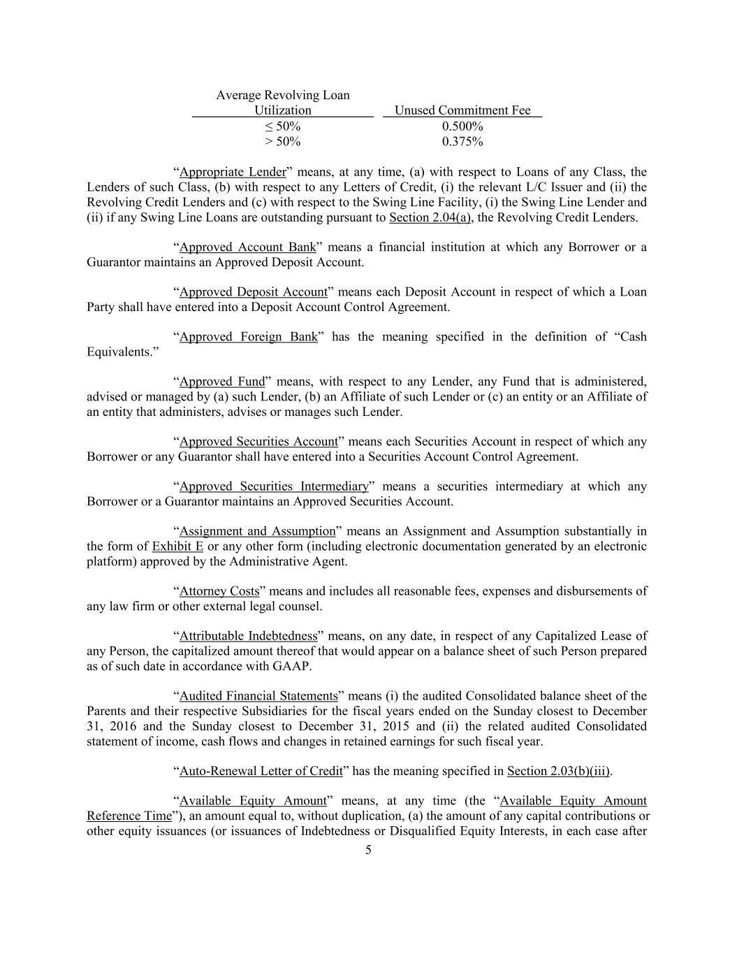 5 ≤ 50% Average Revolving Loan Utilization 0.500% Unused Commitment Fee > 50% 0.375% “Appropriate Lender” means, at any time, (a) with respect to Loans of any Class, the Lenders of such Class, (b) with respect to any Letters of Credit, (i) the relevant L/C Issuer and (ii) the Revolving Credit Lenders and (c) with respect to the Swing Line Facility, (i) the Swing Line Lender and (ii) if any Swing Line Loans are outstanding pursuant to Section 2.04(a), the Revolving Credit Lenders. “Approved Account Bank” means a financial institution at which any Borrower or a Guarantor maintains an Approved Deposit Account. “Approved Deposit Account” means each Deposit Account in respect of which a Loan Party shall have entered into a Deposit Account Control Agreement. “Approved Foreign Bank” has the meaning specified in the definition of “Cash Equivalents.” “Approved Fund” means, with respect to any Lender, any Fund that is administered, advised or managed by (a) such Lender, (b) an Affiliate of such Lender or (c) an entity or an Affiliate of an entity that administers, advises or manages such Lender. “Approved Securities Account” means each Securities Account in respect of which any Borrower or any Guarantor shall have entered into a Securities Account Control Agreement. “Approved Securities Intermediary” means a securities intermediary at which any Borrower or a Guarantor maintains an Approved Securities Account. “Assignment and Assumption” means an Assignment and Assumption substantially in the form of Exhibit E or any other form (including electronic documentation generated by an electronic platform) approved by the Administrative Agent. “Attorney Costs” means and includes all reasonable fees, expenses and disbursements of any law firm or other external legal counsel. “Attributable Indebtedness” means, on any date, in respect of any Capitalized Lease of any Person, the capitalized amount thereof that would appear on a balance sheet of such Person prepared as of such date in accordance with GAAP. “Audited Financial Statements” means (i) the audited Consolidated balance sheet of the Parents and their respective Subsidiaries for the fiscal years ended on the Sunday closest to December 31, 2016 and the Sunday closest to December 31, 2015 and (ii) the related audited Consolidated statement of income, cash flows and changes in retained earnings for such fiscal year. “Auto-Renewal Letter of Credit” has the meaning specified in Section 2.03(b)(iii). “Available Equity Amount” means, at any time (the “Available Equity Amount Reference Time”), an amount equal to, without duplication, (a) the amount of any capital contributions or other equity issuances (or issuances of Indebtedness or Disqualified Equity Interests, in each case after