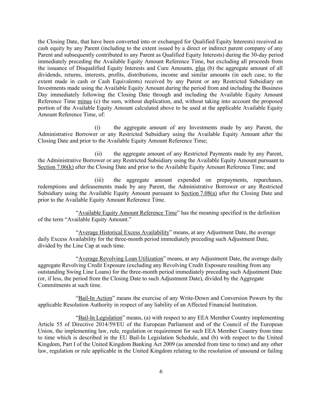 the Closing Date, that have been converted into or exchanged for Qualified Equity Interests) received as cash equity by any Parent (including to the extent issued by a direct or indirect parent company of any Parent and subsequently contributed to any Parent as Qualified Equity Interests) during the 30-day period immediately preceding the Available Equity Amount Reference Time, but excluding all proceeds from the issuance of Disqualified Equity Interests and Cure Amounts, plus (b) the aggregate amount of all dividends, returns, interests, profits, distributions, income and similar amounts (in each case, to the extent made in cash or Cash Equivalents) received by any Parent or any Restricted Subsidiary on Investments made using the Available Equity Amount during the period from and including the Business Day immediately following the Closing Date through and including the Available Equity Amount Reference Time minus (c) the sum, without duplication, and, without taking into account the proposed portion of the Available Equity Amount calculated above to be used at the applicable Available Equity Amount Reference Time, of: (i) the aggregate amount of any Investments made by any Parent, the Administrative Borrower or any Restricted Subsidiary using the Available Equity Amount after the Closing Date and prior to the Available Equity Amount Reference Time; (ii) the aggregate amount of any Restricted Payments made by any Parent, the Administrative Borrower or any Restricted Subsidiary using the Available Equity Amount pursuant to Section 7.06(k) after the Closing Date and prior to the Available Equity Amount Reference Time; and (iii) the aggregate amount expended on prepayments, repurchases, redemptions and defeasements made by any Parent, the Administrative Borrower or any Restricted Subsidiary using the Available Equity Amount pursuant to Section 7.08(a) after the Closing Date and prior to the Available Equity Amount Reference Time. “Available Equity Amount Reference Time” has the meaning specified in the definition of the term “Available Equity Amount.” “Average Historical Excess Availability” means, at any Adjustment Date, the average daily Excess Availability for the three-month period immediately preceding such Adjustment Date, divided by the Line Cap at such time. “Average Revolving Loan Utilization” means, at any Adjustment Date, the average daily aggregate Revolving Credit Exposure (excluding any Revolving Credit Exposure resulting from any outstanding Swing Line Loans) for the three-month period immediately preceding such Adjustment Date (or, if less, the period from the Closing Date to such Adjustment Date), divided by the Aggregate Commitments at such time. “Bail-In Action” means the exercise of any Write-Down and Conversion Powers by the applicable Resolution Authority in respect of any liability of an Affected Financial Institution. “Bail-In Legislation” means, (a) with respect to any EEA Member Country implementing Article 55 of Directive 2014/59/EU of the European Parliament and of the Council of the European Union, the implementing law, rule, regulation or requirement for such EEA Member Country from time to time which is described in the EU Bail-In Legislation Schedule, and (b) with respect to the United Kingdom, Part I of the United Kingdom Banking Act 2009 (as amended from time to time) and any other law, regulation or rule applicable in the United Kingdom relating to the resolution of unsound or failing 6