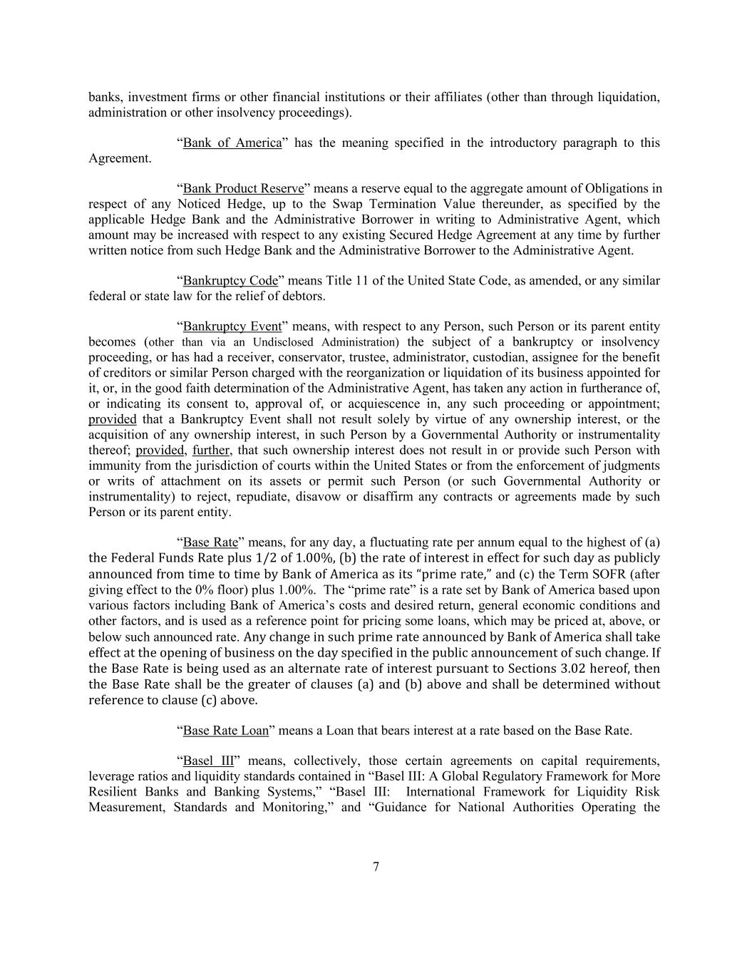 banks, investment firms or other financial institutions or their affiliates (other than through liquidation, administration or other insolvency proceedings). “Bank of America” has the meaning specified in the introductory paragraph to this Agreement. “Bank Product Reserve” means a reserve equal to the aggregate amount of Obligations in respect of any Noticed Hedge, up to the Swap Termination Value thereunder, as specified by the applicable Hedge Bank and the Administrative Borrower in writing to Administrative Agent, which amount may be increased with respect to any existing Secured Hedge Agreement at any time by further written notice from such Hedge Bank and the Administrative Borrower to the Administrative Agent. “Bankruptcy Code” means Title 11 of the United State Code, as amended, or any similar federal or state law for the relief of debtors. “Bankruptcy Event” means, with respect to any Person, such Person or its parent entity becomes (other than via an Undisclosed Administration) the subject of a bankruptcy or insolvency proceeding, or has had a receiver, conservator, trustee, administrator, custodian, assignee for the benefit of creditors or similar Person charged with the reorganization or liquidation of its business appointed for it, or, in the good faith determination of the Administrative Agent, has taken any action in furtherance of, or indicating its consent to, approval of, or acquiescence in, any such proceeding or appointment; provided that a Bankruptcy Event shall not result solely by virtue of any ownership interest, or the acquisition of any ownership interest, in such Person by a Governmental Authority or instrumentality thereof; provided, further, that such ownership interest does not result in or provide such Person with immunity from the jurisdiction of courts within the United States or from the enforcement of judgments or writs of attachment on its assets or permit such Person (or such Governmental Authority or instrumentality) to reject, repudiate, disavow or disaffirm any contracts or agreements made by such Person or its parent entity. “Base Rate” means, for any day, a fluctuating rate per annum equal to the highest of (a) the Federal Funds Rate plus 1/2 of 1.00%, (b) the rate of interest in effect for such day as publicly announced from time to time by Bank of America as its “prime rate,” and (c) the Term SOFR (after giving effect to the 0% floor) plus 1.00%. The “prime rate” is a rate set by Bank of America based upon various factors including Bank of America’s costs and desired return, general economic conditions and other factors, and is used as a reference point for pricing some loans, which may be priced at, above, or below such announced rate. Any change in such prime rate announced by Bank of America shall take effect at the opening of business on the day specified in the public announcement of such change. If the Base Rate is being used as an alternate rate of interest pursuant to Sections 3.02 hereof, then the Base Rate shall be the greater of clauses (a) and (b) above and shall be determined without reference to clause (c) above. “Base Rate Loan” means a Loan that bears interest at a rate based on the Base Rate. “Basel III” means, collectively, those certain agreements on capital requirements, leverage ratios and liquidity standards contained in “Basel III: A Global Regulatory Framework for More Resilient Banks and Banking Systems,” “Basel III: International Framework for Liquidity Risk Measurement, Standards and Monitoring,” and “Guidance for National Authorities Operating the 7