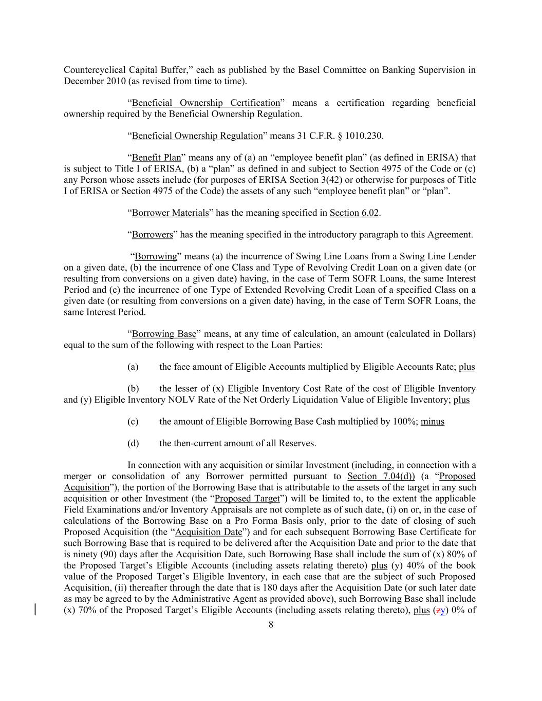 Countercyclical Capital Buffer,” each as published by the Basel Committee on Banking Supervision in December 2010 (as revised from time to time). “Beneficial Ownership Certification” means a certification regarding beneficial ownership required by the Beneficial Ownership Regulation. “Beneficial Ownership Regulation” means 31 C.F.R. § 1010.230. “Benefit Plan” means any of (a) an “employee benefit plan” (as defined in ERISA) that is subject to Title I of ERISA, (b) a “plan” as defined in and subject to Section 4975 of the Code or (c) any Person whose assets include (for purposes of ERISA Section 3(42) or otherwise for purposes of Title I of ERISA or Section 4975 of the Code) the assets of any such “employee benefit plan” or “plan”. “Borrower Materials” has the meaning specified in Section 6.02. “Borrowers” has the meaning specified in the introductory paragraph to this Agreement. “Borrowing” means (a) the incurrence of Swing Line Loans from a Swing Line Lender on a given date, (b) the incurrence of one Class and Type of Revolving Credit Loan on a given date (or resulting from conversions on a given date) having, in the case of Term SOFR Loans, the same Interest Period and (c) the incurrence of one Type of Extended Revolving Credit Loan of a specified Class on a given date (or resulting from conversions on a given date) having, in the case of Term SOFR Loans, the same Interest Period. “Borrowing Base” means, at any time of calculation, an amount (calculated in Dollars) equal to the sum of the following with respect to the Loan Parties: (a) the face amount of Eligible Accounts multiplied by Eligible Accounts Rate; plus (b) the lesser of (x) Eligible Inventory Cost Rate of the cost of Eligible Inventory and (y) Eligible Inventory NOLV Rate of the Net Orderly Liquidation Value of Eligible Inventory; plus (c) the amount of Eligible Borrowing Base Cash multiplied by 100%; minus (d) the then-current amount of all Reserves. In connection with any acquisition or similar Investment (including, in connection with a merger or consolidation of any Borrower permitted pursuant to Section 7.04(d)) (a “Proposed Acquisition”), the portion of the Borrowing Base that is attributable to the assets of the target in any such acquisition or other Investment (the “Proposed Target”) will be limited to, to the extent the applicable Field Examinations and/or Inventory Appraisals are not complete as of such date, (i) on or, in the case of calculations of the Borrowing Base on a Pro Forma Basis only, prior to the date of closing of such Proposed Acquisition (the “Acquisition Date”) and for each subsequent Borrowing Base Certificate for such Borrowing Base that is required to be delivered after the Acquisition Date and prior to the date that is ninety (90) days after the Acquisition Date, such Borrowing Base shall include the sum of (x) 80% of the Proposed Target’s Eligible Accounts (including assets relating thereto) plus (y) 40% of the book value of the Proposed Target’s Eligible Inventory, in each case that are the subject of such Proposed Acquisition, (ii) thereafter through the date that is 180 days after the Acquisition Date (or such later date as may be agreed to by the Administrative Agent as provided above), such Borrowing Base shall include (x) 70% of the Proposed Target’s Eligible Accounts (including assets relating thereto), plus (zy) 0% of 8