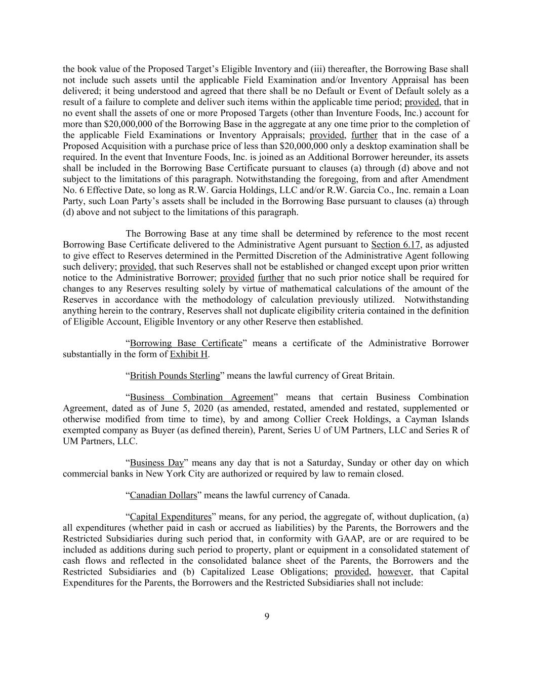 the book value of the Proposed Target’s Eligible Inventory and (iii) thereafter, the Borrowing Base shall not include such assets until the applicable Field Examination and/or Inventory Appraisal has been delivered; it being understood and agreed that there shall be no Default or Event of Default solely as a result of a failure to complete and deliver such items within the applicable time period; provided, that in no event shall the assets of one or more Proposed Targets (other than Inventure Foods, Inc.) account for more than $20,000,000 of the Borrowing Base in the aggregate at any one time prior to the completion of the applicable Field Examinations or Inventory Appraisals; provided, further that in the case of a Proposed Acquisition with a purchase price of less than $20,000,000 only a desktop examination shall be required. In the event that Inventure Foods, Inc. is joined as an Additional Borrower hereunder, its assets shall be included in the Borrowing Base Certificate pursuant to clauses (a) through (d) above and not subject to the limitations of this paragraph. Notwithstanding the foregoing, from and after Amendment No. 6 Effective Date, so long as R.W. Garcia Holdings, LLC and/or R.W. Garcia Co., Inc. remain a Loan Party, such Loan Party’s assets shall be included in the Borrowing Base pursuant to clauses (a) through (d) above and not subject to the limitations of this paragraph. The Borrowing Base at any time shall be determined by reference to the most recent Borrowing Base Certificate delivered to the Administrative Agent pursuant to Section 6.17, as adjusted to give effect to Reserves determined in the Permitted Discretion of the Administrative Agent following such delivery; provided, that such Reserves shall not be established or changed except upon prior written notice to the Administrative Borrower; provided further that no such prior notice shall be required for changes to any Reserves resulting solely by virtue of mathematical calculations of the amount of the Reserves in accordance with the methodology of calculation previously utilized. Notwithstanding anything herein to the contrary, Reserves shall not duplicate eligibility criteria contained in the definition of Eligible Account, Eligible Inventory or any other Reserve then established. “Borrowing Base Certificate” means a certificate of the Administrative Borrower substantially in the form of Exhibit H. “British Pounds Sterling” means the lawful currency of Great Britain. “Business Combination Agreement” means that certain Business Combination Agreement, dated as of June 5, 2020 (as amended, restated, amended and restated, supplemented or otherwise modified from time to time), by and among Collier Creek Holdings, a Cayman Islands exempted company as Buyer (as defined therein), Parent, Series U of UM Partners, LLC and Series R of UM Partners, LLC. “Business Day” means any day that is not a Saturday, Sunday or other day on which commercial banks in New York City are authorized or required by law to remain closed. “Canadian Dollars” means the lawful currency of Canada. “Capital Expenditures” means, for any period, the aggregate of, without duplication, (a) all expenditures (whether paid in cash or accrued as liabilities) by the Parents, the Borrowers and the Restricted Subsidiaries during such period that, in conformity with GAAP, are or are required to be included as additions during such period to property, plant or equipment in a consolidated statement of cash flows and reflected in the consolidated balance sheet of the Parents, the Borrowers and the Restricted Subsidiaries and (b) Capitalized Lease Obligations; provided, however, that Capital Expenditures for the Parents, the Borrowers and the Restricted Subsidiaries shall not include: 9