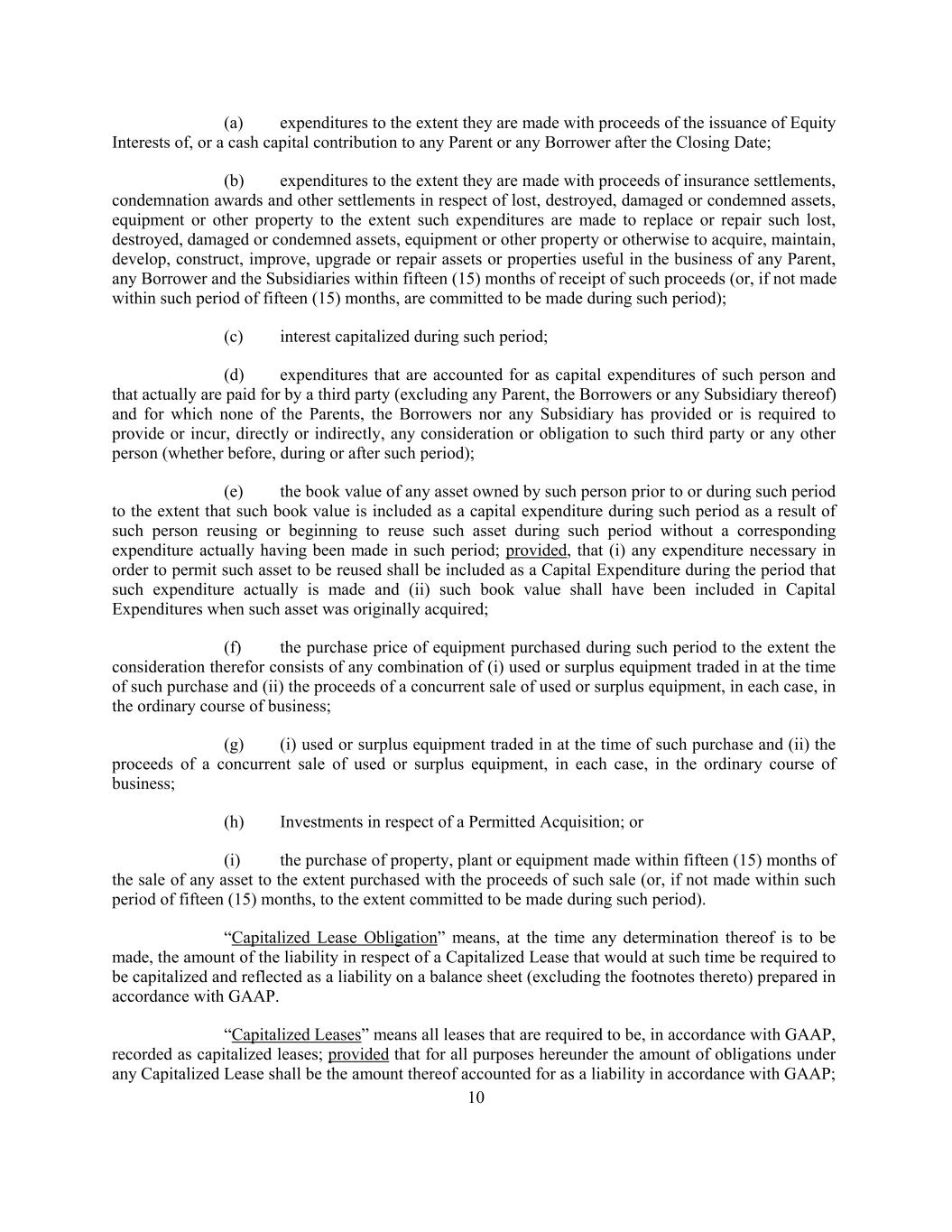 (a) expenditures to the extent they are made with proceeds of the issuance of Equity Interests of, or a cash capital contribution to any Parent or any Borrower after the Closing Date; (b) expenditures to the extent they are made with proceeds of insurance settlements, condemnation awards and other settlements in respect of lost, destroyed, damaged or condemned assets, equipment or other property to the extent such expenditures are made to replace or repair such lost, destroyed, damaged or condemned assets, equipment or other property or otherwise to acquire, maintain, develop, construct, improve, upgrade or repair assets or properties useful in the business of any Parent, any Borrower and the Subsidiaries within fifteen (15) months of receipt of such proceeds (or, if not made within such period of fifteen (15) months, are committed to be made during such period); (c) interest capitalized during such period; (d) expenditures that are accounted for as capital expenditures of such person and that actually are paid for by a third party (excluding any Parent, the Borrowers or any Subsidiary thereof) and for which none of the Parents, the Borrowers nor any Subsidiary has provided or is required to provide or incur, directly or indirectly, any consideration or obligation to such third party or any other person (whether before, during or after such period); (e) the book value of any asset owned by such person prior to or during such period to the extent that such book value is included as a capital expenditure during such period as a result of such person reusing or beginning to reuse such asset during such period without a corresponding expenditure actually having been made in such period; provided, that (i) any expenditure necessary in order to permit such asset to be reused shall be included as a Capital Expenditure during the period that such expenditure actually is made and (ii) such book value shall have been included in Capital Expenditures when such asset was originally acquired; (f) the purchase price of equipment purchased during such period to the extent the consideration therefor consists of any combination of (i) used or surplus equipment traded in at the time of such purchase and (ii) the proceeds of a concurrent sale of used or surplus equipment, in each case, in the ordinary course of business; (g) (i) used or surplus equipment traded in at the time of such purchase and (ii) the proceeds of a concurrent sale of used or surplus equipment, in each case, in the ordinary course of business; (h) Investments in respect of a Permitted Acquisition; or (i) the purchase of property, plant or equipment made within fifteen (15) months of the sale of any asset to the extent purchased with the proceeds of such sale (or, if not made within such period of fifteen (15) months, to the extent committed to be made during such period). “Capitalized Lease Obligation” means, at the time any determination thereof is to be made, the amount of the liability in respect of a Capitalized Lease that would at such time be required to be capitalized and reflected as a liability on a balance sheet (excluding the footnotes thereto) prepared in accordance with GAAP. “Capitalized Leases” means all leases that are required to be, in accordance with GAAP, recorded as capitalized leases; provided that for all purposes hereunder the amount of obligations under any Capitalized Lease shall be the amount thereof accounted for as a liability in accordance with GAAP; 10