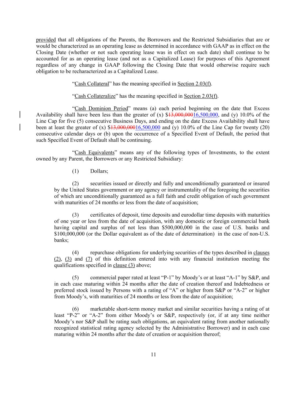 provided that all obligations of the Parents, the Borrowers and the Restricted Subsidiaries that are or would be characterized as an operating lease as determined in accordance with GAAP as in effect on the Closing Date (whether or not such operating lease was in effect on such date) shall continue to be accounted for as an operating lease (and not as a Capitalized Lease) for purposes of this Agreement regardless of any change in GAAP following the Closing Date that would otherwise require such obligation to be recharacterized as a Capitalized Lease. “Cash Collateral” has the meaning specified in Section 2.03(f). “Cash Collateralize” has the meaning specified in Section 2.03(f). “Cash Dominion Period” means (a) each period beginning on the date that Excess Availability shall have been less than the greater of (x) $13,000,00016,500,000, and (y) 10.0% of the Line Cap for five (5) consecutive Business Days, and ending on the date Excess Availability shall have been at least the greater of (x) $13,000,00016,500,000 and (y) 10.0% of the Line Cap for twenty (20) consecutive calendar days or (b) upon the occurrence of a Specified Event of Default, the period that such Specified Event of Default shall be continuing. “Cash Equivalents” means any of the following types of Investments, to the extent owned by any Parent, the Borrowers or any Restricted Subsidiary: (1) Dollars; (2) securities issued or directly and fully and unconditionally guaranteed or insured by the United States government or any agency or instrumentality of the foregoing the securities of which are unconditionally guaranteed as a full faith and credit obligation of such government with maturities of 24 months or less from the date of acquisition; (3) certificates of deposit, time deposits and eurodollar time deposits with maturities of one year or less from the date of acquisition, with any domestic or foreign commercial bank having capital and surplus of not less than $500,000,000 in the case of U.S. banks and $100,000,000 (or the Dollar equivalent as of the date of determination) in the case of non-U.S. banks; (4) repurchase obligations for underlying securities of the types described in clauses (2), (3) and (7) of this definition entered into with any financial institution meeting the qualifications specified in clause (3) above; (5) commercial paper rated at least “P-1” by Moody’s or at least “A-1” by S&P, and in each case maturing within 24 months after the date of creation thereof and Indebtedness or preferred stock issued by Persons with a rating of “A” or higher from S&P or “A-2” or higher from Moody’s, with maturities of 24 months or less from the date of acquisition; (6) marketable short-term money market and similar securities having a rating of at least “P-2” or “A-2” from either Moody’s or S&P, respectively (or, if at any time neither Moody’s nor S&P shall be rating such obligations, an equivalent rating from another nationally recognized statistical rating agency selected by the Administrative Borrower) and in each case maturing within 24 months after the date of creation or acquisition thereof; 11