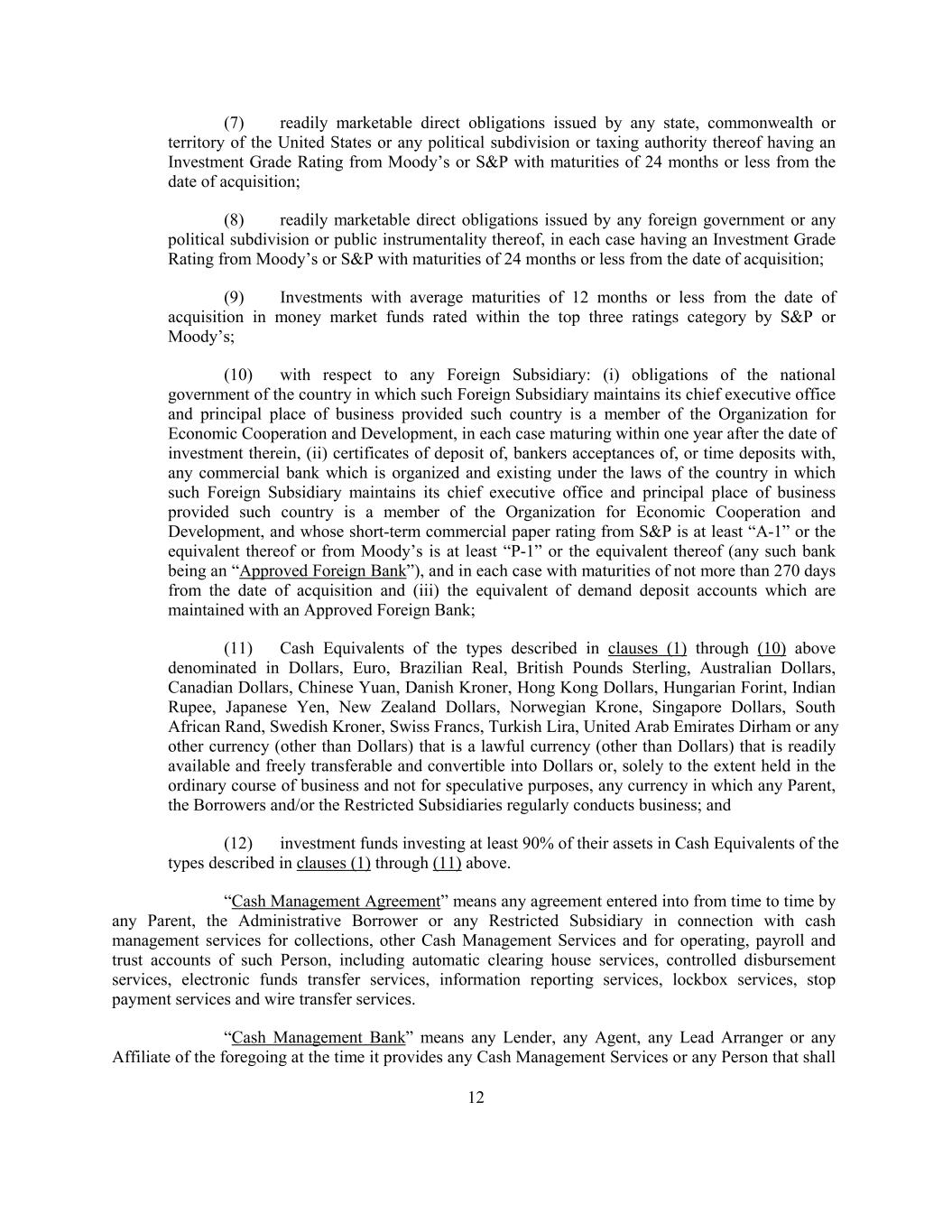 (7) readily marketable direct obligations issued by any state, commonwealth or territory of the United States or any political subdivision or taxing authority thereof having an Investment Grade Rating from Moody’s or S&P with maturities of 24 months or less from the date of acquisition; (8) readily marketable direct obligations issued by any foreign government or any political subdivision or public instrumentality thereof, in each case having an Investment Grade Rating from Moody’s or S&P with maturities of 24 months or less from the date of acquisition; (9) Investments with average maturities of 12 months or less from the date of acquisition in money market funds rated within the top three ratings category by S&P or Moody’s; (10) with respect to any Foreign Subsidiary: (i) obligations of the national government of the country in which such Foreign Subsidiary maintains its chief executive office and principal place of business provided such country is a member of the Organization for Economic Cooperation and Development, in each case maturing within one year after the date of investment therein, (ii) certificates of deposit of, bankers acceptances of, or time deposits with, any commercial bank which is organized and existing under the laws of the country in which such Foreign Subsidiary maintains its chief executive office and principal place of business provided such country is a member of the Organization for Economic Cooperation and Development, and whose short-term commercial paper rating from S&P is at least “A-1” or the equivalent thereof or from Moody’s is at least “P-1” or the equivalent thereof (any such bank being an “Approved Foreign Bank”), and in each case with maturities of not more than 270 days from the date of acquisition and (iii) the equivalent of demand deposit accounts which are maintained with an Approved Foreign Bank; (11) Cash Equivalents of the types described in clauses (1) through (10) above denominated in Dollars, Euro, Brazilian Real, British Pounds Sterling, Australian Dollars, Canadian Dollars, Chinese Yuan, Danish Kroner, Hong Kong Dollars, Hungarian Forint, Indian Rupee, Japanese Yen, New Zealand Dollars, Norwegian Krone, Singapore Dollars, South African Rand, Swedish Kroner, Swiss Francs, Turkish Lira, United Arab Emirates Dirham or any other currency (other than Dollars) that is a lawful currency (other than Dollars) that is readily available and freely transferable and convertible into Dollars or, solely to the extent held in the ordinary course of business and not for speculative purposes, any currency in which any Parent, the Borrowers and/or the Restricted Subsidiaries regularly conducts business; and (12) investment funds investing at least 90% of their assets in Cash Equivalents of the types described in clauses (1) through (11) above. “Cash Management Agreement” means any agreement entered into from time to time by any Parent, the Administrative Borrower or any Restricted Subsidiary in connection with cash management services for collections, other Cash Management Services and for operating, payroll and trust accounts of such Person, including automatic clearing house services, controlled disbursement services, electronic funds transfer services, information reporting services, lockbox services, stop payment services and wire transfer services. “Cash Management Bank” means any Lender, any Agent, any Lead Arranger or any Affiliate of the foregoing at the time it provides any Cash Management Services or any Person that shall 12