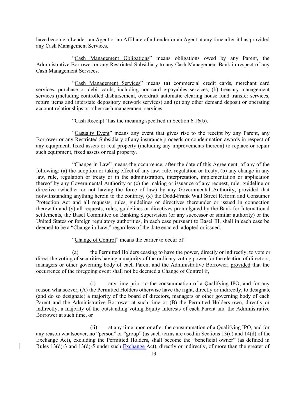 have become a Lender, an Agent or an Affiliate of a Lender or an Agent at any time after it has provided any Cash Management Services. “Cash Management Obligations” means obligations owed by any Parent, the Administrative Borrower or any Restricted Subsidiary to any Cash Management Bank in respect of any Cash Management Services. “Cash Management Services” means (a) commercial credit cards, merchant card services, purchase or debit cards, including non-card e-payables services, (b) treasury management services (including controlled disbursement, overdraft automatic clearing house fund transfer services, return items and interstate depository network services) and (c) any other demand deposit or operating account relationships or other cash management services. “Cash Receipt” has the meaning specified in Section 6.16(b). “Casualty Event” means any event that gives rise to the receipt by any Parent, any Borrower or any Restricted Subsidiary of any insurance proceeds or condemnation awards in respect of any equipment, fixed assets or real property (including any improvements thereon) to replace or repair such equipment, fixed assets or real property. “Change in Law” means the occurrence, after the date of this Agreement, of any of the following: (a) the adoption or taking effect of any law, rule, regulation or treaty, (b) any change in any law, rule, regulation or treaty or in the administration, interpretation, implementation or application thereof by any Governmental Authority or (c) the making or issuance of any request, rule, guideline or directive (whether or not having the force of law) by any Governmental Authority; provided that notwithstanding anything herein to the contrary, (x) the Dodd-Frank Wall Street Reform and Consumer Protection Act and all requests, rules, guidelines or directives thereunder or issued in connection therewith and (y) all requests, rules, guidelines or directives promulgated by the Bank for International settlements, the Basel Committee on Banking Supervision (or any successor or similar authority) or the United States or foreign regulatory authorities, in each case pursuant to Basel III, shall in each case be deemed to be a “Change in Law,” regardless of the date enacted, adopted or issued. “Change of Control” means the earlier to occur of: (a) the Permitted Holders ceasing to have the power, directly or indirectly, to vote or direct the voting of securities having a majority of the ordinary voting power for the election of directors, managers or other governing body of each Parent and the Administrative Borrower; provided that the occurrence of the foregoing event shall not be deemed a Change of Control if, (i) any time prior to the consummation of a Qualifying IPO, and for any reason whatsoever, (A) the Permitted Holders otherwise have the right, directly or indirectly, to designate (and do so designate) a majority of the board of directors, managers or other governing body of each Parent and the Administrative Borrower at such time or (B) the Permitted Holders own, directly or indirectly, a majority of the outstanding voting Equity Interests of each Parent and the Administrative Borrower at such time, or (ii) at any time upon or after the consummation of a Qualifying IPO, and for any reason whatsoever, no “person” or “group” (as such terms are used in Sections 13(d) and 14(d) of the Exchange Act), excluding the Permitted Holders, shall become the “beneficial owner” (as defined in Rules 13(d)-3 and 13(d)-5 under such Exchange Act), directly or indirectly, of more than the greater of 13