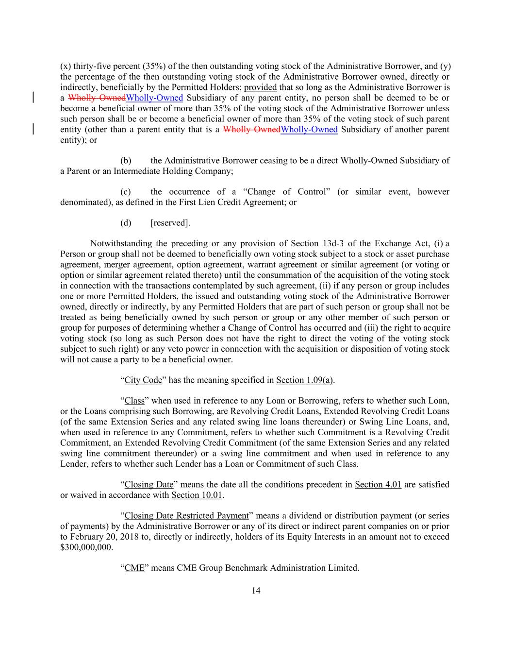 (x) thirty-five percent (35%) of the then outstanding voting stock of the Administrative Borrower, and (y) the percentage of the then outstanding voting stock of the Administrative Borrower owned, directly or indirectly, beneficially by the Permitted Holders; provided that so long as the Administrative Borrower is a Wholly OwnedWholly-Owned Subsidiary of any parent entity, no person shall be deemed to be or become a beneficial owner of more than 35% of the voting stock of the Administrative Borrower unless such person shall be or become a beneficial owner of more than 35% of the voting stock of such parent entity (other than a parent entity that is a Wholly OwnedWholly-Owned Subsidiary of another parent entity); or (b) the Administrative Borrower ceasing to be a direct Wholly-Owned Subsidiary of a Parent or an Intermediate Holding Company; (c) the occurrence of a “Change of Control” (or similar event, however denominated), as defined in the First Lien Credit Agreement; or (d) [reserved]. Notwithstanding the preceding or any provision of Section 13d-3 of the Exchange Act, (i) a Person or group shall not be deemed to beneficially own voting stock subject to a stock or asset purchase agreement, merger agreement, option agreement, warrant agreement or similar agreement (or voting or option or similar agreement related thereto) until the consummation of the acquisition of the voting stock in connection with the transactions contemplated by such agreement, (ii) if any person or group includes one or more Permitted Holders, the issued and outstanding voting stock of the Administrative Borrower owned, directly or indirectly, by any Permitted Holders that are part of such person or group shall not be treated as being beneficially owned by such person or group or any other member of such person or group for purposes of determining whether a Change of Control has occurred and (iii) the right to acquire voting stock (so long as such Person does not have the right to direct the voting of the voting stock subject to such right) or any veto power in connection with the acquisition or disposition of voting stock will not cause a party to be a beneficial owner. “City Code” has the meaning specified in Section 1.09(a). “Class” when used in reference to any Loan or Borrowing, refers to whether such Loan, or the Loans comprising such Borrowing, are Revolving Credit Loans, Extended Revolving Credit Loans (of the same Extension Series and any related swing line loans thereunder) or Swing Line Loans, and, when used in reference to any Commitment, refers to whether such Commitment is a Revolving Credit Commitment, an Extended Revolving Credit Commitment (of the same Extension Series and any related swing line commitment thereunder) or a swing line commitment and when used in reference to any Lender, refers to whether such Lender has a Loan or Commitment of such Class. “Closing Date” means the date all the conditions precedent in Section 4.01 are satisfied or waived in accordance with Section 10.01. “Closing Date Restricted Payment” means a dividend or distribution payment (or series of payments) by the Administrative Borrower or any of its direct or indirect parent companies on or prior to February 20, 2018 to, directly or indirectly, holders of its Equity Interests in an amount not to exceed $300,000,000. “CME” means CME Group Benchmark Administration Limited. 14
