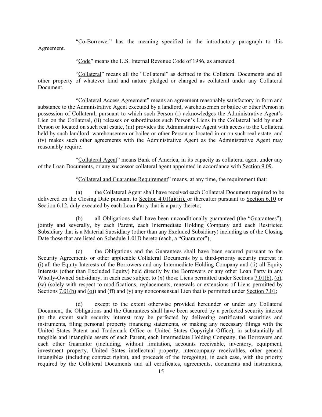 “Co-Borrower” has the meaning specified in the introductory paragraph to this Agreement. “Code” means the U.S. Internal Revenue Code of 1986, as amended. “Collateral” means all the “Collateral” as defined in the Collateral Documents and all other property of whatever kind and nature pledged or charged as collateral under any Collateral Document. “Collateral Access Agreement” means an agreement reasonably satisfactory in form and substance to the Administrative Agent executed by a landlord, warehousemen or bailee or other Person in possession of Collateral, pursuant to which such Person (i) acknowledges the Administrative Agent’s Lien on the Collateral, (ii) releases or subordinates such Person’s Liens in the Collateral held by such Person or located on such real estate, (iii) provides the Administrative Agent with access to the Collateral held by such landlord, warehousemen or bailee or other Person or located in or on such real estate, and (iv) makes such other agreements with the Administrative Agent as the Administrative Agent may reasonably require. “Collateral Agent” means Bank of America, in its capacity as collateral agent under any of the Loan Documents, or any successor collateral agent appointed in accordance with Section 9.09. “Collateral and Guarantee Requirement” means, at any time, the requirement that: (a) the Collateral Agent shall have received each Collateral Document required to be delivered on the Closing Date pursuant to Section 4.01(a)(iii), or thereafter pursuant to Section 6.10 or Section 6.12, duly executed by each Loan Party that is a party thereto; (b) all Obligations shall have been unconditionally guaranteed (the “Guarantees”), jointly and severally, by each Parent, each Intermediate Holding Company and each Restricted Subsidiary that is a Material Subsidiary (other than any Excluded Subsidiary) including as of the Closing Date those that are listed on Schedule 1.01D hereto (each, a “Guarantor”); (c) the Obligations and the Guarantees shall have been secured pursuant to the Security Agreements or other applicable Collateral Documents by a third-priority security interest in (i) all the Equity Interests of the Borrowers and any Intermediate Holding Company and (ii) all Equity Interests (other than Excluded Equity) held directly by the Borrowers or any other Loan Party in any Wholly-Owned Subsidiary, in each case subject to (x) those Liens permitted under Sections 7.01(b), (o), (w) (solely with respect to modifications, replacements, renewals or extensions of Liens permitted by Sections 7.01(b) and (o)) and (ff) and (y) any nonconsensual Lien that is permitted under Section 7.01; (d) except to the extent otherwise provided hereunder or under any Collateral Document, the Obligations and the Guarantees shall have been secured by a perfected security interest (to the extent such security interest may be perfected by delivering certificated securities and instruments, filing personal property financing statements, or making any necessary filings with the United States Patent and Trademark Office or United States Copyright Office), in substantially all tangible and intangible assets of each Parent, each Intermediate Holding Company, the Borrowers and each other Guarantor (including, without limitation, accounts receivable, inventory, equipment, investment property, United States intellectual property, intercompany receivables, other general intangibles (including contract rights), and proceeds of the foregoing), in each case, with the priority required by the Collateral Documents and all certificates, agreements, documents and instruments, 15