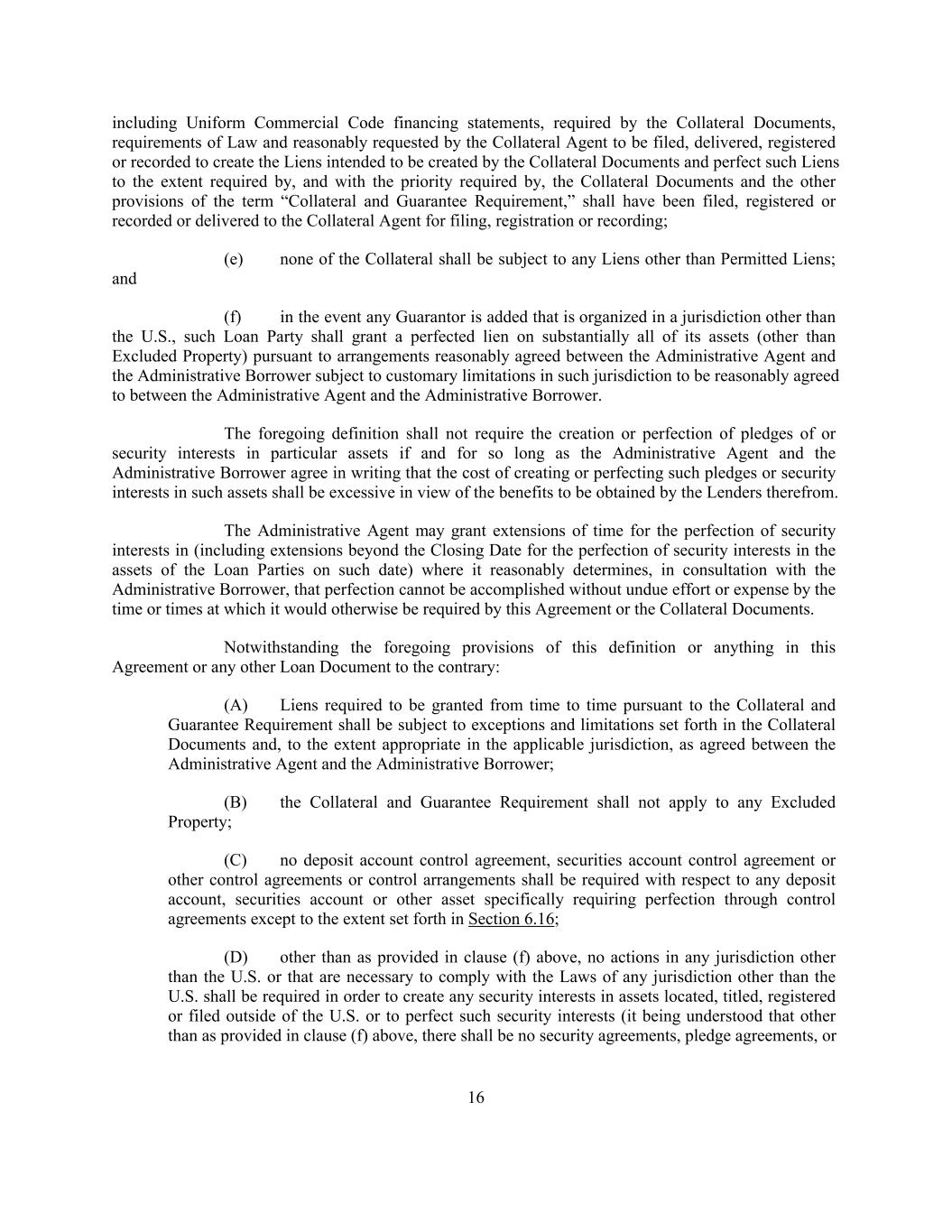 including Uniform Commercial Code financing statements, required by the Collateral Documents, requirements of Law and reasonably requested by the Collateral Agent to be filed, delivered, registered or recorded to create the Liens intended to be created by the Collateral Documents and perfect such Liens to the extent required by, and with the priority required by, the Collateral Documents and the other provisions of the term “Collateral and Guarantee Requirement,” shall have been filed, registered or recorded or delivered to the Collateral Agent for filing, registration or recording; (e) none of the Collateral shall be subject to any Liens other than Permitted Liens; and (f) in the event any Guarantor is added that is organized in a jurisdiction other than the U.S., such Loan Party shall grant a perfected lien on substantially all of its assets (other than Excluded Property) pursuant to arrangements reasonably agreed between the Administrative Agent and the Administrative Borrower subject to customary limitations in such jurisdiction to be reasonably agreed to between the Administrative Agent and the Administrative Borrower. The foregoing definition shall not require the creation or perfection of pledges of or security interests in particular assets if and for so long as the Administrative Agent and the Administrative Borrower agree in writing that the cost of creating or perfecting such pledges or security interests in such assets shall be excessive in view of the benefits to be obtained by the Lenders therefrom. The Administrative Agent may grant extensions of time for the perfection of security interests in (including extensions beyond the Closing Date for the perfection of security interests in the assets of the Loan Parties on such date) where it reasonably determines, in consultation with the Administrative Borrower, that perfection cannot be accomplished without undue effort or expense by the time or times at which it would otherwise be required by this Agreement or the Collateral Documents. Notwithstanding the foregoing provisions of this definition or anything in this Agreement or any other Loan Document to the contrary: (A) Liens required to be granted from time to time pursuant to the Collateral and Guarantee Requirement shall be subject to exceptions and limitations set forth in the Collateral Documents and, to the extent appropriate in the applicable jurisdiction, as agreed between the Administrative Agent and the Administrative Borrower; (B) the Collateral and Guarantee Requirement shall not apply to any Excluded Property; (C) no deposit account control agreement, securities account control agreement or other control agreements or control arrangements shall be required with respect to any deposit account, securities account or other asset specifically requiring perfection through control agreements except to the extent set forth in Section 6.16; (D) other than as provided in clause (f) above, no actions in any jurisdiction other than the U.S. or that are necessary to comply with the Laws of any jurisdiction other than the U.S. shall be required in order to create any security interests in assets located, titled, registered or filed outside of the U.S. or to perfect such security interests (it being understood that other than as provided in clause (f) above, there shall be no security agreements, pledge agreements, or 16