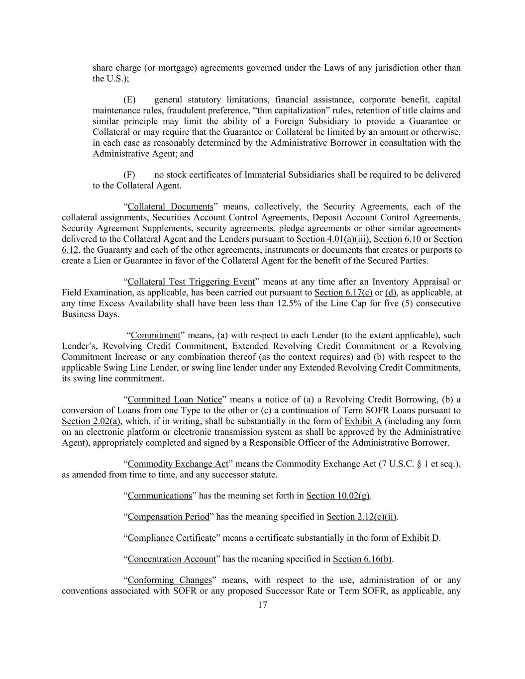 share charge (or mortgage) agreements governed under the Laws of any jurisdiction other than the U.S.); (E) general statutory limitations, financial assistance, corporate benefit, capital maintenance rules, fraudulent preference, “thin capitalization” rules, retention of title claims and similar principle may limit the ability of a Foreign Subsidiary to provide a Guarantee or Collateral or may require that the Guarantee or Collateral be limited by an amount or otherwise, in each case as reasonably determined by the Administrative Borrower in consultation with the Administrative Agent; and (F) no stock certificates of Immaterial Subsidiaries shall be required to be delivered to the Collateral Agent. “Collateral Documents” means, collectively, the Security Agreements, each of the collateral assignments, Securities Account Control Agreements, Deposit Account Control Agreements, Security Agreement Supplements, security agreements, pledge agreements or other similar agreements delivered to the Collateral Agent and the Lenders pursuant to Section 4.01(a)(iii), Section 6.10 or Section 6.12, the Guaranty and each of the other agreements, instruments or documents that creates or purports to create a Lien or Guarantee in favor of the Collateral Agent for the benefit of the Secured Parties. “Collateral Test Triggering Event” means at any time after an Inventory Appraisal or Field Examination, as applicable, has been carried out pursuant to Section 6.17(c) or (d), as applicable, at any time Excess Availability shall have been less than 12.5% of the Line Cap for five (5) consecutive Business Days. “Commitment” means, (a) with respect to each Lender (to the extent applicable), such Lender’s, Revolving Credit Commitment, Extended Revolving Credit Commitment or a Revolving Commitment Increase or any combination thereof (as the context requires) and (b) with respect to the applicable Swing Line Lender, or swing line lender under any Extended Revolving Credit Commitments, its swing line commitment. “Committed Loan Notice” means a notice of (a) a Revolving Credit Borrowing, (b) a conversion of Loans from one Type to the other or (c) a continuation of Term SOFR Loans pursuant to Section 2.02(a), which, if in writing, shall be substantially in the form of Exhibit A (including any form on an electronic platform or electronic transmission system as shall be approved by the Administrative Agent), appropriately completed and signed by a Responsible Officer of the Administrative Borrower. “Commodity Exchange Act” means the Commodity Exchange Act (7 U.S.C. § 1 et seq.), as amended from time to time, and any successor statute. “Communications” has the meaning set forth in Section 10.02(g). “Compensation Period” has the meaning specified in Section 2.12(c)(ii). “Compliance Certificate” means a certificate substantially in the form of Exhibit D. “Concentration Account” has the meaning specified in Section 6.16(b). “Conforming Changes” means, with respect to the use, administration of or any conventions associated with SOFR or any proposed Successor Rate or Term SOFR, as applicable, any 17