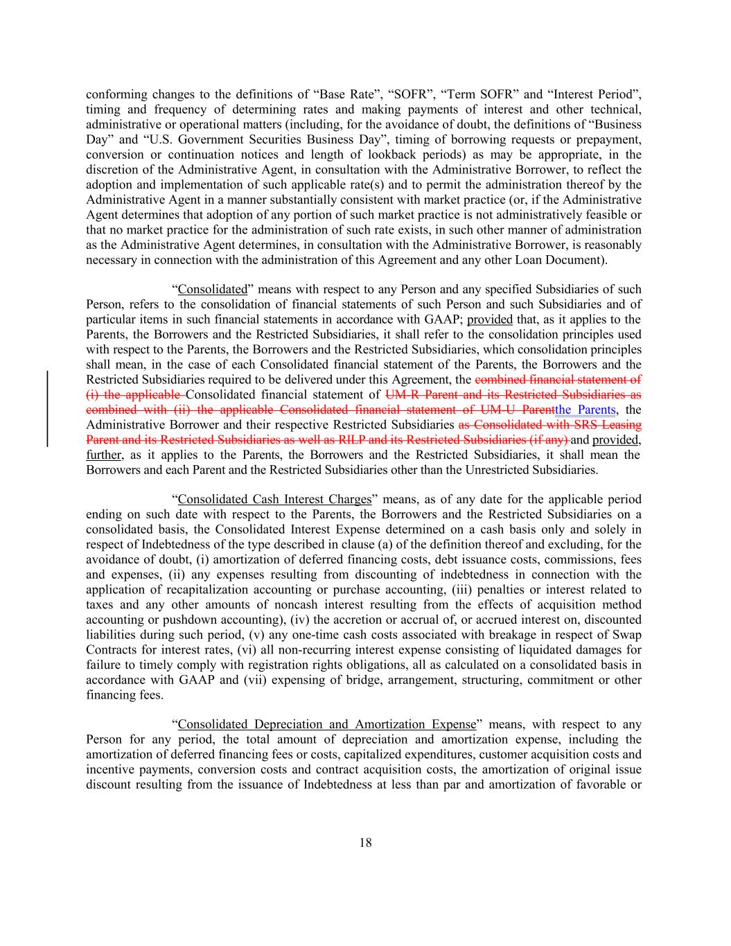 conforming changes to the definitions of “Base Rate”, “SOFR”, “Term SOFR” and “Interest Period”, timing and frequency of determining rates and making payments of interest and other technical, administrative or operational matters (including, for the avoidance of doubt, the definitions of “Business Day” and “U.S. Government Securities Business Day”, timing of borrowing requests or prepayment, conversion or continuation notices and length of lookback periods) as may be appropriate, in the discretion of the Administrative Agent, in consultation with the Administrative Borrower, to reflect the adoption and implementation of such applicable rate(s) and to permit the administration thereof by the Administrative Agent in a manner substantially consistent with market practice (or, if the Administrative Agent determines that adoption of any portion of such market practice is not administratively feasible or that no market practice for the administration of such rate exists, in such other manner of administration as the Administrative Agent determines, in consultation with the Administrative Borrower, is reasonably necessary in connection with the administration of this Agreement and any other Loan Document). “Consolidated” means with respect to any Person and any specified Subsidiaries of such Person, refers to the consolidation of financial statements of such Person and such Subsidiaries and of particular items in such financial statements in accordance with GAAP; provided that, as it applies to the Parents, the Borrowers and the Restricted Subsidiaries, it shall refer to the consolidation principles used with respect to the Parents, the Borrowers and the Restricted Subsidiaries, which consolidation principles shall mean, in the case of each Consolidated financial statement of the Parents, the Borrowers and the Restricted Subsidiaries required to be delivered under this Agreement, the combined financial statement of (i) the applicable Consolidated financial statement of UM-R Parent and its Restricted Subsidiaries as combined with (ii) the applicable Consolidated financial statement of UM-U Parentthe Parents, the Administrative Borrower and their respective Restricted Subsidiaries as Consolidated with SRS Leasing Parent and its Restricted Subsidiaries as well as RILP and its Restricted Subsidiaries (if any) and provided, further, as it applies to the Parents, the Borrowers and the Restricted Subsidiaries, it shall mean the Borrowers and each Parent and the Restricted Subsidiaries other than the Unrestricted Subsidiaries. “Consolidated Cash Interest Charges” means, as of any date for the applicable period ending on such date with respect to the Parents, the Borrowers and the Restricted Subsidiaries on a consolidated basis, the Consolidated Interest Expense determined on a cash basis only and solely in respect of Indebtedness of the type described in clause (a) of the definition thereof and excluding, for the avoidance of doubt, (i) amortization of deferred financing costs, debt issuance costs, commissions, fees and expenses, (ii) any expenses resulting from discounting of indebtedness in connection with the application of recapitalization accounting or purchase accounting, (iii) penalties or interest related to taxes and any other amounts of noncash interest resulting from the effects of acquisition method accounting or pushdown accounting), (iv) the accretion or accrual of, or accrued interest on, discounted liabilities during such period, (v) any one-time cash costs associated with breakage in respect of Swap Contracts for interest rates, (vi) all non-recurring interest expense consisting of liquidated damages for failure to timely comply with registration rights obligations, all as calculated on a consolidated basis in accordance with GAAP and (vii) expensing of bridge, arrangement, structuring, commitment or other financing fees. “Consolidated Depreciation and Amortization Expense” means, with respect to any Person for any period, the total amount of depreciation and amortization expense, including the amortization of deferred financing fees or costs, capitalized expenditures, customer acquisition costs and incentive payments, conversion costs and contract acquisition costs, the amortization of original issue discount resulting from the issuance of Indebtedness at less than par and amortization of favorable or 18