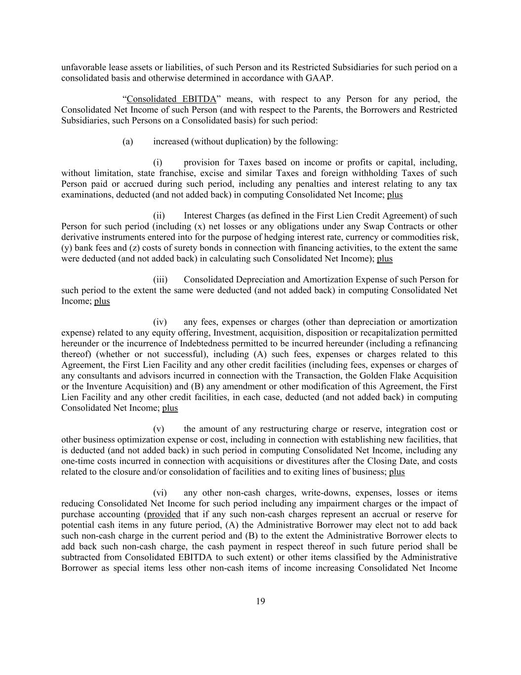 unfavorable lease assets or liabilities, of such Person and its Restricted Subsidiaries for such period on a consolidated basis and otherwise determined in accordance with GAAP. “Consolidated EBITDA” means, with respect to any Person for any period, the Consolidated Net Income of such Person (and with respect to the Parents, the Borrowers and Restricted Subsidiaries, such Persons on a Consolidated basis) for such period: (a) increased (without duplication) by the following: (i) provision for Taxes based on income or profits or capital, including, without limitation, state franchise, excise and similar Taxes and foreign withholding Taxes of such Person paid or accrued during such period, including any penalties and interest relating to any tax examinations, deducted (and not added back) in computing Consolidated Net Income; plus (ii) Interest Charges (as defined in the First Lien Credit Agreement) of such Person for such period (including (x) net losses or any obligations under any Swap Contracts or other derivative instruments entered into for the purpose of hedging interest rate, currency or commodities risk, (y) bank fees and (z) costs of surety bonds in connection with financing activities, to the extent the same were deducted (and not added back) in calculating such Consolidated Net Income); plus (iii) Consolidated Depreciation and Amortization Expense of such Person for such period to the extent the same were deducted (and not added back) in computing Consolidated Net Income; plus (iv) any fees, expenses or charges (other than depreciation or amortization expense) related to any equity offering, Investment, acquisition, disposition or recapitalization permitted hereunder or the incurrence of Indebtedness permitted to be incurred hereunder (including a refinancing thereof) (whether or not successful), including (A) such fees, expenses or charges related to this Agreement, the First Lien Facility and any other credit facilities (including fees, expenses or charges of any consultants and advisors incurred in connection with the Transaction, the Golden Flake Acquisition or the Inventure Acquisition) and (B) any amendment or other modification of this Agreement, the First Lien Facility and any other credit facilities, in each case, deducted (and not added back) in computing Consolidated Net Income; plus (v) the amount of any restructuring charge or reserve, integration cost or other business optimization expense or cost, including in connection with establishing new facilities, that is deducted (and not added back) in such period in computing Consolidated Net Income, including any one-time costs incurred in connection with acquisitions or divestitures after the Closing Date, and costs related to the closure and/or consolidation of facilities and to exiting lines of business; plus (vi) any other non-cash charges, write-downs, expenses, losses or items reducing Consolidated Net Income for such period including any impairment charges or the impact of purchase accounting (provided that if any such non-cash charges represent an accrual or reserve for potential cash items in any future period, (A) the Administrative Borrower may elect not to add back such non-cash charge in the current period and (B) to the extent the Administrative Borrower elects to add back such non-cash charge, the cash payment in respect thereof in such future period shall be subtracted from Consolidated EBITDA to such extent) or other items classified by the Administrative Borrower as special items less other non-cash items of income increasing Consolidated Net Income 19
