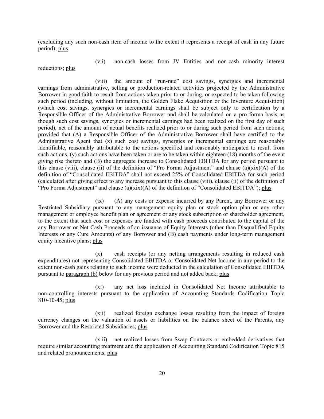 (excluding any such non-cash item of income to the extent it represents a receipt of cash in any future period); plus (vii) non-cash losses from JV Entities and non-cash minority interest reductions; plus (viii) the amount of “run-rate” cost savings, synergies and incremental earnings from administrative, selling or production-related activities projected by the Administrative Borrower in good faith to result from actions taken prior to or during, or expected to be taken following such period (including, without limitation, the Golden Flake Acquisition or the Inventure Acquisition) (which cost savings, synergies or incremental earnings shall be subject only to certification by a Responsible Officer of the Administrative Borrower and shall be calculated on a pro forma basis as though such cost savings, synergies or incremental earnings had been realized on the first day of such period), net of the amount of actual benefits realized prior to or during such period from such actions; provided that (A) a Responsible Officer of the Administrative Borrower shall have certified to the Administrative Agent that (x) such cost savings, synergies or incremental earnings are reasonably identifiable, reasonably attributable to the actions specified and reasonably anticipated to result from such actions, (y) such actions have been taken or are to be taken within eighteen (18) months of the event giving rise thereto and (B) the aggregate increase to Consolidated EBITDA for any period pursuant to this clause (viii), clause (ii) of the definition of “Pro Forma Adjustment” and clause (a)(xix)(A) of the definition of “Consolidated EBITDA” shall not exceed 25% of Consolidated EBITDA for such period (calculated after giving effect to any increase pursuant to this clause (viii), clause (ii) of the definition of “Pro Forma Adjustment” and clause (a)(xix)(A) of the definition of “Consolidated EBITDA”); plus (ix) (A) any costs or expense incurred by any Parent, any Borrower or any Restricted Subsidiary pursuant to any management equity plan or stock option plan or any other management or employee benefit plan or agreement or any stock subscription or shareholder agreement, to the extent that such cost or expenses are funded with cash proceeds contributed to the capital of the any Borrower or Net Cash Proceeds of an issuance of Equity Interests (other than Disqualified Equity Interests or any Cure Amounts) of any Borrower and (B) cash payments under long-term management equity incentive plans; plus (x) cash receipts (or any netting arrangements resulting in reduced cash expenditures) not representing Consolidated EBITDA or Consolidated Net Income in any period to the extent non-cash gains relating to such income were deducted in the calculation of Consolidated EBITDA pursuant to paragraph (b) below for any previous period and not added back; plus (xi) any net loss included in Consolidated Net Income attributable to non-controlling interests pursuant to the application of Accounting Standards Codification Topic 810-10-45; plus (xii) realized foreign exchange losses resulting from the impact of foreign currency changes on the valuation of assets or liabilities on the balance sheet of the Parents, any Borrower and the Restricted Subsidiaries; plus (xiii) net realized losses from Swap Contracts or embedded derivatives that require similar accounting treatment and the application of Accounting Standard Codification Topic 815 and related pronouncements; plus 20