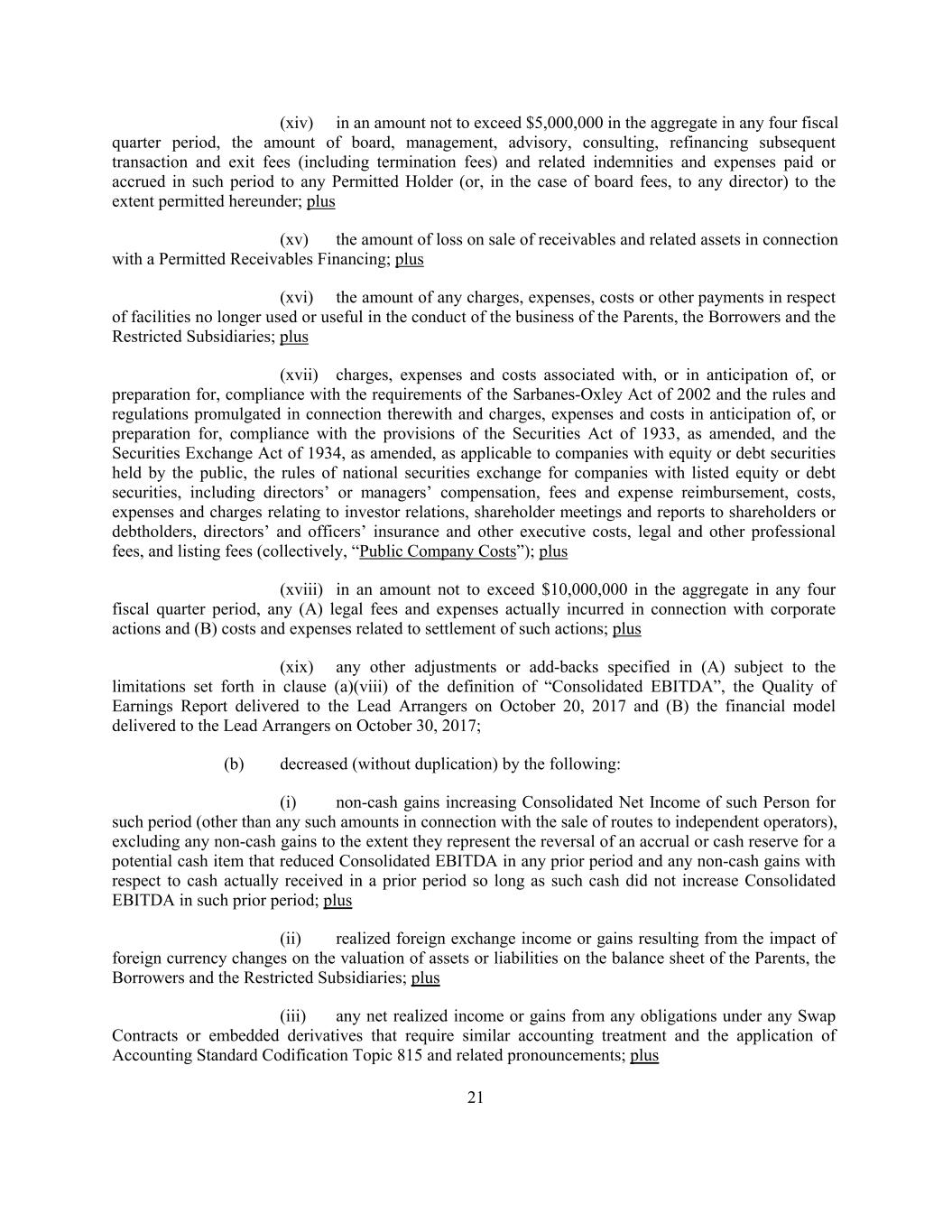 (xiv) in an amount not to exceed $5,000,000 in the aggregate in any four fiscal quarter period, the amount of board, management, advisory, consulting, refinancing subsequent transaction and exit fees (including termination fees) and related indemnities and expenses paid or accrued in such period to any Permitted Holder (or, in the case of board fees, to any director) to the extent permitted hereunder; plus (xv) the amount of loss on sale of receivables and related assets in connection with a Permitted Receivables Financing; plus (xvi) the amount of any charges, expenses, costs or other payments in respect of facilities no longer used or useful in the conduct of the business of the Parents, the Borrowers and the Restricted Subsidiaries; plus (xvii) charges, expenses and costs associated with, or in anticipation of, or preparation for, compliance with the requirements of the Sarbanes-Oxley Act of 2002 and the rules and regulations promulgated in connection therewith and charges, expenses and costs in anticipation of, or preparation for, compliance with the provisions of the Securities Act of 1933, as amended, and the Securities Exchange Act of 1934, as amended, as applicable to companies with equity or debt securities held by the public, the rules of national securities exchange for companies with listed equity or debt securities, including directors’ or managers’ compensation, fees and expense reimbursement, costs, expenses and charges relating to investor relations, shareholder meetings and reports to shareholders or debtholders, directors’ and officers’ insurance and other executive costs, legal and other professional fees, and listing fees (collectively, “Public Company Costs”); plus (xviii) in an amount not to exceed $10,000,000 in the aggregate in any four fiscal quarter period, any (A) legal fees and expenses actually incurred in connection with corporate actions and (B) costs and expenses related to settlement of such actions; plus (xix) any other adjustments or add-backs specified in (A) subject to the limitations set forth in clause (a)(viii) of the definition of “Consolidated EBITDA”, the Quality of Earnings Report delivered to the Lead Arrangers on October 20, 2017 and (B) the financial model delivered to the Lead Arrangers on October 30, 2017; (b) decreased (without duplication) by the following: (i) non-cash gains increasing Consolidated Net Income of such Person for such period (other than any such amounts in connection with the sale of routes to independent operators), excluding any non-cash gains to the extent they represent the reversal of an accrual or cash reserve for a potential cash item that reduced Consolidated EBITDA in any prior period and any non-cash gains with respect to cash actually received in a prior period so long as such cash did not increase Consolidated EBITDA in such prior period; plus (ii) realized foreign exchange income or gains resulting from the impact of foreign currency changes on the valuation of assets or liabilities on the balance sheet of the Parents, the Borrowers and the Restricted Subsidiaries; plus (iii) any net realized income or gains from any obligations under any Swap Contracts or embedded derivatives that require similar accounting treatment and the application of Accounting Standard Codification Topic 815 and related pronouncements; plus 21