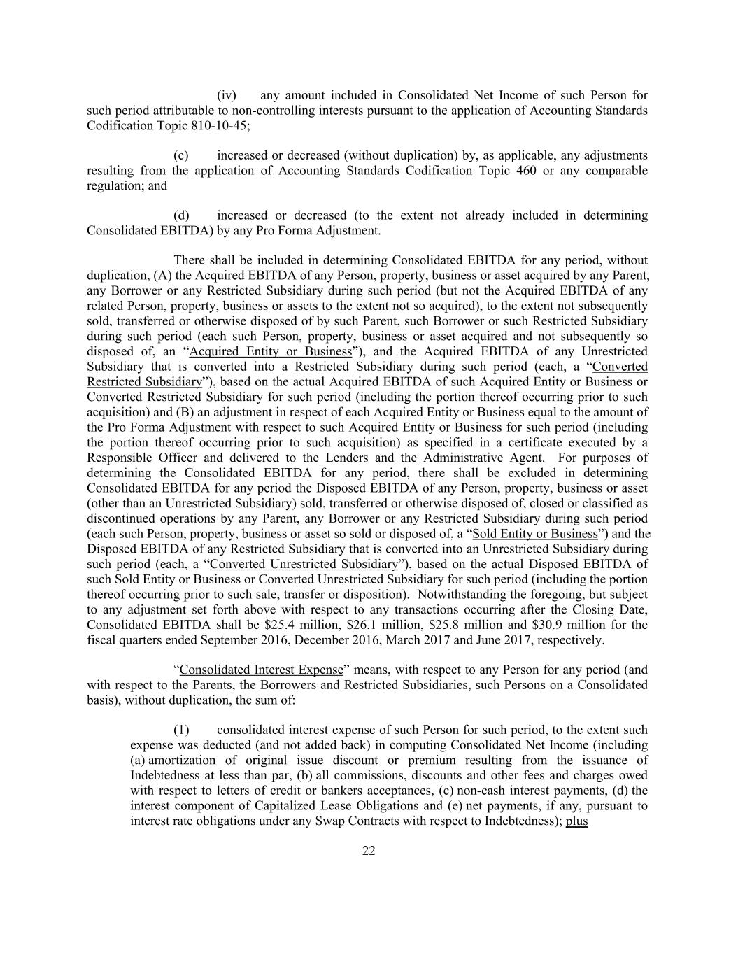 (iv) any amount included in Consolidated Net Income of such Person for such period attributable to non-controlling interests pursuant to the application of Accounting Standards Codification Topic 810-10-45; (c) increased or decreased (without duplication) by, as applicable, any adjustments resulting from the application of Accounting Standards Codification Topic 460 or any comparable regulation; and (d) increased or decreased (to the extent not already included in determining Consolidated EBITDA) by any Pro Forma Adjustment. There shall be included in determining Consolidated EBITDA for any period, without duplication, (A) the Acquired EBITDA of any Person, property, business or asset acquired by any Parent, any Borrower or any Restricted Subsidiary during such period (but not the Acquired EBITDA of any related Person, property, business or assets to the extent not so acquired), to the extent not subsequently sold, transferred or otherwise disposed of by such Parent, such Borrower or such Restricted Subsidiary during such period (each such Person, property, business or asset acquired and not subsequently so disposed of, an “Acquired Entity or Business”), and the Acquired EBITDA of any Unrestricted Subsidiary that is converted into a Restricted Subsidiary during such period (each, a “Converted Restricted Subsidiary”), based on the actual Acquired EBITDA of such Acquired Entity or Business or Converted Restricted Subsidiary for such period (including the portion thereof occurring prior to such acquisition) and (B) an adjustment in respect of each Acquired Entity or Business equal to the amount of the Pro Forma Adjustment with respect to such Acquired Entity or Business for such period (including the portion thereof occurring prior to such acquisition) as specified in a certificate executed by a Responsible Officer and delivered to the Lenders and the Administrative Agent. For purposes of determining the Consolidated EBITDA for any period, there shall be excluded in determining Consolidated EBITDA for any period the Disposed EBITDA of any Person, property, business or asset (other than an Unrestricted Subsidiary) sold, transferred or otherwise disposed of, closed or classified as discontinued operations by any Parent, any Borrower or any Restricted Subsidiary during such period (each such Person, property, business or asset so sold or disposed of, a “Sold Entity or Business”) and the Disposed EBITDA of any Restricted Subsidiary that is converted into an Unrestricted Subsidiary during such period (each, a “Converted Unrestricted Subsidiary”), based on the actual Disposed EBITDA of such Sold Entity or Business or Converted Unrestricted Subsidiary for such period (including the portion thereof occurring prior to such sale, transfer or disposition). Notwithstanding the foregoing, but subject to any adjustment set forth above with respect to any transactions occurring after the Closing Date, Consolidated EBITDA shall be $25.4 million, $26.1 million, $25.8 million and $30.9 million for the fiscal quarters ended September 2016, December 2016, March 2017 and June 2017, respectively. “Consolidated Interest Expense” means, with respect to any Person for any period (and with respect to the Parents, the Borrowers and Restricted Subsidiaries, such Persons on a Consolidated basis), without duplication, the sum of: (1) consolidated interest expense of such Person for such period, to the extent such expense was deducted (and not added back) in computing Consolidated Net Income (including (a) amortization of original issue discount or premium resulting from the issuance of Indebtedness at less than par, (b) all commissions, discounts and other fees and charges owed with respect to letters of credit or bankers acceptances, (c) non-cash interest payments, (d) the interest component of Capitalized Lease Obligations and (e) net payments, if any, pursuant to interest rate obligations under any Swap Contracts with respect to Indebtedness); plus 22
