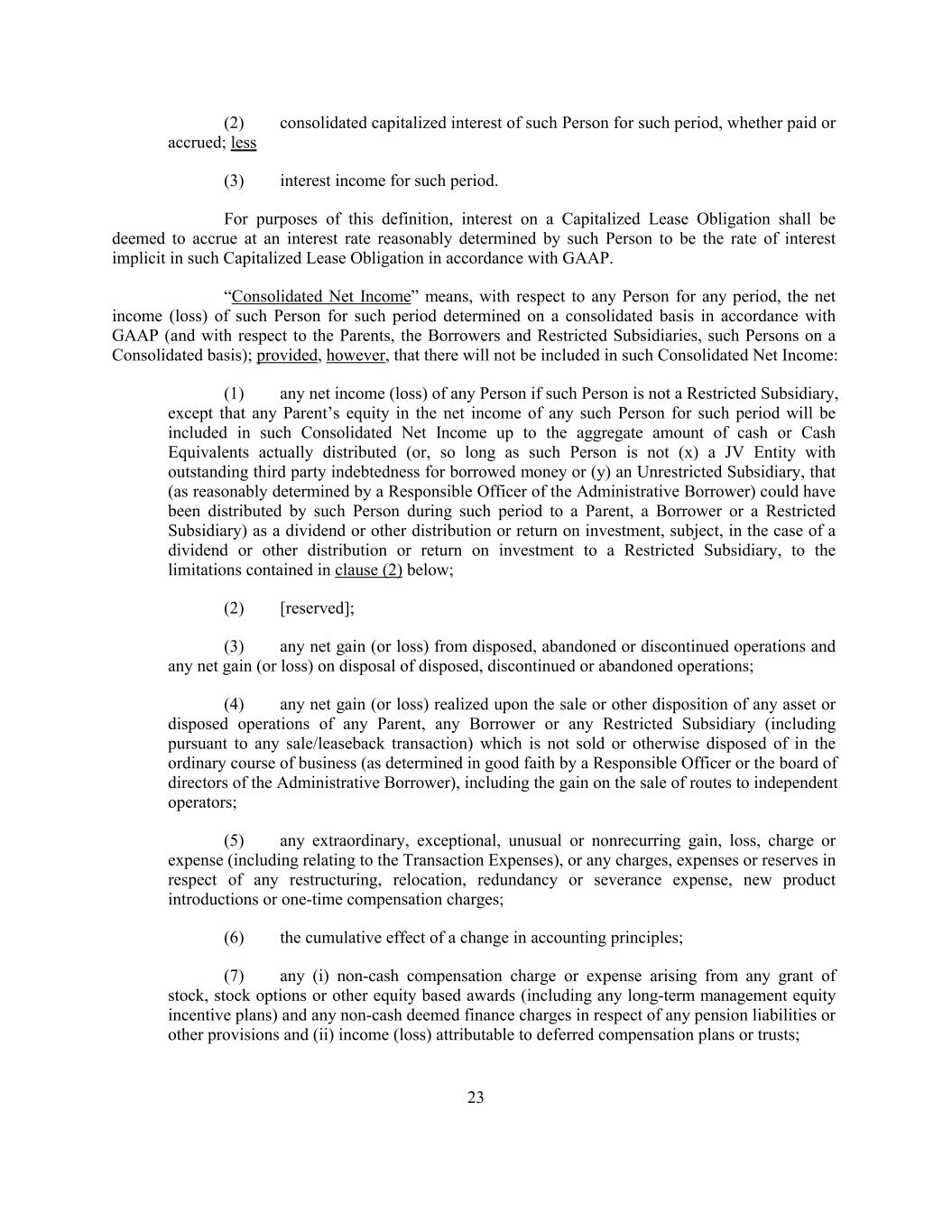 (2) consolidated capitalized interest of such Person for such period, whether paid or accrued; less (3) interest income for such period. For purposes of this definition, interest on a Capitalized Lease Obligation shall be deemed to accrue at an interest rate reasonably determined by such Person to be the rate of interest implicit in such Capitalized Lease Obligation in accordance with GAAP. “Consolidated Net Income” means, with respect to any Person for any period, the net income (loss) of such Person for such period determined on a consolidated basis in accordance with GAAP (and with respect to the Parents, the Borrowers and Restricted Subsidiaries, such Persons on a Consolidated basis); provided, however, that there will not be included in such Consolidated Net Income: (1) any net income (loss) of any Person if such Person is not a Restricted Subsidiary, except that any Parent’s equity in the net income of any such Person for such period will be included in such Consolidated Net Income up to the aggregate amount of cash or Cash Equivalents actually distributed (or, so long as such Person is not (x) a JV Entity with outstanding third party indebtedness for borrowed money or (y) an Unrestricted Subsidiary, that (as reasonably determined by a Responsible Officer of the Administrative Borrower) could have been distributed by such Person during such period to a Parent, a Borrower or a Restricted Subsidiary) as a dividend or other distribution or return on investment, subject, in the case of a dividend or other distribution or return on investment to a Restricted Subsidiary, to the limitations contained in clause (2) below; (2) [reserved]; (3) any net gain (or loss) from disposed, abandoned or discontinued operations and any net gain (or loss) on disposal of disposed, discontinued or abandoned operations; (4) any net gain (or loss) realized upon the sale or other disposition of any asset or disposed operations of any Parent, any Borrower or any Restricted Subsidiary (including pursuant to any sale/leaseback transaction) which is not sold or otherwise disposed of in the ordinary course of business (as determined in good faith by a Responsible Officer or the board of directors of the Administrative Borrower), including the gain on the sale of routes to independent operators; (5) any extraordinary, exceptional, unusual or nonrecurring gain, loss, charge or expense (including relating to the Transaction Expenses), or any charges, expenses or reserves in respect of any restructuring, relocation, redundancy or severance expense, new product introductions or one-time compensation charges; (6) the cumulative effect of a change in accounting principles; (7) any (i) non-cash compensation charge or expense arising from any grant of stock, stock options or other equity based awards (including any long-term management equity incentive plans) and any non-cash deemed finance charges in respect of any pension liabilities or other provisions and (ii) income (loss) attributable to deferred compensation plans or trusts; 23
