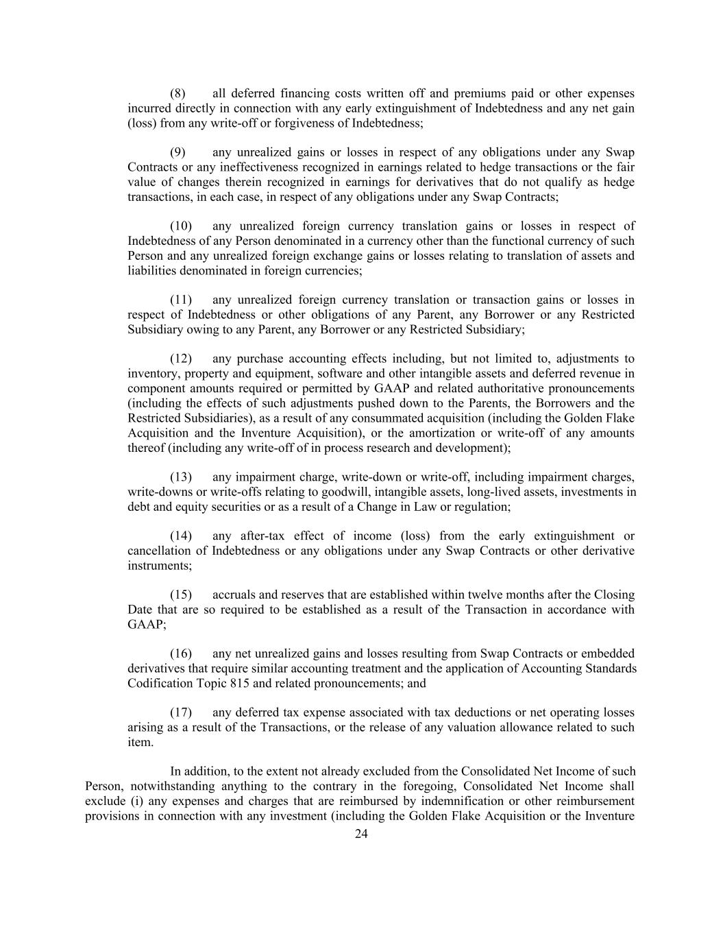 (8) all deferred financing costs written off and premiums paid or other expenses incurred directly in connection with any early extinguishment of Indebtedness and any net gain (loss) from any write-off or forgiveness of Indebtedness; (9) any unrealized gains or losses in respect of any obligations under any Swap Contracts or any ineffectiveness recognized in earnings related to hedge transactions or the fair value of changes therein recognized in earnings for derivatives that do not qualify as hedge transactions, in each case, in respect of any obligations under any Swap Contracts; (10) any unrealized foreign currency translation gains or losses in respect of Indebtedness of any Person denominated in a currency other than the functional currency of such Person and any unrealized foreign exchange gains or losses relating to translation of assets and liabilities denominated in foreign currencies; (11) any unrealized foreign currency translation or transaction gains or losses in respect of Indebtedness or other obligations of any Parent, any Borrower or any Restricted Subsidiary owing to any Parent, any Borrower or any Restricted Subsidiary; (12) any purchase accounting effects including, but not limited to, adjustments to inventory, property and equipment, software and other intangible assets and deferred revenue in component amounts required or permitted by GAAP and related authoritative pronouncements (including the effects of such adjustments pushed down to the Parents, the Borrowers and the Restricted Subsidiaries), as a result of any consummated acquisition (including the Golden Flake Acquisition and the Inventure Acquisition), or the amortization or write-off of any amounts thereof (including any write-off of in process research and development); (13) any impairment charge, write-down or write-off, including impairment charges, write-downs or write-offs relating to goodwill, intangible assets, long-lived assets, investments in debt and equity securities or as a result of a Change in Law or regulation; (14) any after-tax effect of income (loss) from the early extinguishment or cancellation of Indebtedness or any obligations under any Swap Contracts or other derivative instruments; (15) accruals and reserves that are established within twelve months after the Closing Date that are so required to be established as a result of the Transaction in accordance with GAAP; (16) any net unrealized gains and losses resulting from Swap Contracts or embedded derivatives that require similar accounting treatment and the application of Accounting Standards Codification Topic 815 and related pronouncements; and (17) any deferred tax expense associated with tax deductions or net operating losses arising as a result of the Transactions, or the release of any valuation allowance related to such item. In addition, to the extent not already excluded from the Consolidated Net Income of such Person, notwithstanding anything to the contrary in the foregoing, Consolidated Net Income shall exclude (i) any expenses and charges that are reimbursed by indemnification or other reimbursement provisions in connection with any investment (including the Golden Flake Acquisition or the Inventure 24