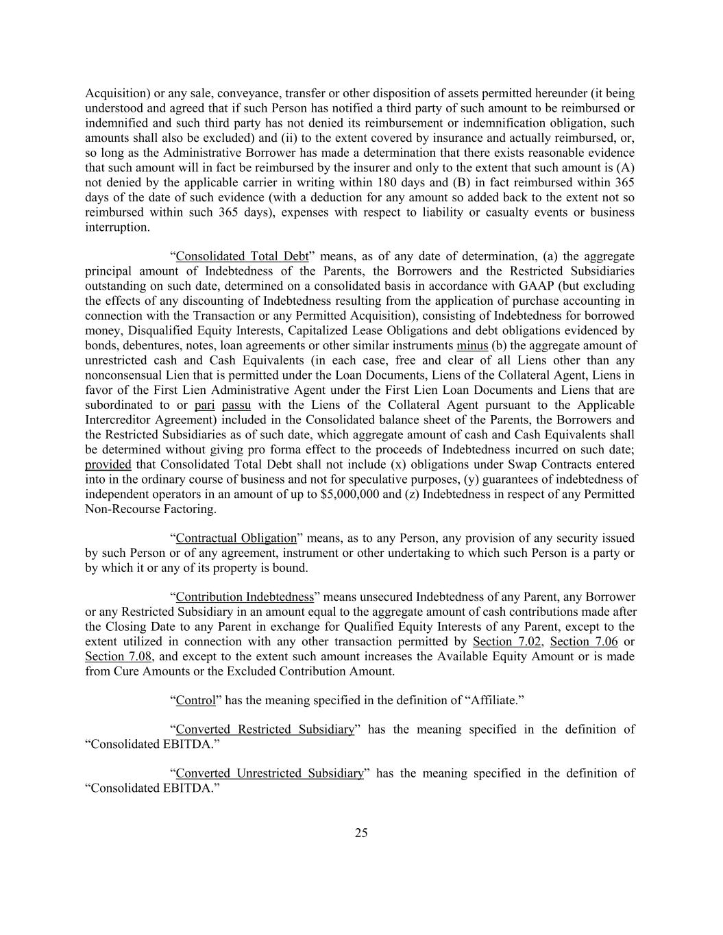 Acquisition) or any sale, conveyance, transfer or other disposition of assets permitted hereunder (it being understood and agreed that if such Person has notified a third party of such amount to be reimbursed or indemnified and such third party has not denied its reimbursement or indemnification obligation, such amounts shall also be excluded) and (ii) to the extent covered by insurance and actually reimbursed, or, so long as the Administrative Borrower has made a determination that there exists reasonable evidence that such amount will in fact be reimbursed by the insurer and only to the extent that such amount is (A) not denied by the applicable carrier in writing within 180 days and (B) in fact reimbursed within 365 days of the date of such evidence (with a deduction for any amount so added back to the extent not so reimbursed within such 365 days), expenses with respect to liability or casualty events or business interruption. “Consolidated Total Debt” means, as of any date of determination, (a) the aggregate principal amount of Indebtedness of the Parents, the Borrowers and the Restricted Subsidiaries outstanding on such date, determined on a consolidated basis in accordance with GAAP (but excluding the effects of any discounting of Indebtedness resulting from the application of purchase accounting in connection with the Transaction or any Permitted Acquisition), consisting of Indebtedness for borrowed money, Disqualified Equity Interests, Capitalized Lease Obligations and debt obligations evidenced by bonds, debentures, notes, loan agreements or other similar instruments minus (b) the aggregate amount of unrestricted cash and Cash Equivalents (in each case, free and clear of all Liens other than any nonconsensual Lien that is permitted under the Loan Documents, Liens of the Collateral Agent, Liens in favor of the First Lien Administrative Agent under the First Lien Loan Documents and Liens that are subordinated to or pari passu with the Liens of the Collateral Agent pursuant to the Applicable Intercreditor Agreement) included in the Consolidated balance sheet of the Parents, the Borrowers and the Restricted Subsidiaries as of such date, which aggregate amount of cash and Cash Equivalents shall be determined without giving pro forma effect to the proceeds of Indebtedness incurred on such date; provided that Consolidated Total Debt shall not include (x) obligations under Swap Contracts entered into in the ordinary course of business and not for speculative purposes, (y) guarantees of indebtedness of independent operators in an amount of up to $5,000,000 and (z) Indebtedness in respect of any Permitted Non-Recourse Factoring. “Contractual Obligation” means, as to any Person, any provision of any security issued by such Person or of any agreement, instrument or other undertaking to which such Person is a party or by which it or any of its property is bound. “Contribution Indebtedness” means unsecured Indebtedness of any Parent, any Borrower or any Restricted Subsidiary in an amount equal to the aggregate amount of cash contributions made after the Closing Date to any Parent in exchange for Qualified Equity Interests of any Parent, except to the extent utilized in connection with any other transaction permitted by Section 7.02, Section 7.06 or Section 7.08, and except to the extent such amount increases the Available Equity Amount or is made from Cure Amounts or the Excluded Contribution Amount. “Control” has the meaning specified in the definition of “Affiliate.” “Converted Restricted Subsidiary” has the meaning specified in the definition of “Consolidated EBITDA.” “Converted Unrestricted Subsidiary” has the meaning specified in the definition of “Consolidated EBITDA.” 25
