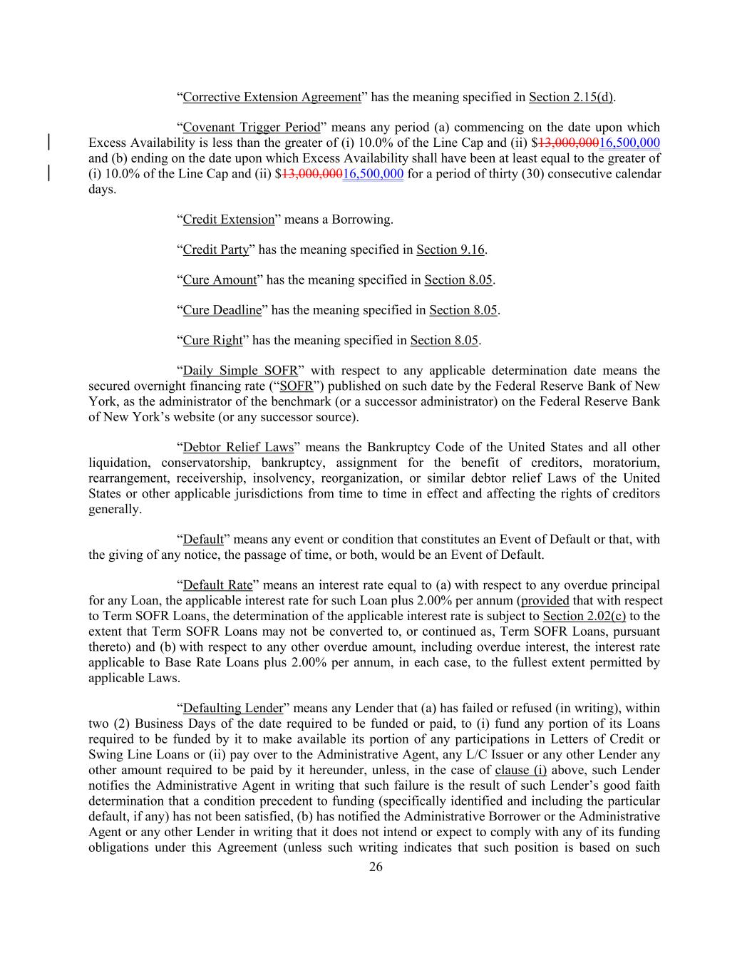 “Corrective Extension Agreement” has the meaning specified in Section 2.15(d). “Covenant Trigger Period” means any period (a) commencing on the date upon which Excess Availability is less than the greater of (i) 10.0% of the Line Cap and (ii) $13,000,00016,500,000 and (b) ending on the date upon which Excess Availability shall have been at least equal to the greater of (i) 10.0% of the Line Cap and (ii) $13,000,00016,500,000 for a period of thirty (30) consecutive calendar days. “Credit Extension” means a Borrowing. “Credit Party” has the meaning specified in Section 9.16. “Cure Amount” has the meaning specified in Section 8.05. “Cure Deadline” has the meaning specified in Section 8.05. “Cure Right” has the meaning specified in Section 8.05. “Daily Simple SOFR” with respect to any applicable determination date means the secured overnight financing rate (“SOFR”) published on such date by the Federal Reserve Bank of New York, as the administrator of the benchmark (or a successor administrator) on the Federal Reserve Bank of New York’s website (or any successor source). “Debtor Relief Laws” means the Bankruptcy Code of the United States and all other liquidation, conservatorship, bankruptcy, assignment for the benefit of creditors, moratorium, rearrangement, receivership, insolvency, reorganization, or similar debtor relief Laws of the United States or other applicable jurisdictions from time to time in effect and affecting the rights of creditors generally. “Default” means any event or condition that constitutes an Event of Default or that, with the giving of any notice, the passage of time, or both, would be an Event of Default. “Default Rate” means an interest rate equal to (a) with respect to any overdue principal for any Loan, the applicable interest rate for such Loan plus 2.00% per annum (provided that with respect to Term SOFR Loans, the determination of the applicable interest rate is subject to Section 2.02(c) to the extent that Term SOFR Loans may not be converted to, or continued as, Term SOFR Loans, pursuant thereto) and (b) with respect to any other overdue amount, including overdue interest, the interest rate applicable to Base Rate Loans plus 2.00% per annum, in each case, to the fullest extent permitted by applicable Laws. “Defaulting Lender” means any Lender that (a) has failed or refused (in writing), within two (2) Business Days of the date required to be funded or paid, to (i) fund any portion of its Loans required to be funded by it to make available its portion of any participations in Letters of Credit or Swing Line Loans or (ii) pay over to the Administrative Agent, any L/C Issuer or any other Lender any other amount required to be paid by it hereunder, unless, in the case of clause (i) above, such Lender notifies the Administrative Agent in writing that such failure is the result of such Lender’s good faith determination that a condition precedent to funding (specifically identified and including the particular default, if any) has not been satisfied, (b) has notified the Administrative Borrower or the Administrative Agent or any other Lender in writing that it does not intend or expect to comply with any of its funding obligations under this Agreement (unless such writing indicates that such position is based on such 26