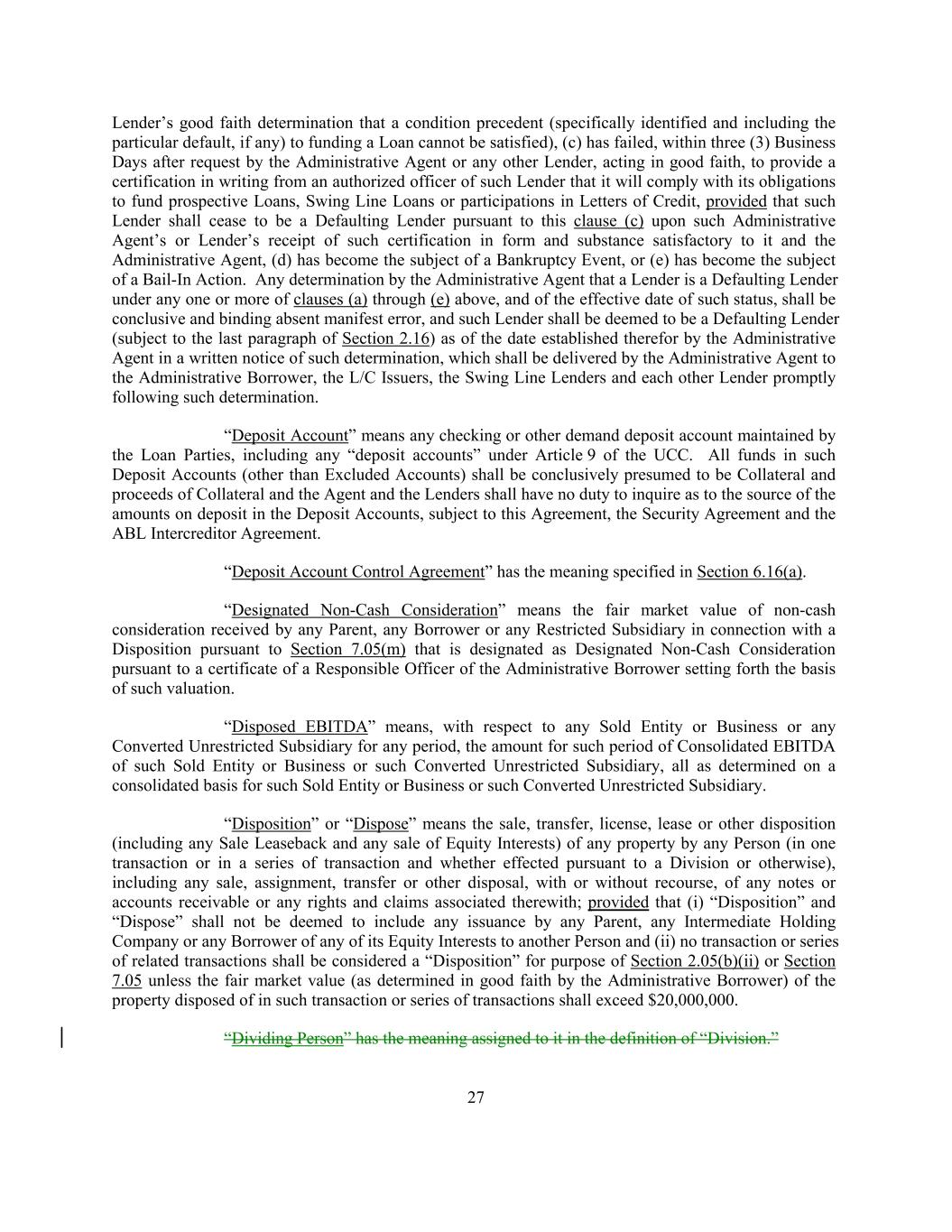 Lender’s good faith determination that a condition precedent (specifically identified and including the particular default, if any) to funding a Loan cannot be satisfied), (c) has failed, within three (3) Business Days after request by the Administrative Agent or any other Lender, acting in good faith, to provide a certification in writing from an authorized officer of such Lender that it will comply with its obligations to fund prospective Loans, Swing Line Loans or participations in Letters of Credit, provided that such Lender shall cease to be a Defaulting Lender pursuant to this clause (c) upon such Administrative Agent’s or Lender’s receipt of such certification in form and substance satisfactory to it and the Administrative Agent, (d) has become the subject of a Bankruptcy Event, or (e) has become the subject of a Bail-In Action. Any determination by the Administrative Agent that a Lender is a Defaulting Lender under any one or more of clauses (a) through (e) above, and of the effective date of such status, shall be conclusive and binding absent manifest error, and such Lender shall be deemed to be a Defaulting Lender (subject to the last paragraph of Section 2.16) as of the date established therefor by the Administrative Agent in a written notice of such determination, which shall be delivered by the Administrative Agent to the Administrative Borrower, the L/C Issuers, the Swing Line Lenders and each other Lender promptly following such determination. “Deposit Account” means any checking or other demand deposit account maintained by the Loan Parties, including any “deposit accounts” under Article 9 of the UCC. All funds in such Deposit Accounts (other than Excluded Accounts) shall be conclusively presumed to be Collateral and proceeds of Collateral and the Agent and the Lenders shall have no duty to inquire as to the source of the amounts on deposit in the Deposit Accounts, subject to this Agreement, the Security Agreement and the ABL Intercreditor Agreement. “Deposit Account Control Agreement” has the meaning specified in Section 6.16(a). “Designated Non-Cash Consideration” means the fair market value of non-cash consideration received by any Parent, any Borrower or any Restricted Subsidiary in connection with a Disposition pursuant to Section 7.05(m) that is designated as Designated Non-Cash Consideration pursuant to a certificate of a Responsible Officer of the Administrative Borrower setting forth the basis of such valuation. “Disposed EBITDA” means, with respect to any Sold Entity or Business or any Converted Unrestricted Subsidiary for any period, the amount for such period of Consolidated EBITDA of such Sold Entity or Business or such Converted Unrestricted Subsidiary, all as determined on a consolidated basis for such Sold Entity or Business or such Converted Unrestricted Subsidiary. “Disposition” or “Dispose” means the sale, transfer, license, lease or other disposition (including any Sale Leaseback and any sale of Equity Interests) of any property by any Person (in one transaction or in a series of transaction and whether effected pursuant to a Division or otherwise), including any sale, assignment, transfer or other disposal, with or without recourse, of any notes or accounts receivable or any rights and claims associated therewith; provided that (i) “Disposition” and “Dispose” shall not be deemed to include any issuance by any Parent, any Intermediate Holding Company or any Borrower of any of its Equity Interests to another Person and (ii) no transaction or series of related transactions shall be considered a “Disposition” for purpose of Section 2.05(b)(ii) or Section 7.05 unless the fair market value (as determined in good faith by the Administrative Borrower) of the property disposed of in such transaction or series of transactions shall exceed $20,000,000. “Dividing Person” has the meaning assigned to it in the definition of “Division.” 27