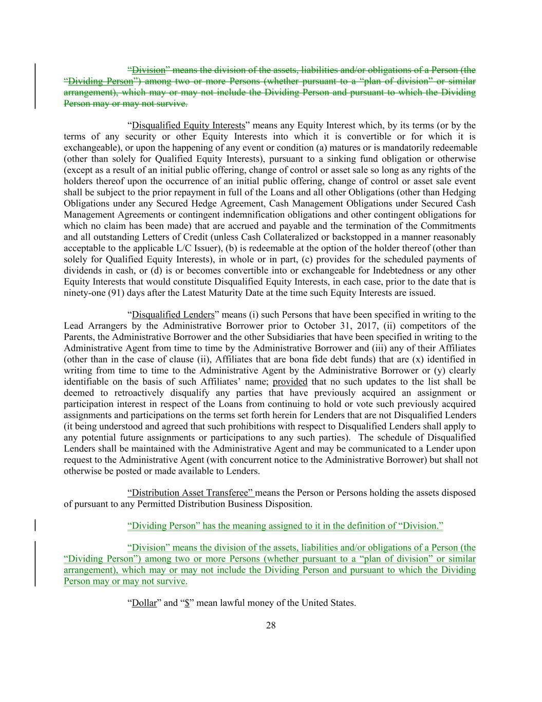 “Division” means the division of the assets, liabilities and/or obligations of a Person (the “Dividing Person”) among two or more Persons (whether pursuant to a “plan of division” or similar arrangement), which may or may not include the Dividing Person and pursuant to which the Dividing Person may or may not survive. “Disqualified Equity Interests” means any Equity Interest which, by its terms (or by the terms of any security or other Equity Interests into which it is convertible or for which it is exchangeable), or upon the happening of any event or condition (a) matures or is mandatorily redeemable (other than solely for Qualified Equity Interests), pursuant to a sinking fund obligation or otherwise (except as a result of an initial public offering, change of control or asset sale so long as any rights of the holders thereof upon the occurrence of an initial public offering, change of control or asset sale event shall be subject to the prior repayment in full of the Loans and all other Obligations (other than Hedging Obligations under any Secured Hedge Agreement, Cash Management Obligations under Secured Cash Management Agreements or contingent indemnification obligations and other contingent obligations for which no claim has been made) that are accrued and payable and the termination of the Commitments and all outstanding Letters of Credit (unless Cash Collateralized or backstopped in a manner reasonably acceptable to the applicable L/C Issuer), (b) is redeemable at the option of the holder thereof (other than solely for Qualified Equity Interests), in whole or in part, (c) provides for the scheduled payments of dividends in cash, or (d) is or becomes convertible into or exchangeable for Indebtedness or any other Equity Interests that would constitute Disqualified Equity Interests, in each case, prior to the date that is ninety-one (91) days after the Latest Maturity Date at the time such Equity Interests are issued. “Disqualified Lenders” means (i) such Persons that have been specified in writing to the Lead Arrangers by the Administrative Borrower prior to October 31, 2017, (ii) competitors of the Parents, the Administrative Borrower and the other Subsidiaries that have been specified in writing to the Administrative Agent from time to time by the Administrative Borrower and (iii) any of their Affiliates (other than in the case of clause (ii), Affiliates that are bona fide debt funds) that are (x) identified in writing from time to time to the Administrative Agent by the Administrative Borrower or (y) clearly identifiable on the basis of such Affiliates’ name; provided that no such updates to the list shall be deemed to retroactively disqualify any parties that have previously acquired an assignment or participation interest in respect of the Loans from continuing to hold or vote such previously acquired assignments and participations on the terms set forth herein for Lenders that are not Disqualified Lenders (it being understood and agreed that such prohibitions with respect to Disqualified Lenders shall apply to any potential future assignments or participations to any such parties). The schedule of Disqualified Lenders shall be maintained with the Administrative Agent and may be communicated to a Lender upon request to the Administrative Agent (with concurrent notice to the Administrative Borrower) but shall not otherwise be posted or made available to Lenders. “Distribution Asset Transferee” means the Person or Persons holding the assets disposed of pursuant to any Permitted Distribution Business Disposition. “Dividing Person” has the meaning assigned to it in the definition of “Division.” “Division” means the division of the assets, liabilities and/or obligations of a Person (the “Dividing Person”) among two or more Persons (whether pursuant to a “plan of division” or similar arrangement), which may or may not include the Dividing Person and pursuant to which the Dividing Person may or may not survive. “Dollar” and “$” mean lawful money of the United States. 28