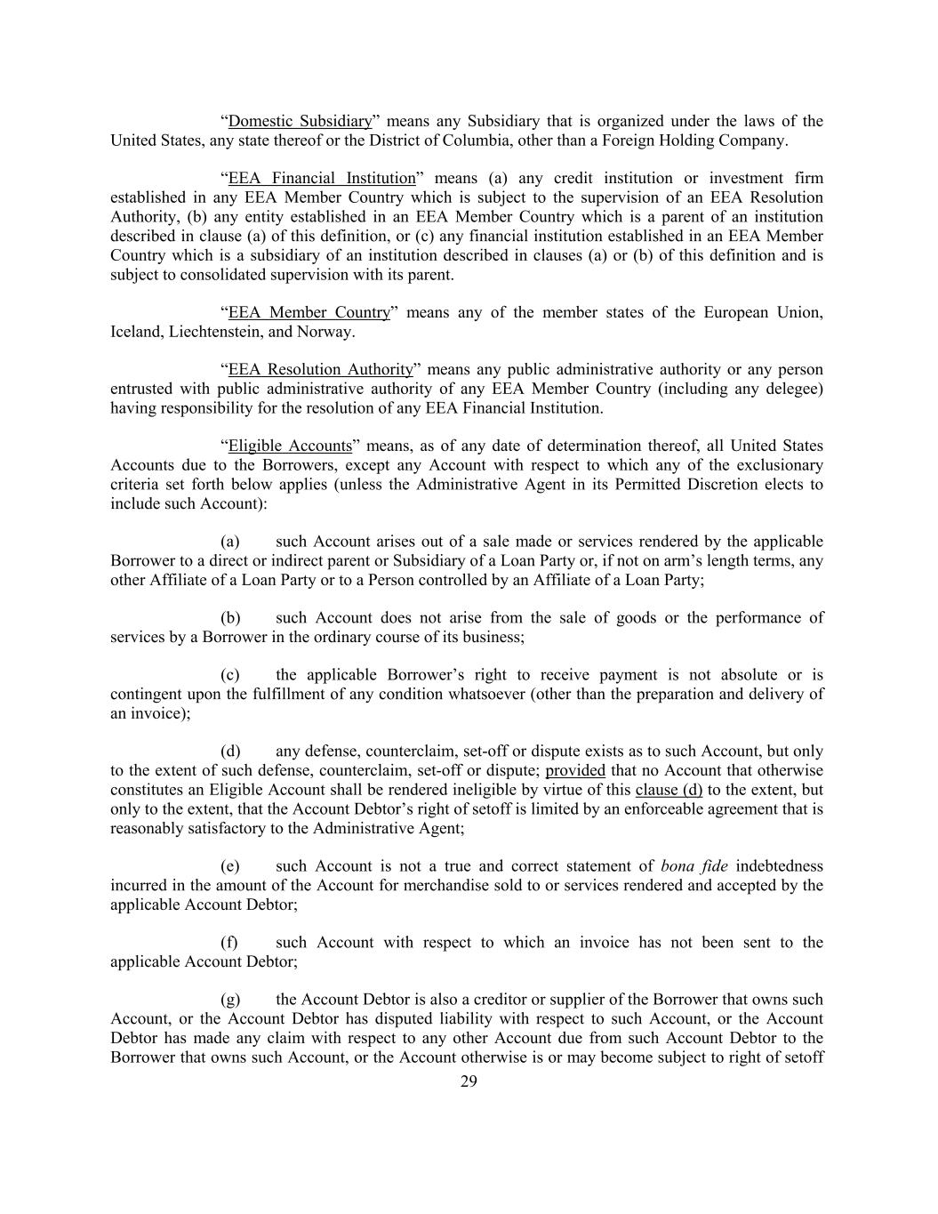 “Domestic Subsidiary” means any Subsidiary that is organized under the laws of the United States, any state thereof or the District of Columbia, other than a Foreign Holding Company. “EEA Financial Institution” means (a) any credit institution or investment firm established in any EEA Member Country which is subject to the supervision of an EEA Resolution Authority, (b) any entity established in an EEA Member Country which is a parent of an institution described in clause (a) of this definition, or (c) any financial institution established in an EEA Member Country which is a subsidiary of an institution described in clauses (a) or (b) of this definition and is subject to consolidated supervision with its parent. “EEA Member Country” means any of the member states of the European Union, Iceland, Liechtenstein, and Norway. “EEA Resolution Authority” means any public administrative authority or any person entrusted with public administrative authority of any EEA Member Country (including any delegee) having responsibility for the resolution of any EEA Financial Institution. “Eligible Accounts” means, as of any date of determination thereof, all United States Accounts due to the Borrowers, except any Account with respect to which any of the exclusionary criteria set forth below applies (unless the Administrative Agent in its Permitted Discretion elects to include such Account): (a) such Account arises out of a sale made or services rendered by the applicable Borrower to a direct or indirect parent or Subsidiary of a Loan Party or, if not on arm’s length terms, any other Affiliate of a Loan Party or to a Person controlled by an Affiliate of a Loan Party; (b) such Account does not arise from the sale of goods or the performance of services by a Borrower in the ordinary course of its business; (c) the applicable Borrower’s right to receive payment is not absolute or is contingent upon the fulfillment of any condition whatsoever (other than the preparation and delivery of an invoice); (d) any defense, counterclaim, set-off or dispute exists as to such Account, but only to the extent of such defense, counterclaim, set-off or dispute; provided that no Account that otherwise constitutes an Eligible Account shall be rendered ineligible by virtue of this clause (d) to the extent, but only to the extent, that the Account Debtor’s right of setoff is limited by an enforceable agreement that is reasonably satisfactory to the Administrative Agent; (e) such Account is not a true and correct statement of bona fide indebtedness incurred in the amount of the Account for merchandise sold to or services rendered and accepted by the applicable Account Debtor; (f) such Account with respect to which an invoice has not been sent to the applicable Account Debtor; (g) the Account Debtor is also a creditor or supplier of the Borrower that owns such Account, or the Account Debtor has disputed liability with respect to such Account, or the Account Debtor has made any claim with respect to any other Account due from such Account Debtor to the Borrower that owns such Account, or the Account otherwise is or may become subject to right of setoff 29