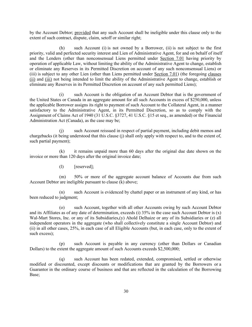 by the Account Debtor; provided that any such Account shall be ineligible under this clause only to the extent of such contract, dispute, claim, setoff or similar right; (h) such Account (i) is not owned by a Borrower, (ii) is not subject to the first priority, valid and perfected security interest and Lien of Administrative Agent, for and on behalf of itself and the Lenders (other than nonconsensual Liens permitted under Section 7.01 having priority by operation of applicable Law, without limiting the ability of the Administrative Agent to change, establish or eliminate any Reserves in its Permitted Discretion on account of any such nonconsensual Liens) or (iii) is subject to any other Lien (other than Liens permitted under Section 7.01) (the foregoing clauses (ii) and (iii) not being intended to limit the ability of the Administrative Agent to change, establish or eliminate any Reserves in its Permitted Discretion on account of any such permitted Liens); (i) such Account is the obligation of an Account Debtor that is the government of the United States or Canada in an aggregate amount for all such Accounts in excess of $250,000, unless the applicable Borrower assigns its right to payment of such Account to the Collateral Agent, in a manner satisfactory to the Administrative Agent, in its Permitted Discretion, so as to comply with the Assignment of Claims Act of 1940 (31 U.S.C. §3727, 41 U.S.C. §15 et seq., as amended) or the Financial Administration Act (Canada), as the case may be; (j) such Account reissued in respect of partial payment, including debit memos and chargebacks (it being understood that this clause (j) shall only apply with respect to, and to the extent of, such partial payment); (k) it remains unpaid more than 60 days after the original due date shown on the invoice or more than 120 days after the original invoice date; (l) [reserved]; (m) 50% or more of the aggregate account balance of Accounts due from such Account Debtor are ineligible pursuant to clause (k) above; (n) such Account is evidenced by chattel paper or an instrument of any kind, or has been reduced to judgment; (o) such Account, together with all other Accounts owing by such Account Debtor and its Affiliates as of any date of determination, exceeds (i) 35% in the case such Account Debtor is (x) Wal-Mart Stores, Inc. or any of its Subsidiaries,(y) Ahold Delhaize or any of its Subsidiaries or (z) all independent operators in the aggregate (who shall collectively constitute a single Account Debtor) and (ii) in all other cases, 25%, in each case of all Eligible Accounts (but, in each case, only to the extent of such excess); (p) such Account is payable in any currency (other than Dollars or Canadian Dollars) to the extent the aggregate amount of such Accounts exceeds $2,500,000; (q) such Account has been redated, extended, compromised, settled or otherwise modified or discounted, except discounts or modifications that are granted by the Borrowers or a Guarantor in the ordinary course of business and that are reflected in the calculation of the Borrowing Base; 30