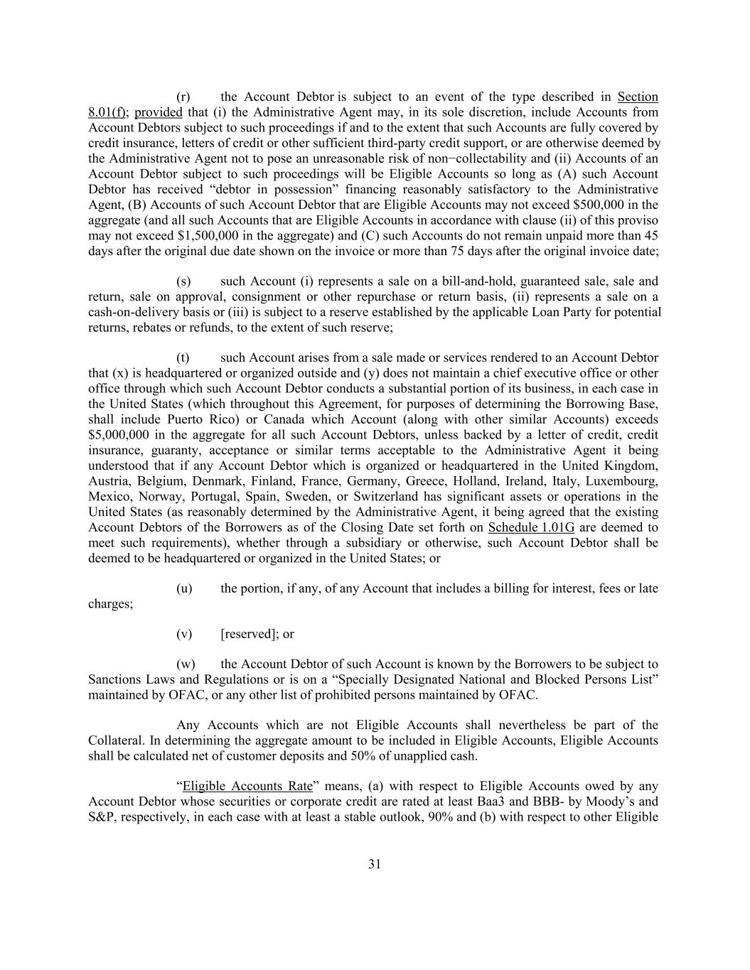 (r) the Account Debtor is subject to an event of the type described in Section 8.01(f); provided that (i) the Administrative Agent may, in its sole discretion, include Accounts from Account Debtors subject to such proceedings if and to the extent that such Accounts are fully covered by credit insurance, letters of credit or other sufficient third-party credit support, or are otherwise deemed by the Administrative Agent not to pose an unreasonable risk of non−collectability and (ii) Accounts of an Account Debtor subject to such proceedings will be Eligible Accounts so long as (A) such Account Debtor has received “debtor in possession” financing reasonably satisfactory to the Administrative Agent, (B) Accounts of such Account Debtor that are Eligible Accounts may not exceed $500,000 in the aggregate (and all such Accounts that are Eligible Accounts in accordance with clause (ii) of this proviso may not exceed $1,500,000 in the aggregate) and (C) such Accounts do not remain unpaid more than 45 days after the original due date shown on the invoice or more than 75 days after the original invoice date; (s) such Account (i) represents a sale on a bill-and-hold, guaranteed sale, sale and return, sale on approval, consignment or other repurchase or return basis, (ii) represents a sale on a cash-on-delivery basis or (iii) is subject to a reserve established by the applicable Loan Party for potential returns, rebates or refunds, to the extent of such reserve; (t) such Account arises from a sale made or services rendered to an Account Debtor that (x) is headquartered or organized outside and (y) does not maintain a chief executive office or other office through which such Account Debtor conducts a substantial portion of its business, in each case in the United States (which throughout this Agreement, for purposes of determining the Borrowing Base, shall include Puerto Rico) or Canada which Account (along with other similar Accounts) exceeds $5,000,000 in the aggregate for all such Account Debtors, unless backed by a letter of credit, credit insurance, guaranty, acceptance or similar terms acceptable to the Administrative Agent it being understood that if any Account Debtor which is organized or headquartered in the United Kingdom, Austria, Belgium, Denmark, Finland, France, Germany, Greece, Holland, Ireland, Italy, Luxembourg, Mexico, Norway, Portugal, Spain, Sweden, or Switzerland has significant assets or operations in the United States (as reasonably determined by the Administrative Agent, it being agreed that the existing Account Debtors of the Borrowers as of the Closing Date set forth on Schedule 1.01G are deemed to meet such requirements), whether through a subsidiary or otherwise, such Account Debtor shall be deemed to be headquartered or organized in the United States; or (u) the portion, if any, of any Account that includes a billing for interest, fees or late charges; (v) [reserved]; or (w) the Account Debtor of such Account is known by the Borrowers to be subject to Sanctions Laws and Regulations or is on a “Specially Designated National and Blocked Persons List” maintained by OFAC, or any other list of prohibited persons maintained by OFAC. Any Accounts which are not Eligible Accounts shall nevertheless be part of the Collateral. In determining the aggregate amount to be included in Eligible Accounts, Eligible Accounts shall be calculated net of customer deposits and 50% of unapplied cash. “Eligible Accounts Rate” means, (a) with respect to Eligible Accounts owed by any Account Debtor whose securities or corporate credit are rated at least Baa3 and BBB- by Moody’s and S&P, respectively, in each case with at least a stable outlook, 90% and (b) with respect to other Eligible 31
