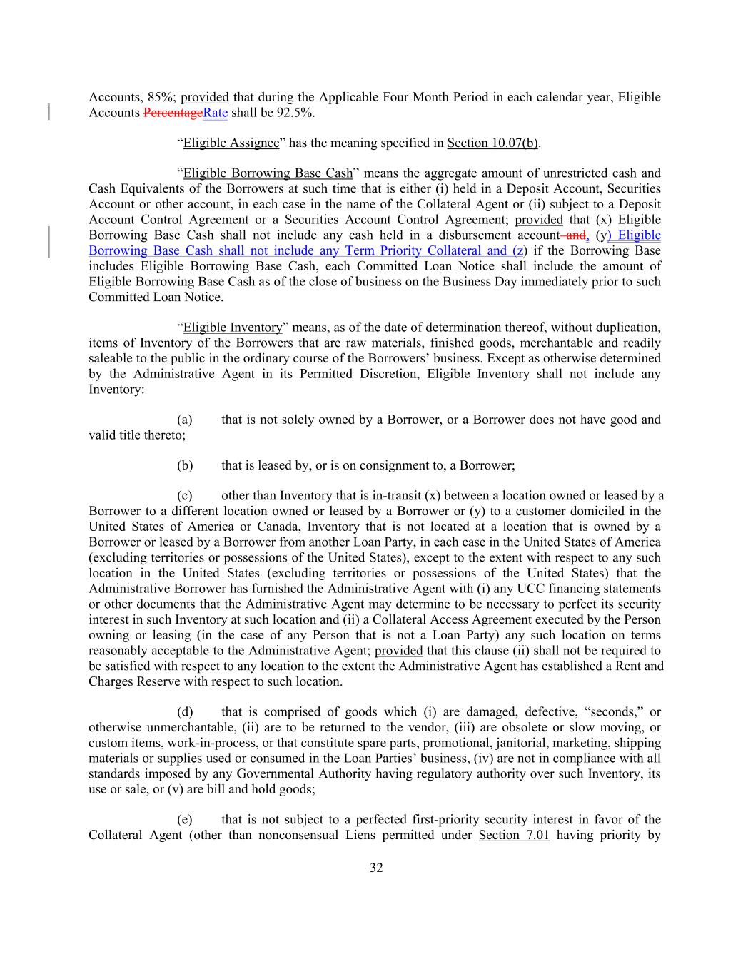 Accounts, 85%; provided that during the Applicable Four Month Period in each calendar year, Eligible Accounts PercentageRate shall be 92.5%. “Eligible Assignee” has the meaning specified in Section 10.07(b). “Eligible Borrowing Base Cash” means the aggregate amount of unrestricted cash and Cash Equivalents of the Borrowers at such time that is either (i) held in a Deposit Account, Securities Account or other account, in each case in the name of the Collateral Agent or (ii) subject to a Deposit Account Control Agreement or a Securities Account Control Agreement; provided that (x) Eligible Borrowing Base Cash shall not include any cash held in a disbursement account and, (y) Eligible Borrowing Base Cash shall not include any Term Priority Collateral and (z) if the Borrowing Base includes Eligible Borrowing Base Cash, each Committed Loan Notice shall include the amount of Eligible Borrowing Base Cash as of the close of business on the Business Day immediately prior to such Committed Loan Notice. “Eligible Inventory” means, as of the date of determination thereof, without duplication, items of Inventory of the Borrowers that are raw materials, finished goods, merchantable and readily saleable to the public in the ordinary course of the Borrowers’ business. Except as otherwise determined by the Administrative Agent in its Permitted Discretion, Eligible Inventory shall not include any Inventory: (a) that is not solely owned by a Borrower, or a Borrower does not have good and valid title thereto; (b) that is leased by, or is on consignment to, a Borrower; (c) other than Inventory that is in-transit (x) between a location owned or leased by a Borrower to a different location owned or leased by a Borrower or (y) to a customer domiciled in the United States of America or Canada, Inventory that is not located at a location that is owned by a Borrower or leased by a Borrower from another Loan Party, in each case in the United States of America (excluding territories or possessions of the United States), except to the extent with respect to any such location in the United States (excluding territories or possessions of the United States) that the Administrative Borrower has furnished the Administrative Agent with (i) any UCC financing statements or other documents that the Administrative Agent may determine to be necessary to perfect its security interest in such Inventory at such location and (ii) a Collateral Access Agreement executed by the Person owning or leasing (in the case of any Person that is not a Loan Party) any such location on terms reasonably acceptable to the Administrative Agent; provided that this clause (ii) shall not be required to be satisfied with respect to any location to the extent the Administrative Agent has established a Rent and Charges Reserve with respect to such location. (d) that is comprised of goods which (i) are damaged, defective, “seconds,” or otherwise unmerchantable, (ii) are to be returned to the vendor, (iii) are obsolete or slow moving, or custom items, work-in-process, or that constitute spare parts, promotional, janitorial, marketing, shipping materials or supplies used or consumed in the Loan Parties’ business, (iv) are not in compliance with all standards imposed by any Governmental Authority having regulatory authority over such Inventory, its use or sale, or (v) are bill and hold goods; (e) that is not subject to a perfected first-priority security interest in favor of the Collateral Agent (other than nonconsensual Liens permitted under Section 7.01 having priority by 32