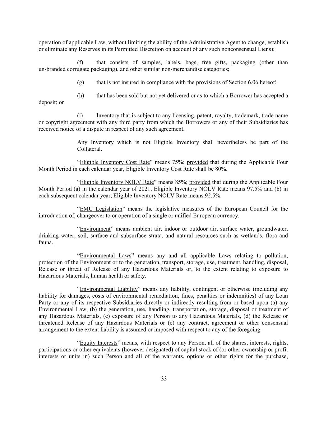 operation of applicable Law, without limiting the ability of the Administrative Agent to change, establish or eliminate any Reserves in its Permitted Discretion on account of any such nonconsensual Liens); (f) that consists of samples, labels, bags, free gifts, packaging (other than un-branded corrugate packaging), and other similar non-merchandise categories; (g) that is not insured in compliance with the provisions of Section 6.06 hereof; (h) that has been sold but not yet delivered or as to which a Borrower has accepted a deposit; or (i) Inventory that is subject to any licensing, patent, royalty, trademark, trade name or copyright agreement with any third party from which the Borrowers or any of their Subsidiaries has received notice of a dispute in respect of any such agreement. Any Inventory which is not Eligible Inventory shall nevertheless be part of the Collateral. “Eligible Inventory Cost Rate” means 75%; provided that during the Applicable Four Month Period in each calendar year, Eligible Inventory Cost Rate shall be 80%. “Eligible Inventory NOLV Rate” means 85%; provided that during the Applicable Four Month Period (a) in the calendar year of 2021, Eligible Inventory NOLV Rate means 97.5% and (b) in each subsequent calendar year, Eligible Inventory NOLV Rate means 92.5%. “EMU Legislation” means the legislative measures of the European Council for the introduction of, changeover to or operation of a single or unified European currency. “Environment” means ambient air, indoor or outdoor air, surface water, groundwater, drinking water, soil, surface and subsurface strata, and natural resources such as wetlands, flora and fauna. “Environmental Laws” means any and all applicable Laws relating to pollution, protection of the Environment or to the generation, transport, storage, use, treatment, handling, disposal, Release or threat of Release of any Hazardous Materials or, to the extent relating to exposure to Hazardous Materials, human health or safety. “Environmental Liability” means any liability, contingent or otherwise (including any liability for damages, costs of environmental remediation, fines, penalties or indemnities) of any Loan Party or any of its respective Subsidiaries directly or indirectly resulting from or based upon (a) any Environmental Law, (b) the generation, use, handling, transportation, storage, disposal or treatment of any Hazardous Materials, (c) exposure of any Person to any Hazardous Materials, (d) the Release or threatened Release of any Hazardous Materials or (e) any contract, agreement or other consensual arrangement to the extent liability is assumed or imposed with respect to any of the foregoing. “Equity Interests” means, with respect to any Person, all of the shares, interests, rights, participations or other equivalents (however designated) of capital stock of (or other ownership or profit interests or units in) such Person and all of the warrants, options or other rights for the purchase, 33