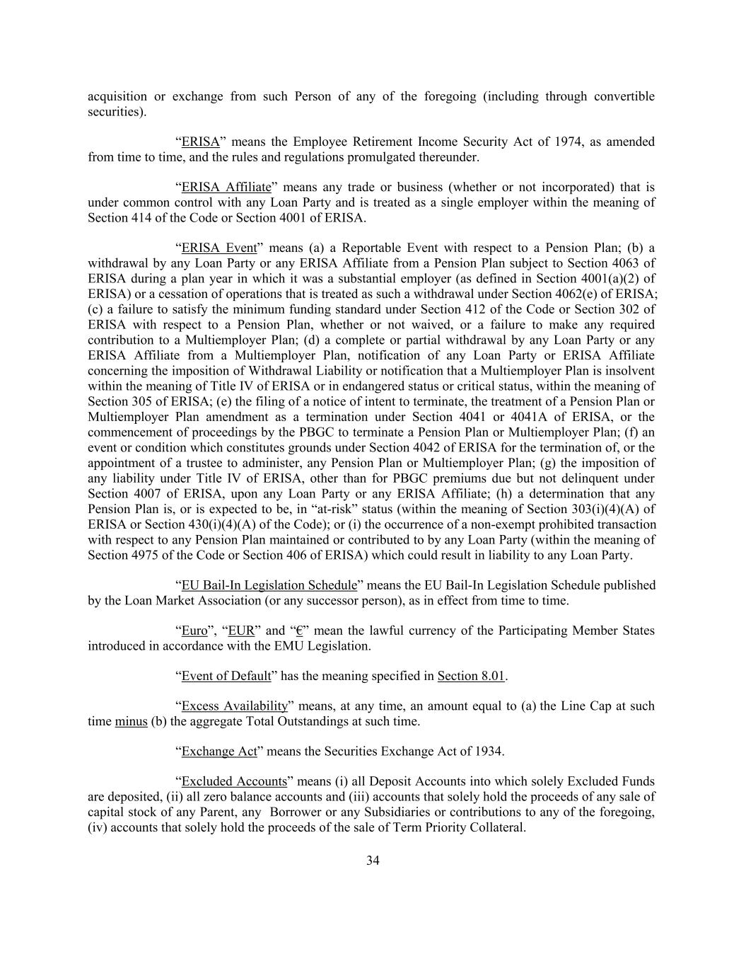 acquisition or exchange from such Person of any of the foregoing (including through convertible securities). “ERISA” means the Employee Retirement Income Security Act of 1974, as amended from time to time, and the rules and regulations promulgated thereunder. “ERISA Affiliate” means any trade or business (whether or not incorporated) that is under common control with any Loan Party and is treated as a single employer within the meaning of Section 414 of the Code or Section 4001 of ERISA. “ERISA Event” means (a) a Reportable Event with respect to a Pension Plan; (b) a withdrawal by any Loan Party or any ERISA Affiliate from a Pension Plan subject to Section 4063 of ERISA during a plan year in which it was a substantial employer (as defined in Section 4001(a)(2) of ERISA) or a cessation of operations that is treated as such a withdrawal under Section 4062(e) of ERISA; (c) a failure to satisfy the minimum funding standard under Section 412 of the Code or Section 302 of ERISA with respect to a Pension Plan, whether or not waived, or a failure to make any required contribution to a Multiemployer Plan; (d) a complete or partial withdrawal by any Loan Party or any ERISA Affiliate from a Multiemployer Plan, notification of any Loan Party or ERISA Affiliate concerning the imposition of Withdrawal Liability or notification that a Multiemployer Plan is insolvent within the meaning of Title IV of ERISA or in endangered status or critical status, within the meaning of Section 305 of ERISA; (e) the filing of a notice of intent to terminate, the treatment of a Pension Plan or Multiemployer Plan amendment as a termination under Section 4041 or 4041A of ERISA, or the commencement of proceedings by the PBGC to terminate a Pension Plan or Multiemployer Plan; (f) an event or condition which constitutes grounds under Section 4042 of ERISA for the termination of, or the appointment of a trustee to administer, any Pension Plan or Multiemployer Plan; (g) the imposition of any liability under Title IV of ERISA, other than for PBGC premiums due but not delinquent under Section 4007 of ERISA, upon any Loan Party or any ERISA Affiliate; (h) a determination that any Pension Plan is, or is expected to be, in “at-risk” status (within the meaning of Section 303(i)(4)(A) of ERISA or Section 430(i)(4)(A) of the Code); or (i) the occurrence of a non-exempt prohibited transaction with respect to any Pension Plan maintained or contributed to by any Loan Party (within the meaning of Section 4975 of the Code or Section 406 of ERISA) which could result in liability to any Loan Party. “EU Bail-In Legislation Schedule” means the EU Bail-In Legislation Schedule published by the Loan Market Association (or any successor person), as in effect from time to time. “Euro”, “EUR” and “€” mean the lawful currency of the Participating Member States introduced in accordance with the EMU Legislation. “Event of Default” has the meaning specified in Section 8.01. “Excess Availability” means, at any time, an amount equal to (a) the Line Cap at such time minus (b) the aggregate Total Outstandings at such time. “Exchange Act” means the Securities Exchange Act of 1934. “Excluded Accounts” means (i) all Deposit Accounts into which solely Excluded Funds are deposited, (ii) all zero balance accounts and (iii) accounts that solely hold the proceeds of any sale of capital stock of any Parent, any Borrower or any Subsidiaries or contributions to any of the foregoing, (iv) accounts that solely hold the proceeds of the sale of Term Priority Collateral. 34