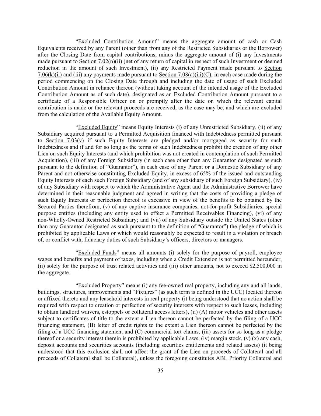 “Excluded Contribution Amount” means the aggregate amount of cash or Cash Equivalents received by any Parent (other than from any of the Restricted Subsidiaries or the Borrower) after the Closing Date from capital contributions, minus the aggregate amount of (i) any Investments made pursuant to Section 7.02(n)(ii) (net of any return of capital in respect of such Investment or deemed reduction in the amount of such Investment), (ii) any Restricted Payment made pursuant to Section 7.06(k)(ii) and (iii) any payments made pursuant to Section 7.08(a)(iii)(C), in each case made during the period commencing on the Closing Date through and including the date of usage of such Excluded Contribution Amount in reliance thereon (without taking account of the intended usage of the Excluded Contribution Amount as of such date), designated as an Excluded Contribution Amount pursuant to a certificate of a Responsible Officer on or promptly after the date on which the relevant capital contribution is made or the relevant proceeds are received, as the case may be, and which are excluded from the calculation of the Available Equity Amount. “Excluded Equity” means Equity Interests (i) of any Unrestricted Subsidiary, (ii) of any Subsidiary acquired pursuant to a Permitted Acquisition financed with Indebtedness permitted pursuant to Section 7.03(v) if such Equity Interests are pledged and/or mortgaged as security for such Indebtedness and if and for so long as the terms of such Indebtedness prohibit the creation of any other Lien on such Equity Interests (and which prohibition was not created in contemplation of such Permitted Acquisition), (iii) of any Foreign Subsidiary (in each case other than any Guarantor designated as such pursuant to the definition of “Guarantor”), in each case of any Parent or a Domestic Subsidiary of any Parent and not otherwise constituting Excluded Equity, in excess of 65% of the issued and outstanding Equity Interests of each such Foreign Subsidiary (and of any subsidiary of such Foreign Subsidiary), (iv) of any Subsidiary with respect to which the Administrative Agent and the Administrative Borrower have determined in their reasonable judgment and agreed in writing that the costs of providing a pledge of such Equity Interests or perfection thereof is excessive in view of the benefits to be obtained by the Secured Parties therefrom, (v) of any captive insurance companies, not-for-profit Subsidiaries, special purpose entities (including any entity used to effect a Permitted Receivables Financing), (vi) of any non-Wholly-Owned Restricted Subsidiary; and (vii) of any Subsidiary outside the United States (other than any Guarantor designated as such pursuant to the definition of “Guarantor”) the pledge of which is prohibited by applicable Laws or which would reasonably be expected to result in a violation or breach of, or conflict with, fiduciary duties of such Subsidiary’s officers, directors or managers. “Excluded Funds” means all amounts (i) solely for the purpose of payroll, employee wages and benefits and payment of taxes, including when a Credit Extension is not permitted hereunder, (ii) solely for the purpose of trust related activities and (iii) other amounts, not to exceed $2,500,000 in the aggregate. “Excluded Property” means (i) any fee-owned real property, including any and all lands, buildings, structures, improvements and “Fixtures” (as such term is defined in the UCC) located thereon or affixed thereto and any leasehold interests in real property (it being understood that no action shall be required with respect to creation or perfection of security interests with respect to such leases, including to obtain landlord waivers, estoppels or collateral access letters), (ii) (A) motor vehicles and other assets subject to certificates of title to the extent a Lien thereon cannot be perfected by the filing of a UCC financing statement, (B) letter of credit rights to the extent a Lien thereon cannot be perfected by the filing of a UCC financing statement and (C) commercial tort claims, (iii) assets for so long as a pledge thereof or a security interest therein is prohibited by applicable Laws, (iv) margin stock, (v) (x) any cash, deposit accounts and securities accounts (including securities entitlements and related assets) (it being understood that this exclusion shall not affect the grant of the Lien on proceeds of Collateral and all proceeds of Collateral shall be Collateral), unless the foregoing constitutes ABL Priority Collateral and 35