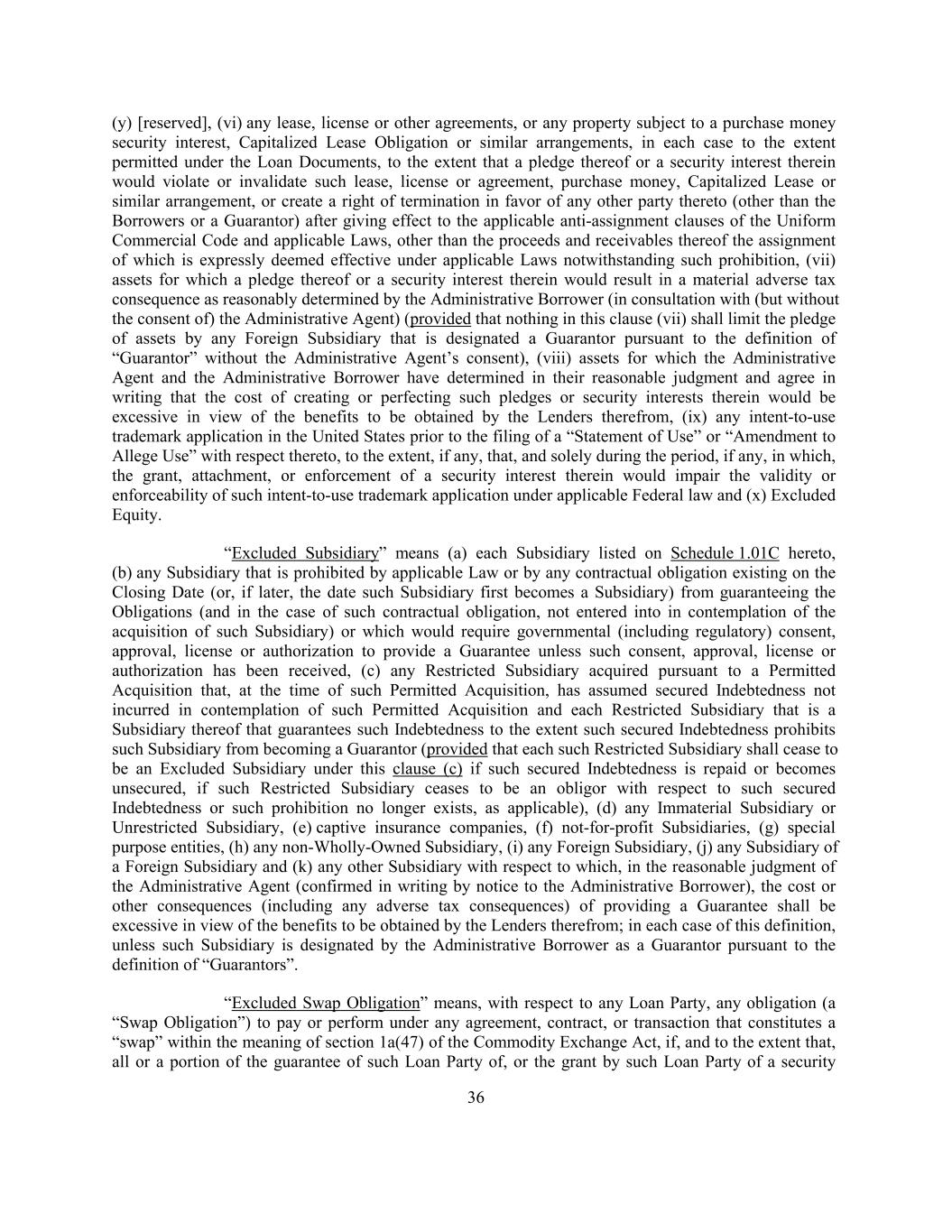 (y) [reserved], (vi) any lease, license or other agreements, or any property subject to a purchase money security interest, Capitalized Lease Obligation or similar arrangements, in each case to the extent permitted under the Loan Documents, to the extent that a pledge thereof or a security interest therein would violate or invalidate such lease, license or agreement, purchase money, Capitalized Lease or similar arrangement, or create a right of termination in favor of any other party thereto (other than the Borrowers or a Guarantor) after giving effect to the applicable anti-assignment clauses of the Uniform Commercial Code and applicable Laws, other than the proceeds and receivables thereof the assignment of which is expressly deemed effective under applicable Laws notwithstanding such prohibition, (vii) assets for which a pledge thereof or a security interest therein would result in a material adverse tax consequence as reasonably determined by the Administrative Borrower (in consultation with (but without the consent of) the Administrative Agent) (provided that nothing in this clause (vii) shall limit the pledge of assets by any Foreign Subsidiary that is designated a Guarantor pursuant to the definition of “Guarantor” without the Administrative Agent’s consent), (viii) assets for which the Administrative Agent and the Administrative Borrower have determined in their reasonable judgment and agree in writing that the cost of creating or perfecting such pledges or security interests therein would be excessive in view of the benefits to be obtained by the Lenders therefrom, (ix) any intent-to-use trademark application in the United States prior to the filing of a “Statement of Use” or “Amendment to Allege Use” with respect thereto, to the extent, if any, that, and solely during the period, if any, in which, the grant, attachment, or enforcement of a security interest therein would impair the validity or enforceability of such intent-to-use trademark application under applicable Federal law and (x) Excluded Equity. “Excluded Subsidiary” means (a) each Subsidiary listed on Schedule 1.01C hereto, (b) any Subsidiary that is prohibited by applicable Law or by any contractual obligation existing on the Closing Date (or, if later, the date such Subsidiary first becomes a Subsidiary) from guaranteeing the Obligations (and in the case of such contractual obligation, not entered into in contemplation of the acquisition of such Subsidiary) or which would require governmental (including regulatory) consent, approval, license or authorization to provide a Guarantee unless such consent, approval, license or authorization has been received, (c) any Restricted Subsidiary acquired pursuant to a Permitted Acquisition that, at the time of such Permitted Acquisition, has assumed secured Indebtedness not incurred in contemplation of such Permitted Acquisition and each Restricted Subsidiary that is a Subsidiary thereof that guarantees such Indebtedness to the extent such secured Indebtedness prohibits such Subsidiary from becoming a Guarantor (provided that each such Restricted Subsidiary shall cease to be an Excluded Subsidiary under this clause (c) if such secured Indebtedness is repaid or becomes unsecured, if such Restricted Subsidiary ceases to be an obligor with respect to such secured Indebtedness or such prohibition no longer exists, as applicable), (d) any Immaterial Subsidiary or Unrestricted Subsidiary, (e) captive insurance companies, (f) not-for-profit Subsidiaries, (g) special purpose entities, (h) any non-Wholly-Owned Subsidiary, (i) any Foreign Subsidiary, (j) any Subsidiary of a Foreign Subsidiary and (k) any other Subsidiary with respect to which, in the reasonable judgment of the Administrative Agent (confirmed in writing by notice to the Administrative Borrower), the cost or other consequences (including any adverse tax consequences) of providing a Guarantee shall be excessive in view of the benefits to be obtained by the Lenders therefrom; in each case of this definition, unless such Subsidiary is designated by the Administrative Borrower as a Guarantor pursuant to the definition of “Guarantors”. “Excluded Swap Obligation” means, with respect to any Loan Party, any obligation (a “Swap Obligation”) to pay or perform under any agreement, contract, or transaction that constitutes a “swap” within the meaning of section 1a(47) of the Commodity Exchange Act, if, and to the extent that, all or a portion of the guarantee of such Loan Party of, or the grant by such Loan Party of a security 36