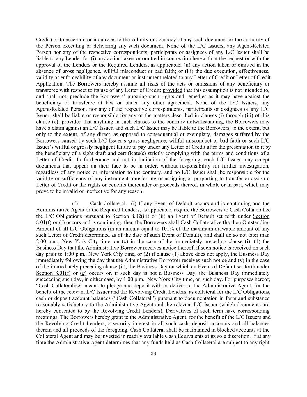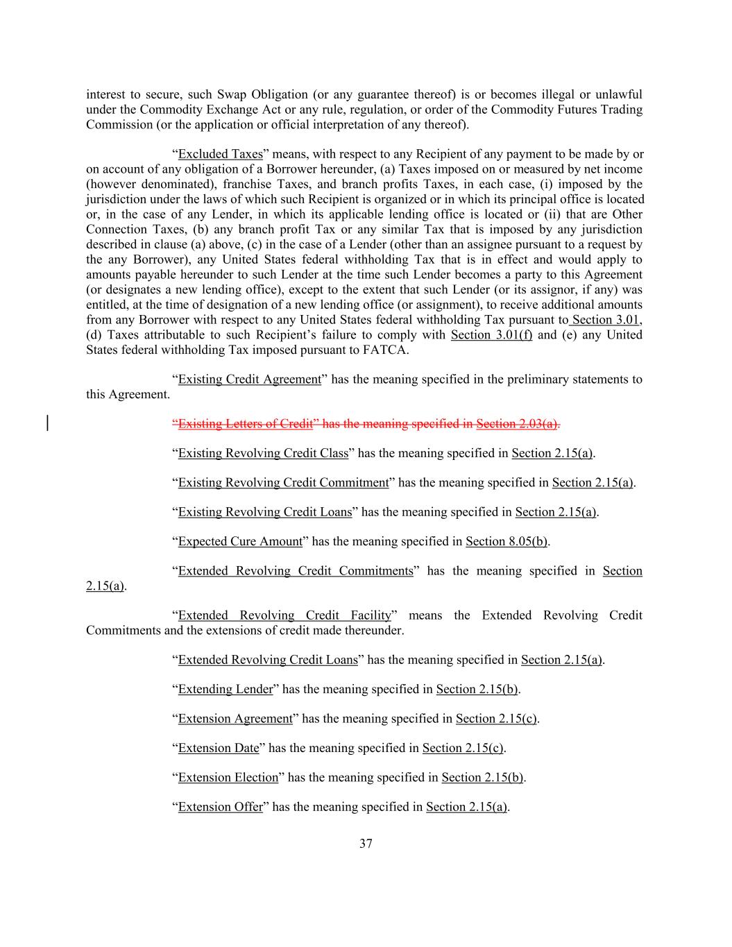 interest to secure, such Swap Obligation (or any guarantee thereof) is or becomes illegal or unlawful under the Commodity Exchange Act or any rule, regulation, or order of the Commodity Futures Trading Commission (or the application or official interpretation of any thereof). “Excluded Taxes” means, with respect to any Recipient of any payment to be made by or on account of any obligation of a Borrower hereunder, (a) Taxes imposed on or measured by net income (however denominated), franchise Taxes, and branch profits Taxes, in each case, (i) imposed by the jurisdiction under the laws of which such Recipient is organized or in which its principal office is located or, in the case of any Lender, in which its applicable lending office is located or (ii) that are Other Connection Taxes, (b) any branch profit Tax or any similar Tax that is imposed by any jurisdiction described in clause (a) above, (c) in the case of a Lender (other than an assignee pursuant to a request by the any Borrower), any United States federal withholding Tax that is in effect and would apply to amounts payable hereunder to such Lender at the time such Lender becomes a party to this Agreement (or designates a new lending office), except to the extent that such Lender (or its assignor, if any) was entitled, at the time of designation of a new lending office (or assignment), to receive additional amounts from any Borrower with respect to any United States federal withholding Tax pursuant to Section 3.01, (d) Taxes attributable to such Recipient’s failure to comply with Section 3.01(f) and (e) any United States federal withholding Tax imposed pursuant to FATCA. “Existing Credit Agreement” has the meaning specified in the preliminary statements to this Agreement. “Existing Letters of Credit” has the meaning specified in Section 2.03(a). “Existing Revolving Credit Class” has the meaning specified in Section 2.15(a). “Existing Revolving Credit Commitment” has the meaning specified in Section 2.15(a). “Existing Revolving Credit Loans” has the meaning specified in Section 2.15(a). “Expected Cure Amount” has the meaning specified in Section 8.05(b). “Extended Revolving Credit Commitments” has the meaning specified in Section 2.15(a). “Extended Revolving Credit Facility” means the Extended Revolving Credit Commitments and the extensions of credit made thereunder. “Extended Revolving Credit Loans” has the meaning specified in Section 2.15(a). “Extending Lender” has the meaning specified in Section 2.15(b). “Extension Agreement” has the meaning specified in Section 2.15(c). “Extension Date” has the meaning specified in Section 2.15(c). “Extension Election” has the meaning specified in Section 2.15(b). “Extension Offer” has the meaning specified in Section 2.15(a). 37