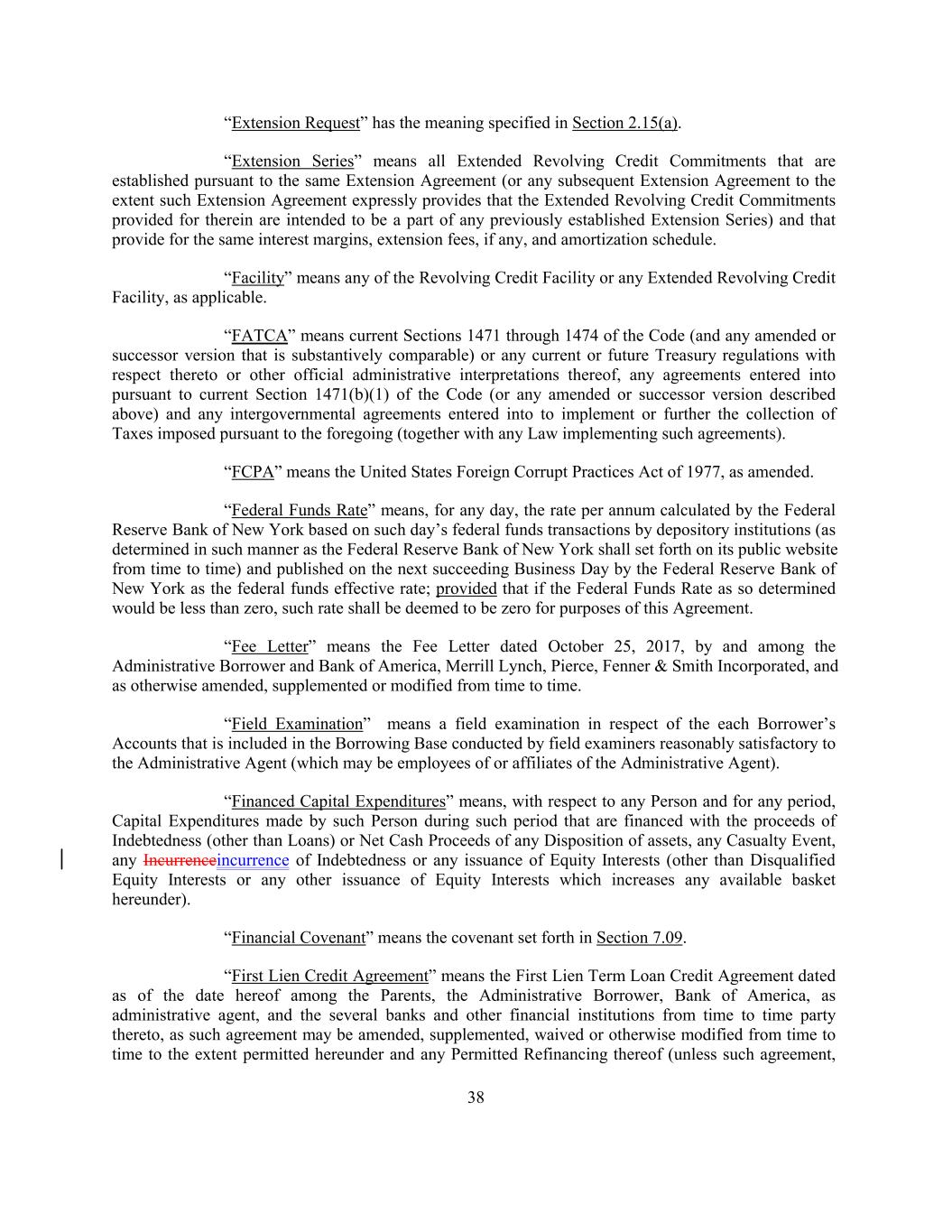 “Extension Request” has the meaning specified in Section 2.15(a). “Extension Series” means all Extended Revolving Credit Commitments that are established pursuant to the same Extension Agreement (or any subsequent Extension Agreement to the extent such Extension Agreement expressly provides that the Extended Revolving Credit Commitments provided for therein are intended to be a part of any previously established Extension Series) and that provide for the same interest margins, extension fees, if any, and amortization schedule. “Facility” means any of the Revolving Credit Facility or any Extended Revolving Credit Facility, as applicable. “FATCA” means current Sections 1471 through 1474 of the Code (and any amended or successor version that is substantively comparable) or any current or future Treasury regulations with respect thereto or other official administrative interpretations thereof, any agreements entered into pursuant to current Section 1471(b)(1) of the Code (or any amended or successor version described above) and any intergovernmental agreements entered into to implement or further the collection of Taxes imposed pursuant to the foregoing (together with any Law implementing such agreements). “FCPA” means the United States Foreign Corrupt Practices Act of 1977, as amended. “Federal Funds Rate” means, for any day, the rate per annum calculated by the Federal Reserve Bank of New York based on such day’s federal funds transactions by depository institutions (as determined in such manner as the Federal Reserve Bank of New York shall set forth on its public website from time to time) and published on the next succeeding Business Day by the Federal Reserve Bank of New York as the federal funds effective rate; provided that if the Federal Funds Rate as so determined would be less than zero, such rate shall be deemed to be zero for purposes of this Agreement. “Fee Letter” means the Fee Letter dated October 25, 2017, by and among the Administrative Borrower and Bank of America, Merrill Lynch, Pierce, Fenner & Smith Incorporated, and as otherwise amended, supplemented or modified from time to time. “Field Examination” means a field examination in respect of the each Borrower’s Accounts that is included in the Borrowing Base conducted by field examiners reasonably satisfactory to the Administrative Agent (which may be employees of or affiliates of the Administrative Agent). “Financed Capital Expenditures” means, with respect to any Person and for any period, Capital Expenditures made by such Person during such period that are financed with the proceeds of Indebtedness (other than Loans) or Net Cash Proceeds of any Disposition of assets, any Casualty Event, any Incurrenceincurrence of Indebtedness or any issuance of Equity Interests (other than Disqualified Equity Interests or any other issuance of Equity Interests which increases any available basket hereunder). “Financial Covenant” means the covenant set forth in Section 7.09. “First Lien Credit Agreement” means the First Lien Term Loan Credit Agreement dated as of the date hereof among the Parents, the Administrative Borrower, Bank of America, as administrative agent, and the several banks and other financial institutions from time to time party thereto, as such agreement may be amended, supplemented, waived or otherwise modified from time to time to the extent permitted hereunder and any Permitted Refinancing thereof (unless such agreement, 38
