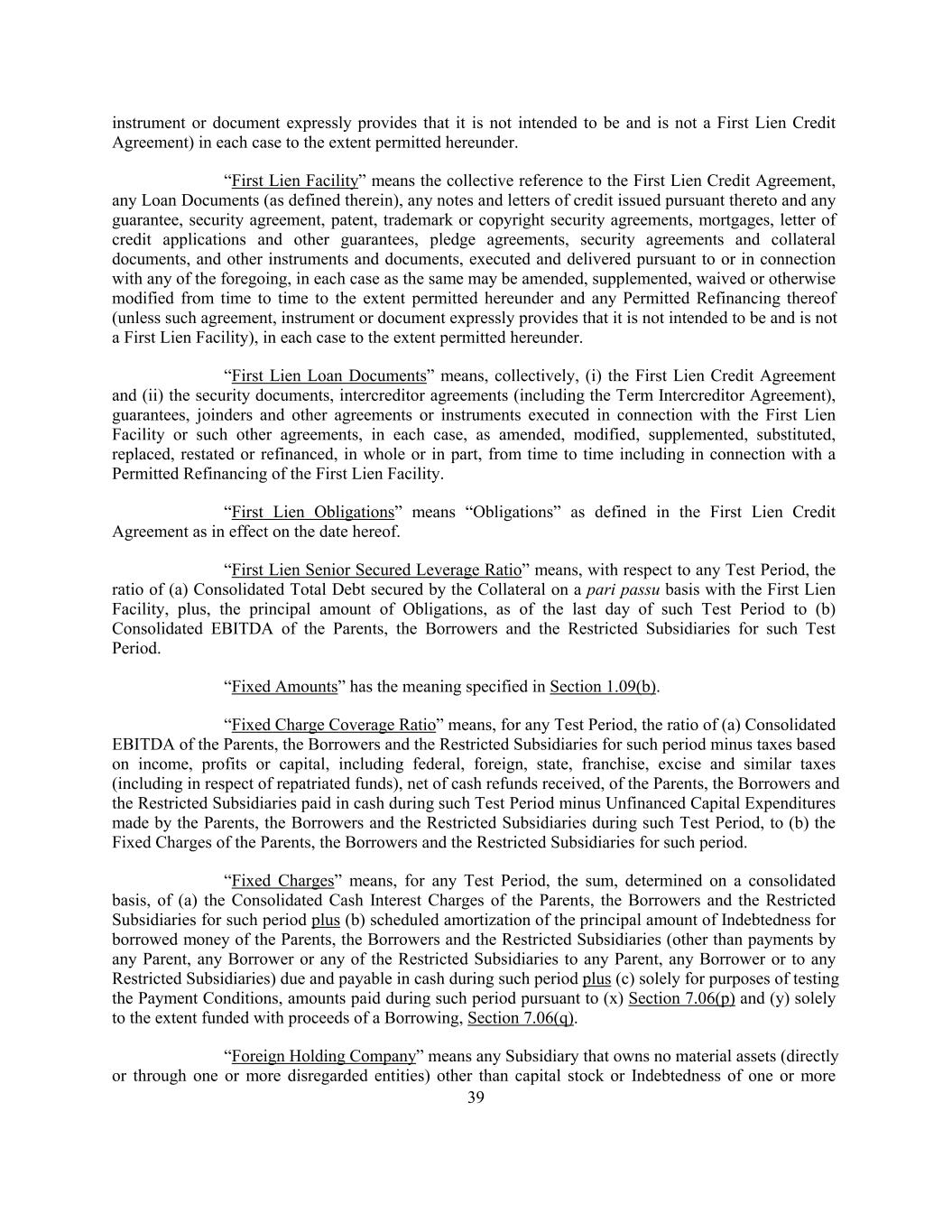 instrument or document expressly provides that it is not intended to be and is not a First Lien Credit Agreement) in each case to the extent permitted hereunder. “First Lien Facility” means the collective reference to the First Lien Credit Agreement, any Loan Documents (as defined therein), any notes and letters of credit issued pursuant thereto and any guarantee, security agreement, patent, trademark or copyright security agreements, mortgages, letter of credit applications and other guarantees, pledge agreements, security agreements and collateral documents, and other instruments and documents, executed and delivered pursuant to or in connection with any of the foregoing, in each case as the same may be amended, supplemented, waived or otherwise modified from time to time to the extent permitted hereunder and any Permitted Refinancing thereof (unless such agreement, instrument or document expressly provides that it is not intended to be and is not a First Lien Facility), in each case to the extent permitted hereunder. “First Lien Loan Documents” means, collectively, (i) the First Lien Credit Agreement and (ii) the security documents, intercreditor agreements (including the Term Intercreditor Agreement), guarantees, joinders and other agreements or instruments executed in connection with the First Lien Facility or such other agreements, in each case, as amended, modified, supplemented, substituted, replaced, restated or refinanced, in whole or in part, from time to time including in connection with a Permitted Refinancing of the First Lien Facility. “First Lien Obligations” means “Obligations” as defined in the First Lien Credit Agreement as in effect on the date hereof. “First Lien Senior Secured Leverage Ratio” means, with respect to any Test Period, the ratio of (a) Consolidated Total Debt secured by the Collateral on a pari passu basis with the First Lien Facility, plus, the principal amount of Obligations, as of the last day of such Test Period to (b) Consolidated EBITDA of the Parents, the Borrowers and the Restricted Subsidiaries for such Test Period. “Fixed Amounts” has the meaning specified in Section 1.09(b). “Fixed Charge Coverage Ratio” means, for any Test Period, the ratio of (a) Consolidated EBITDA of the Parents, the Borrowers and the Restricted Subsidiaries for such period minus taxes based on income, profits or capital, including federal, foreign, state, franchise, excise and similar taxes (including in respect of repatriated funds), net of cash refunds received, of the Parents, the Borrowers and the Restricted Subsidiaries paid in cash during such Test Period minus Unfinanced Capital Expenditures made by the Parents, the Borrowers and the Restricted Subsidiaries during such Test Period, to (b) the Fixed Charges of the Parents, the Borrowers and the Restricted Subsidiaries for such period. “Fixed Charges” means, for any Test Period, the sum, determined on a consolidated basis, of (a) the Consolidated Cash Interest Charges of the Parents, the Borrowers and the Restricted Subsidiaries for such period plus (b) scheduled amortization of the principal amount of Indebtedness for borrowed money of the Parents, the Borrowers and the Restricted Subsidiaries (other than payments by any Parent, any Borrower or any of the Restricted Subsidiaries to any Parent, any Borrower or to any Restricted Subsidiaries) due and payable in cash during such period plus (c) solely for purposes of testing the Payment Conditions, amounts paid during such period pursuant to (x) Section 7.06(p) and (y) solely to the extent funded with proceeds of a Borrowing, Section 7.06(q). “Foreign Holding Company” means any Subsidiary that owns no material assets (directly or through one or more disregarded entities) other than capital stock or Indebtedness of one or more 39