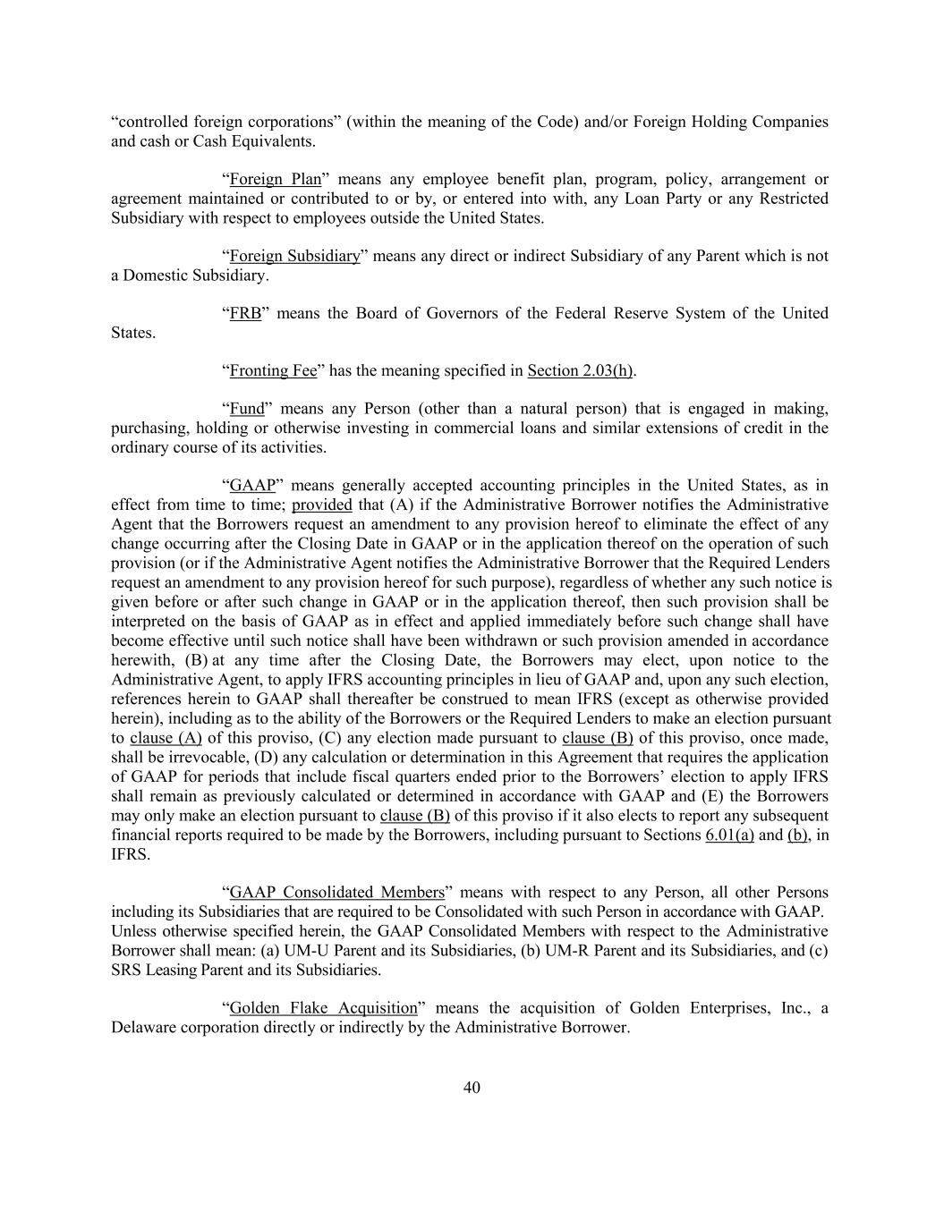 “controlled foreign corporations” (within the meaning of the Code) and/or Foreign Holding Companies and cash or Cash Equivalents. “Foreign Plan” means any employee benefit plan, program, policy, arrangement or agreement maintained or contributed to or by, or entered into with, any Loan Party or any Restricted Subsidiary with respect to employees outside the United States. “Foreign Subsidiary” means any direct or indirect Subsidiary of any Parent which is not a Domestic Subsidiary. “FRB” means the Board of Governors of the Federal Reserve System of the United States. “Fronting Fee” has the meaning specified in Section 2.03(h). “Fund” means any Person (other than a natural person) that is engaged in making, purchasing, holding or otherwise investing in commercial loans and similar extensions of credit in the ordinary course of its activities. “GAAP” means generally accepted accounting principles in the United States, as in effect from time to time; provided that (A) if the Administrative Borrower notifies the Administrative Agent that the Borrowers request an amendment to any provision hereof to eliminate the effect of any change occurring after the Closing Date in GAAP or in the application thereof on the operation of such provision (or if the Administrative Agent notifies the Administrative Borrower that the Required Lenders request an amendment to any provision hereof for such purpose), regardless of whether any such notice is given before or after such change in GAAP or in the application thereof, then such provision shall be interpreted on the basis of GAAP as in effect and applied immediately before such change shall have become effective until such notice shall have been withdrawn or such provision amended in accordance herewith, (B) at any time after the Closing Date, the Borrowers may elect, upon notice to the Administrative Agent, to apply IFRS accounting principles in lieu of GAAP and, upon any such election, references herein to GAAP shall thereafter be construed to mean IFRS (except as otherwise provided herein), including as to the ability of the Borrowers or the Required Lenders to make an election pursuant to clause (A) of this proviso, (C) any election made pursuant to clause (B) of this proviso, once made, shall be irrevocable, (D) any calculation or determination in this Agreement that requires the application of GAAP for periods that include fiscal quarters ended prior to the Borrowers’ election to apply IFRS shall remain as previously calculated or determined in accordance with GAAP and (E) the Borrowers may only make an election pursuant to clause (B) of this proviso if it also elects to report any subsequent financial reports required to be made by the Borrowers, including pursuant to Sections 6.01(a) and (b), in IFRS. “GAAP Consolidated Members” means with respect to any Person, all other Persons including its Subsidiaries that are required to be Consolidated with such Person in accordance with GAAP. Unless otherwise specified herein, the GAAP Consolidated Members with respect to the Administrative Borrower shall mean: (a) UM-U Parent and its Subsidiaries, (b) UM-R Parent and its Subsidiaries, and (c) SRS Leasing Parent and its Subsidiaries. “Golden Flake Acquisition” means the acquisition of Golden Enterprises, Inc., a Delaware corporation directly or indirectly by the Administrative Borrower. 40