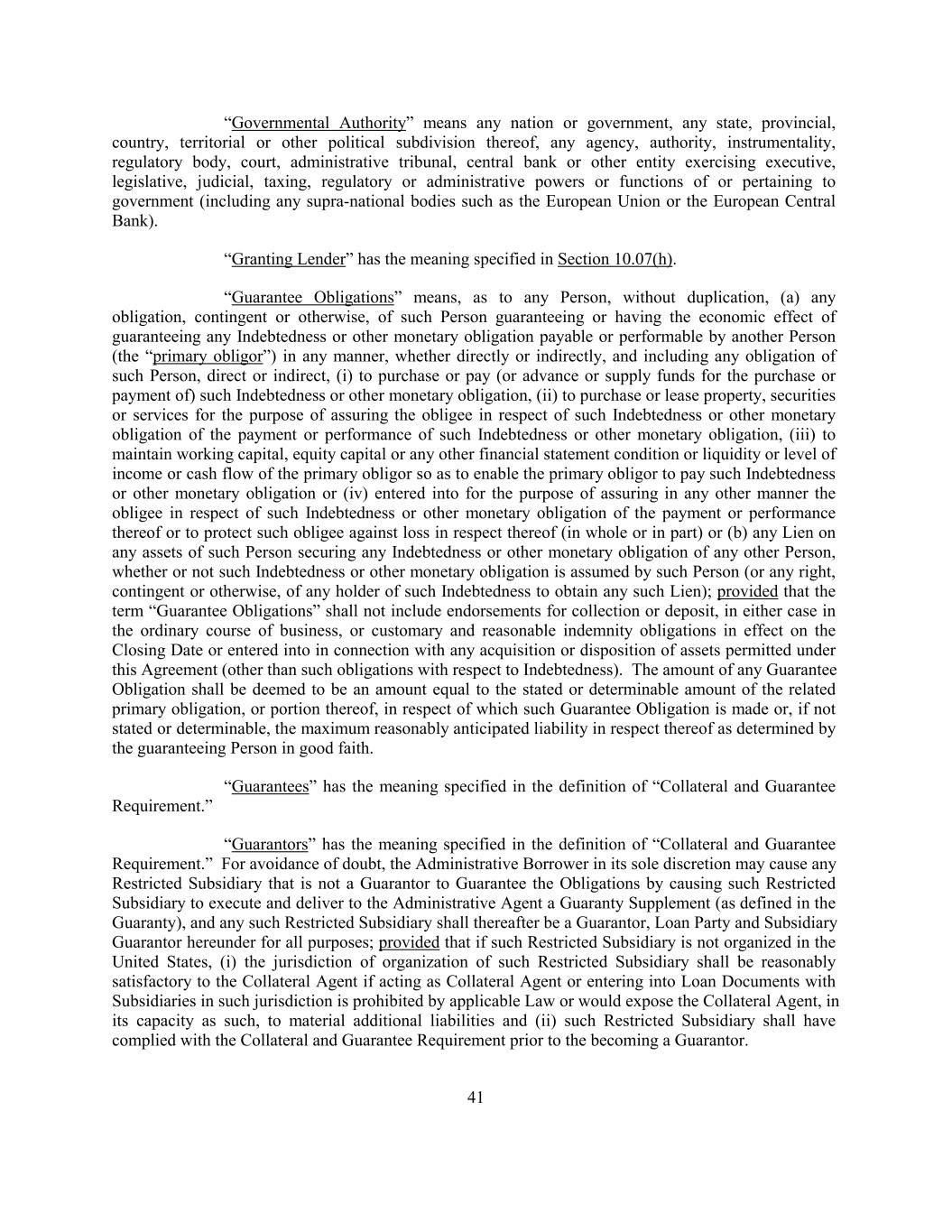 “Governmental Authority” means any nation or government, any state, provincial, country, territorial or other political subdivision thereof, any agency, authority, instrumentality, regulatory body, court, administrative tribunal, central bank or other entity exercising executive, legislative, judicial, taxing, regulatory or administrative powers or functions of or pertaining to government (including any supra-national bodies such as the European Union or the European Central Bank). “Granting Lender” has the meaning specified in Section 10.07(h). “Guarantee Obligations” means, as to any Person, without duplication, (a) any obligation, contingent or otherwise, of such Person guaranteeing or having the economic effect of guaranteeing any Indebtedness or other monetary obligation payable or performable by another Person (the “primary obligor”) in any manner, whether directly or indirectly, and including any obligation of such Person, direct or indirect, (i) to purchase or pay (or advance or supply funds for the purchase or payment of) such Indebtedness or other monetary obligation, (ii) to purchase or lease property, securities or services for the purpose of assuring the obligee in respect of such Indebtedness or other monetary obligation of the payment or performance of such Indebtedness or other monetary obligation, (iii) to maintain working capital, equity capital or any other financial statement condition or liquidity or level of income or cash flow of the primary obligor so as to enable the primary obligor to pay such Indebtedness or other monetary obligation or (iv) entered into for the purpose of assuring in any other manner the obligee in respect of such Indebtedness or other monetary obligation of the payment or performance thereof or to protect such obligee against loss in respect thereof (in whole or in part) or (b) any Lien on any assets of such Person securing any Indebtedness or other monetary obligation of any other Person, whether or not such Indebtedness or other monetary obligation is assumed by such Person (or any right, contingent or otherwise, of any holder of such Indebtedness to obtain any such Lien); provided that the term “Guarantee Obligations” shall not include endorsements for collection or deposit, in either case in the ordinary course of business, or customary and reasonable indemnity obligations in effect on the Closing Date or entered into in connection with any acquisition or disposition of assets permitted under this Agreement (other than such obligations with respect to Indebtedness). The amount of any Guarantee Obligation shall be deemed to be an amount equal to the stated or determinable amount of the related primary obligation, or portion thereof, in respect of which such Guarantee Obligation is made or, if not stated or determinable, the maximum reasonably anticipated liability in respect thereof as determined by the guaranteeing Person in good faith. “Guarantees” has the meaning specified in the definition of “Collateral and Guarantee Requirement.” “Guarantors” has the meaning specified in the definition of “Collateral and Guarantee Requirement.” For avoidance of doubt, the Administrative Borrower in its sole discretion may cause any Restricted Subsidiary that is not a Guarantor to Guarantee the Obligations by causing such Restricted Subsidiary to execute and deliver to the Administrative Agent a Guaranty Supplement (as defined in the Guaranty), and any such Restricted Subsidiary shall thereafter be a Guarantor, Loan Party and Subsidiary Guarantor hereunder for all purposes; provided that if such Restricted Subsidiary is not organized in the United States, (i) the jurisdiction of organization of such Restricted Subsidiary shall be reasonably satisfactory to the Collateral Agent if acting as Collateral Agent or entering into Loan Documents with Subsidiaries in such jurisdiction is prohibited by applicable Law or would expose the Collateral Agent, in its capacity as such, to material additional liabilities and (ii) such Restricted Subsidiary shall have complied with the Collateral and Guarantee Requirement prior to the becoming a Guarantor. 41