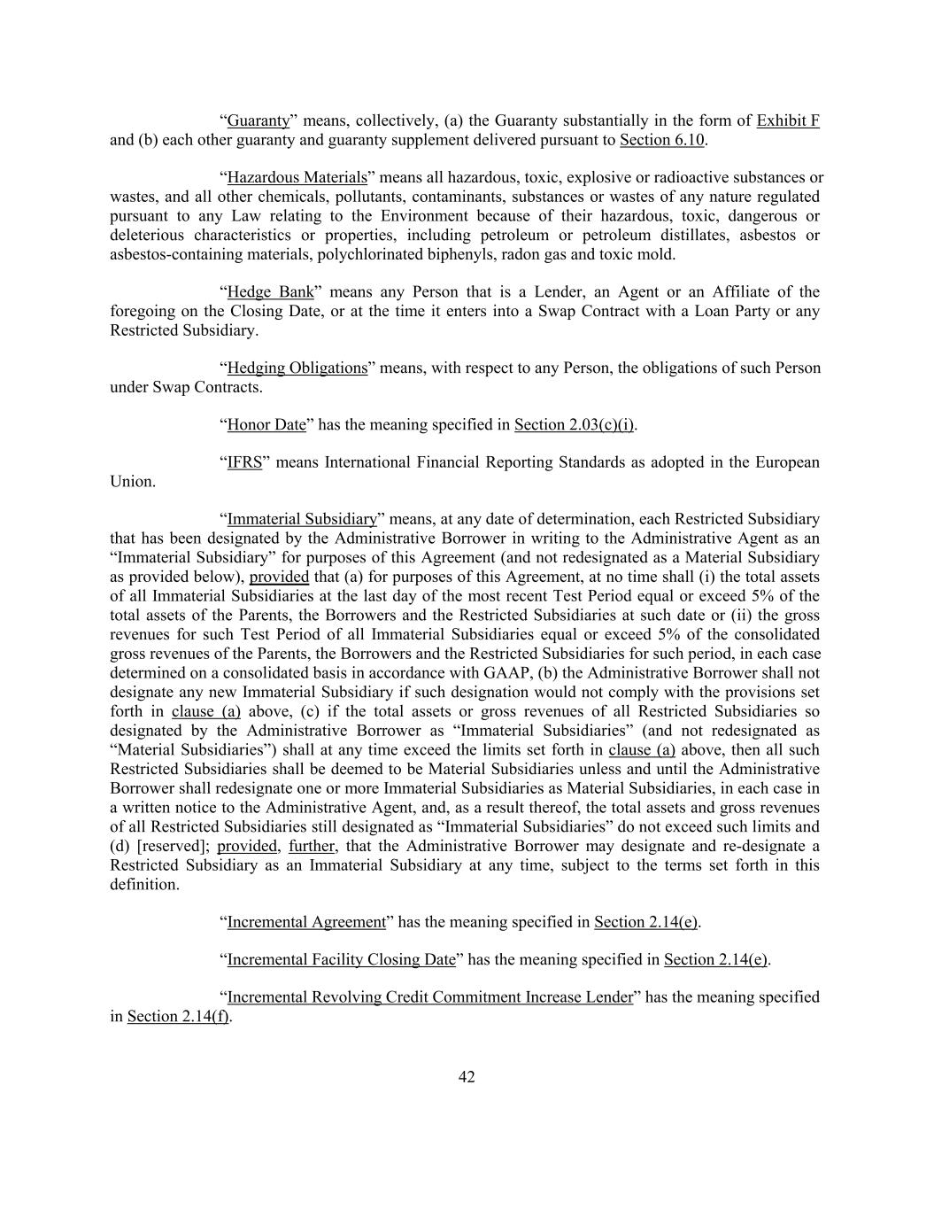 “Guaranty” means, collectively, (a) the Guaranty substantially in the form of Exhibit F and (b) each other guaranty and guaranty supplement delivered pursuant to Section 6.10. “Hazardous Materials” means all hazardous, toxic, explosive or radioactive substances or wastes, and all other chemicals, pollutants, contaminants, substances or wastes of any nature regulated pursuant to any Law relating to the Environment because of their hazardous, toxic, dangerous or deleterious characteristics or properties, including petroleum or petroleum distillates, asbestos or asbestos-containing materials, polychlorinated biphenyls, radon gas and toxic mold. “Hedge Bank” means any Person that is a Lender, an Agent or an Affiliate of the foregoing on the Closing Date, or at the time it enters into a Swap Contract with a Loan Party or any Restricted Subsidiary. “Hedging Obligations” means, with respect to any Person, the obligations of such Person under Swap Contracts. “Honor Date” has the meaning specified in Section 2.03(c)(i). “IFRS” means International Financial Reporting Standards as adopted in the European Union. “Immaterial Subsidiary” means, at any date of determination, each Restricted Subsidiary that has been designated by the Administrative Borrower in writing to the Administrative Agent as an “Immaterial Subsidiary” for purposes of this Agreement (and not redesignated as a Material Subsidiary as provided below), provided that (a) for purposes of this Agreement, at no time shall (i) the total assets of all Immaterial Subsidiaries at the last day of the most recent Test Period equal or exceed 5% of the total assets of the Parents, the Borrowers and the Restricted Subsidiaries at such date or (ii) the gross revenues for such Test Period of all Immaterial Subsidiaries equal or exceed 5% of the consolidated gross revenues of the Parents, the Borrowers and the Restricted Subsidiaries for such period, in each case determined on a consolidated basis in accordance with GAAP, (b) the Administrative Borrower shall not designate any new Immaterial Subsidiary if such designation would not comply with the provisions set forth in clause (a) above, (c) if the total assets or gross revenues of all Restricted Subsidiaries so designated by the Administrative Borrower as “Immaterial Subsidiaries” (and not redesignated as “Material Subsidiaries”) shall at any time exceed the limits set forth in clause (a) above, then all such Restricted Subsidiaries shall be deemed to be Material Subsidiaries unless and until the Administrative Borrower shall redesignate one or more Immaterial Subsidiaries as Material Subsidiaries, in each case in a written notice to the Administrative Agent, and, as a result thereof, the total assets and gross revenues of all Restricted Subsidiaries still designated as “Immaterial Subsidiaries” do not exceed such limits and (d) [reserved]; provided, further, that the Administrative Borrower may designate and re-designate a Restricted Subsidiary as an Immaterial Subsidiary at any time, subject to the terms set forth in this definition. “Incremental Agreement” has the meaning specified in Section 2.14(e). “Incremental Facility Closing Date” has the meaning specified in Section 2.14(e). “Incremental Revolving Credit Commitment Increase Lender” has the meaning specified in Section 2.14(f). 42