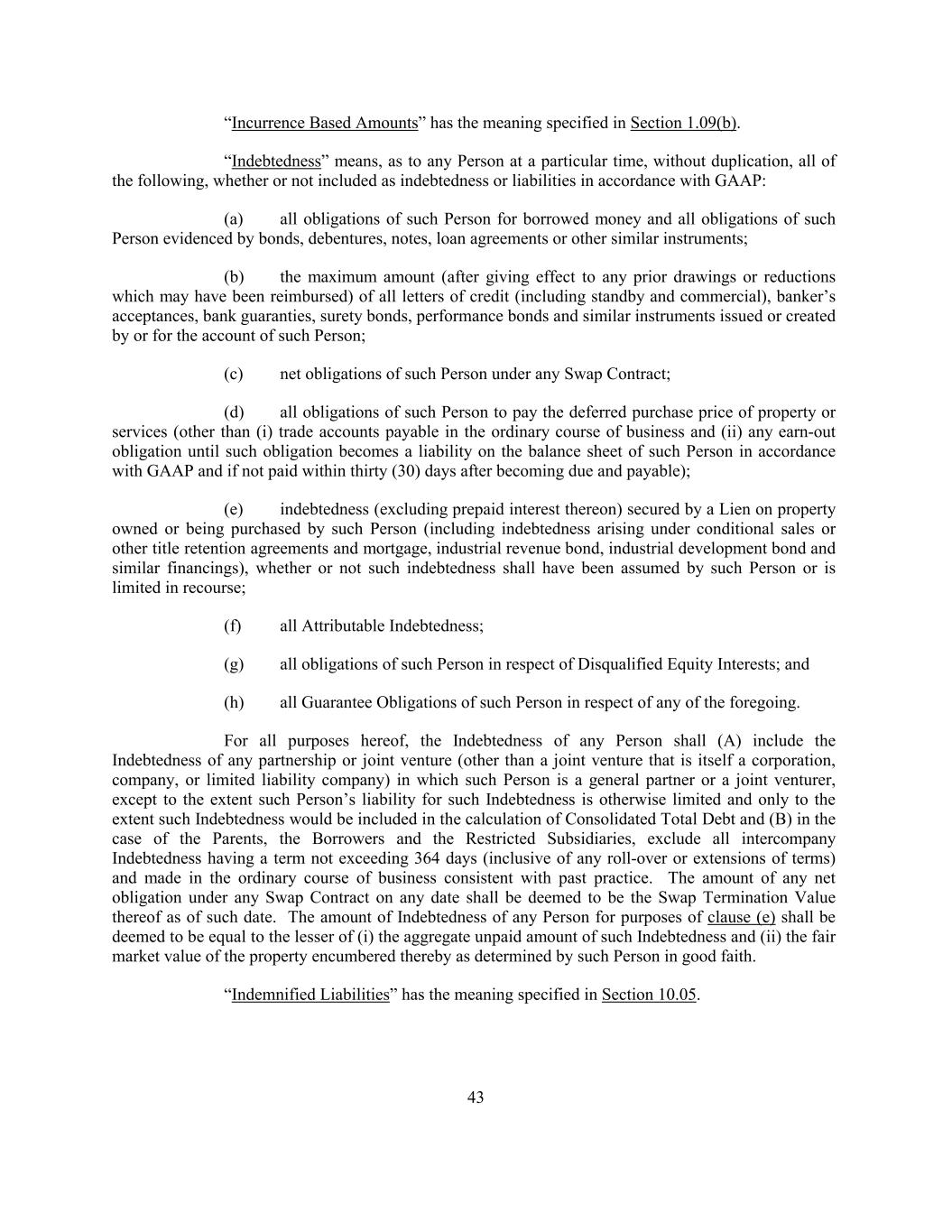 “Incurrence Based Amounts” has the meaning specified in Section 1.09(b). “Indebtedness” means, as to any Person at a particular time, without duplication, all of the following, whether or not included as indebtedness or liabilities in accordance with GAAP: (a) all obligations of such Person for borrowed money and all obligations of such Person evidenced by bonds, debentures, notes, loan agreements or other similar instruments; (b) the maximum amount (after giving effect to any prior drawings or reductions which may have been reimbursed) of all letters of credit (including standby and commercial), banker’s acceptances, bank guaranties, surety bonds, performance bonds and similar instruments issued or created by or for the account of such Person; (c) net obligations of such Person under any Swap Contract; (d) all obligations of such Person to pay the deferred purchase price of property or services (other than (i) trade accounts payable in the ordinary course of business and (ii) any earn-out obligation until such obligation becomes a liability on the balance sheet of such Person in accordance with GAAP and if not paid within thirty (30) days after becoming due and payable); (e) indebtedness (excluding prepaid interest thereon) secured by a Lien on property owned or being purchased by such Person (including indebtedness arising under conditional sales or other title retention agreements and mortgage, industrial revenue bond, industrial development bond and similar financings), whether or not such indebtedness shall have been assumed by such Person or is limited in recourse; (f) all Attributable Indebtedness; (g) all obligations of such Person in respect of Disqualified Equity Interests; and (h) all Guarantee Obligations of such Person in respect of any of the foregoing. For all purposes hereof, the Indebtedness of any Person shall (A) include the Indebtedness of any partnership or joint venture (other than a joint venture that is itself a corporation, company, or limited liability company) in which such Person is a general partner or a joint venturer, except to the extent such Person’s liability for such Indebtedness is otherwise limited and only to the extent such Indebtedness would be included in the calculation of Consolidated Total Debt and (B) in the case of the Parents, the Borrowers and the Restricted Subsidiaries, exclude all intercompany Indebtedness having a term not exceeding 364 days (inclusive of any roll-over or extensions of terms) and made in the ordinary course of business consistent with past practice. The amount of any net obligation under any Swap Contract on any date shall be deemed to be the Swap Termination Value thereof as of such date. The amount of Indebtedness of any Person for purposes of clause (e) shall be deemed to be equal to the lesser of (i) the aggregate unpaid amount of such Indebtedness and (ii) the fair market value of the property encumbered thereby as determined by such Person in good faith. “Indemnified Liabilities” has the meaning specified in Section 10.05. 43