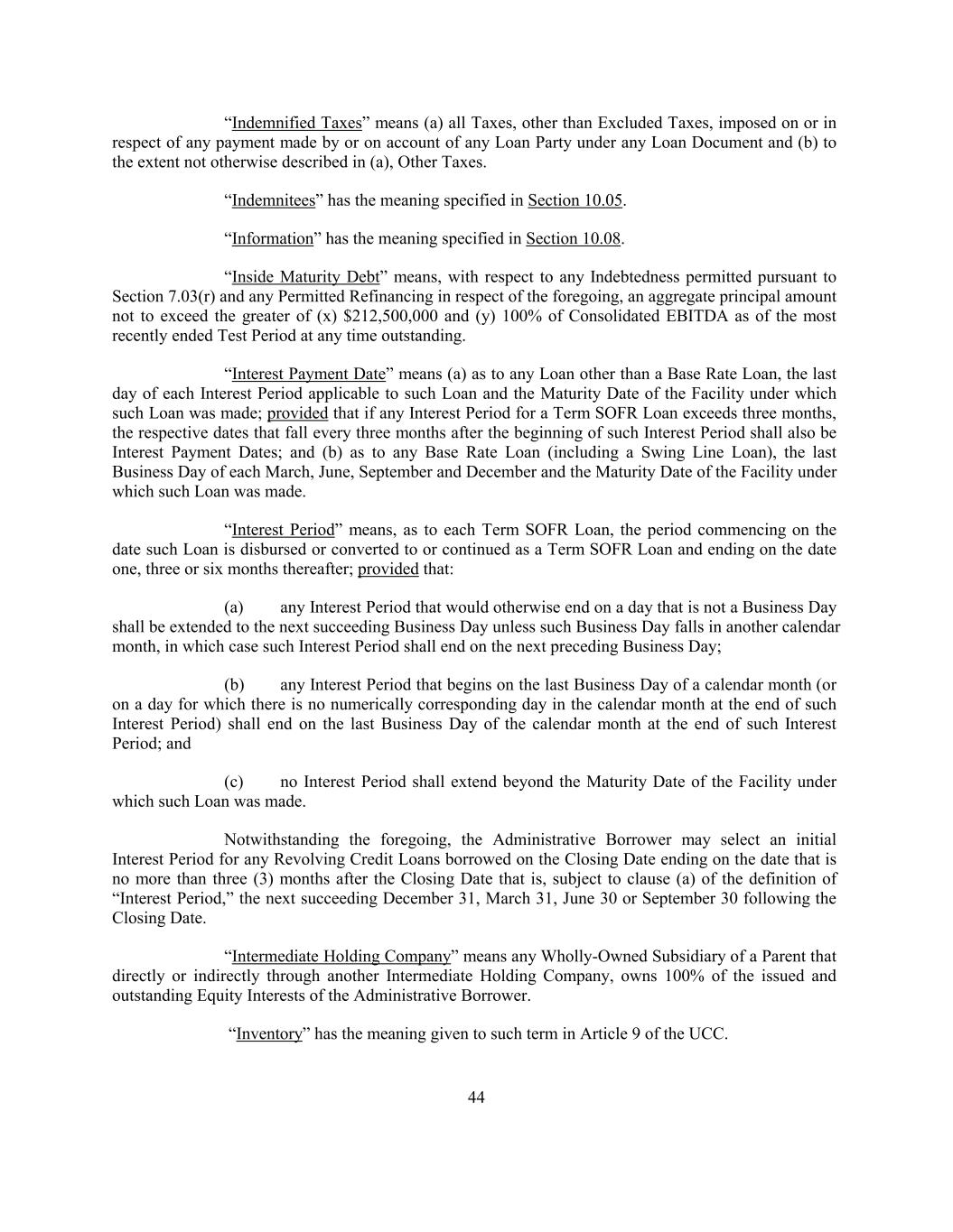 “Indemnified Taxes” means (a) all Taxes, other than Excluded Taxes, imposed on or in respect of any payment made by or on account of any Loan Party under any Loan Document and (b) to the extent not otherwise described in (a), Other Taxes. “Indemnitees” has the meaning specified in Section 10.05. “Information” has the meaning specified in Section 10.08. “Inside Maturity Debt” means, with respect to any Indebtedness permitted pursuant to Section 7.03(r) and any Permitted Refinancing in respect of the foregoing, an aggregate principal amount not to exceed the greater of (x) $212,500,000 and (y) 100% of Consolidated EBITDA as of the most recently ended Test Period at any time outstanding. “Interest Payment Date” means (a) as to any Loan other than a Base Rate Loan, the last day of each Interest Period applicable to such Loan and the Maturity Date of the Facility under which such Loan was made; provided that if any Interest Period for a Term SOFR Loan exceeds three months, the respective dates that fall every three months after the beginning of such Interest Period shall also be Interest Payment Dates; and (b) as to any Base Rate Loan (including a Swing Line Loan), the last Business Day of each March, June, September and December and the Maturity Date of the Facility under which such Loan was made. “Interest Period” means, as to each Term SOFR Loan, the period commencing on the date such Loan is disbursed or converted to or continued as a Term SOFR Loan and ending on the date one, three or six months thereafter; provided that: (a) any Interest Period that would otherwise end on a day that is not a Business Day shall be extended to the next succeeding Business Day unless such Business Day falls in another calendar month, in which case such Interest Period shall end on the next preceding Business Day; (b) any Interest Period that begins on the last Business Day of a calendar month (or on a day for which there is no numerically corresponding day in the calendar month at the end of such Interest Period) shall end on the last Business Day of the calendar month at the end of such Interest Period; and (c) no Interest Period shall extend beyond the Maturity Date of the Facility under which such Loan was made. Notwithstanding the foregoing, the Administrative Borrower may select an initial Interest Period for any Revolving Credit Loans borrowed on the Closing Date ending on the date that is no more than three (3) months after the Closing Date that is, subject to clause (a) of the definition of “Interest Period,” the next succeeding December 31, March 31, June 30 or September 30 following the Closing Date. “Intermediate Holding Company” means any Wholly-Owned Subsidiary of a Parent that directly or indirectly through another Intermediate Holding Company, owns 100% of the issued and outstanding Equity Interests of the Administrative Borrower. “Inventory” has the meaning given to such term in Article 9 of the UCC. 44
