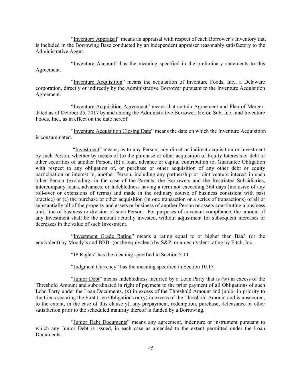 “Inventory Appraisal” means an appraisal with respect of each Borrower’s Inventory that is included in the Borrowing Base conducted by an independent appraiser reasonably satisfactory to the Administrative Agent. “Inventure Account” has the meaning specified in the preliminary statements to this Agreement. “Inventure Acquisition” means the acquisition of Inventure Foods, Inc., a Delaware corporation, directly or indirectly by the Administrative Borrower pursuant to the Inventure Acquisition Agreement. “Inventure Acquisition Agreement” means that certain Agreement and Plan of Merger dated as of October 25, 2017 by and among the Administrative Borrower, Heron Sub, Inc., and Inventure Foods, Inc., as in effect on the date hereof. “Inventure Acquisition Closing Date” means the date on which the Inventure Acquisition is consummated. “Investment” means, as to any Person, any direct or indirect acquisition or investment by such Person, whether by means of (a) the purchase or other acquisition of Equity Interests or debt or other securities of another Person, (b) a loan, advance or capital contribution to, Guarantee Obligation with respect to any obligation of, or purchase or other acquisition of any other debt or equity participation or interest in, another Person, including any partnership or joint venture interest in such other Person (excluding, in the case of the Parents, the Borrowers and the Restricted Subsidiaries, intercompany loans, advances, or Indebtedness having a term not exceeding 364 days (inclusive of any roll-over or extensions of terms) and made in the ordinary course of business consistent with past practice) or (c) the purchase or other acquisition (in one transaction or a series of transactions) of all or substantially all of the property and assets or business of another Person or assets constituting a business unit, line of business or division of such Person. For purposes of covenant compliance, the amount of any Investment shall be the amount actually invested, without adjustment for subsequent increases or decreases in the value of such Investment. “Investment Grade Rating” means a rating equal to or higher than Baa3 (or the equivalent) by Moody’s and BBB- (or the equivalent) by S&P, or an equivalent rating by Fitch, Inc. “IP Rights” has the meaning specified in Section 5.14. “Judgment Currency” has the meaning specified in Section 10.17. “Junior Debt” means Indebtedness incurred by a Loan Party that is (w) in excess of the Threshold Amount and subordinated in right of payment to the prior payment of all Obligations of such Loan Party under the Loan Documents, (x) in excess of the Threshold Amount and junior in priority to the Liens securing the First Lien Obligations or (y) in excess of the Threshold Amount and is unsecured, to the extent, in the case of this clause y), any prepayment, redemption, purchase, defeasance or other satisfaction prior to the scheduled maturity thereof is funded by a Borrowing. “Junior Debt Documents” means any agreement, indenture or instrument pursuant to which any Junior Debt is issued, in each case as amended to the extent permitted under the Loan Documents. 45