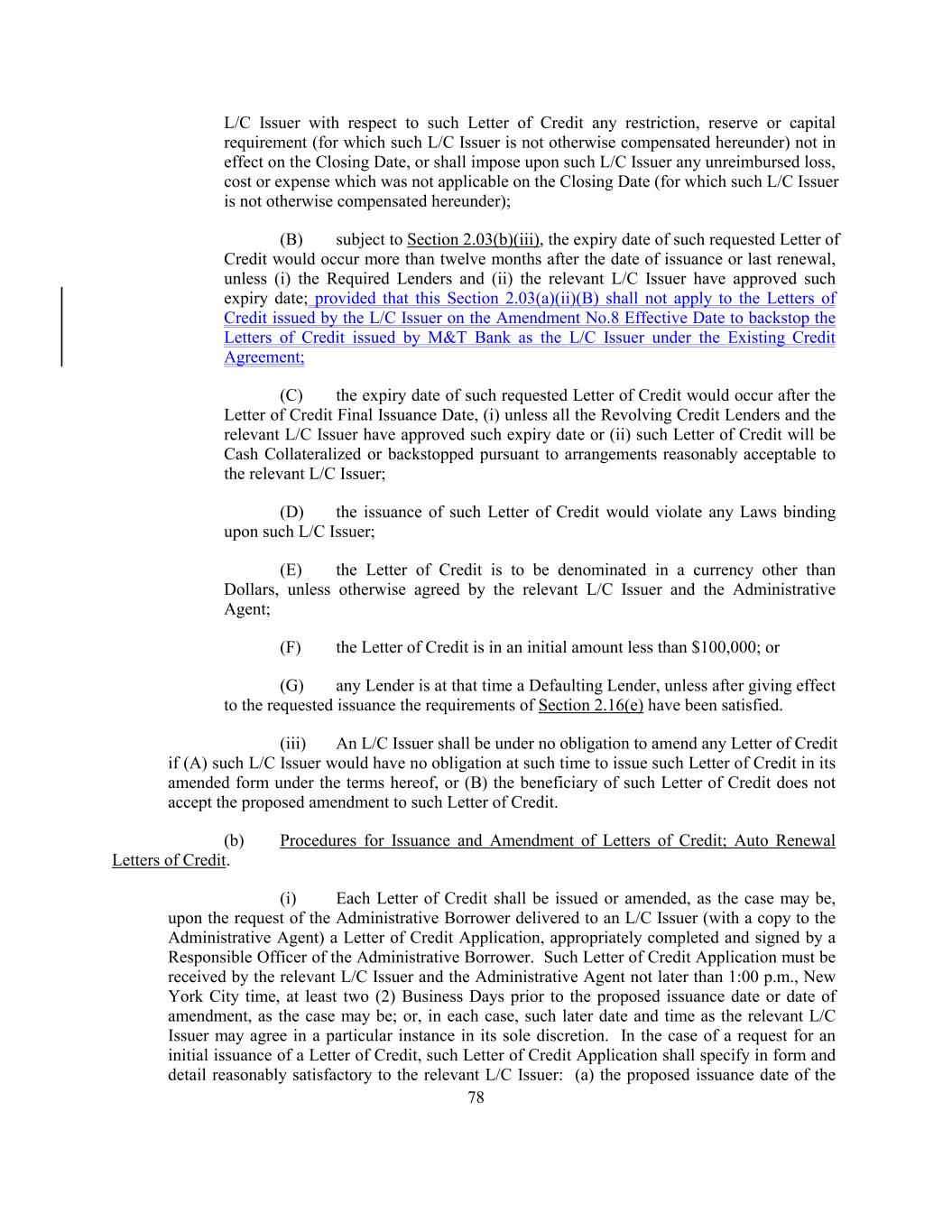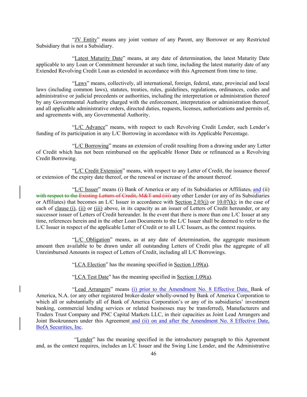 “JV Entity” means any joint venture of any Parent, any Borrower or any Restricted Subsidiary that is not a Subsidiary. “Latest Maturity Date” means, at any date of determination, the latest Maturity Date applicable to any Loan or Commitment hereunder at such time, including the latest maturity date of any Extended Revolving Credit Loan as extended in accordance with this Agreement from time to time. “Laws” means, collectively, all international, foreign, federal, state, provincial and local laws (including common laws), statutes, treaties, rules, guidelines, regulations, ordinances, codes and administrative or judicial precedents or authorities, including the interpretation or administration thereof by any Governmental Authority charged with the enforcement, interpretation or administration thereof, and all applicable administrative orders, directed duties, requests, licenses, authorizations and permits of, and agreements with, any Governmental Authority. “L/C Advance” means, with respect to each Revolving Credit Lender, such Lender’s funding of its participation in any L/C Borrowing in accordance with its Applicable Percentage. “L/C Borrowing” means an extension of credit resulting from a drawing under any Letter of Credit which has not been reimbursed on the applicable Honor Date or refinanced as a Revolving Credit Borrowing. “L/C Credit Extension” means, with respect to any Letter of Credit, the issuance thereof or extension of the expiry date thereof, or the renewal or increase of the amount thereof. “L/C Issuer” means (i) Bank of America or any of its Subsidiaries or Affiliates, and (ii) with respect to the Existing Letters of Credit, M&T and (iii) any other Lender (or any of its Subsidiaries or Affiliates) that becomes an L/C Issuer in accordance with Section 2.03(j) or 10.07(k); in the case of each of clause (i), (ii) or (iii) above, in its capacity as an issuer of Letters of Credit hereunder, or any successor issuer of Letters of Credit hereunder. In the event that there is more than one L/C Issuer at any time, references herein and in the other Loan Documents to the L/C Issuer shall be deemed to refer to the L/C Issuer in respect of the applicable Letter of Credit or to all L/C Issuers, as the context requires. “L/C Obligation” means, as at any date of determination, the aggregate maximum amount then available to be drawn under all outstanding Letters of Credit plus the aggregate of all Unreimbursed Amounts in respect of Letters of Credit, including all L/C Borrowings. “LCA Election” has the meaning specified in Section 1.09(a). “LCA Test Date” has the meaning specified in Section 1.09(a). “Lead Arrangers” means (i) prior to the Amendment No. 8 Effective Date, Bank of America, N.A. (or any other registered broker-dealer wholly-owned by Bank of America Corporation to which all or substantially all of Bank of America Corporation’s or any of its subsidiaries’ investment banking, commercial lending services or related businesses may be transferred), Manufacturers and Traders Trust Company and PNC Capital Markets LLC, in their capacities as Joint Lead Arrangers and Joint Bookrunners under this Agreement and (ii) on and after the Amendment No. 8 Effective Date, BofA Securities, Inc. “Lender” has the meaning specified in the introductory paragraph to this Agreement and, as the context requires, includes an L/C Issuer and the Swing Line Lender, and the Administrative 46
