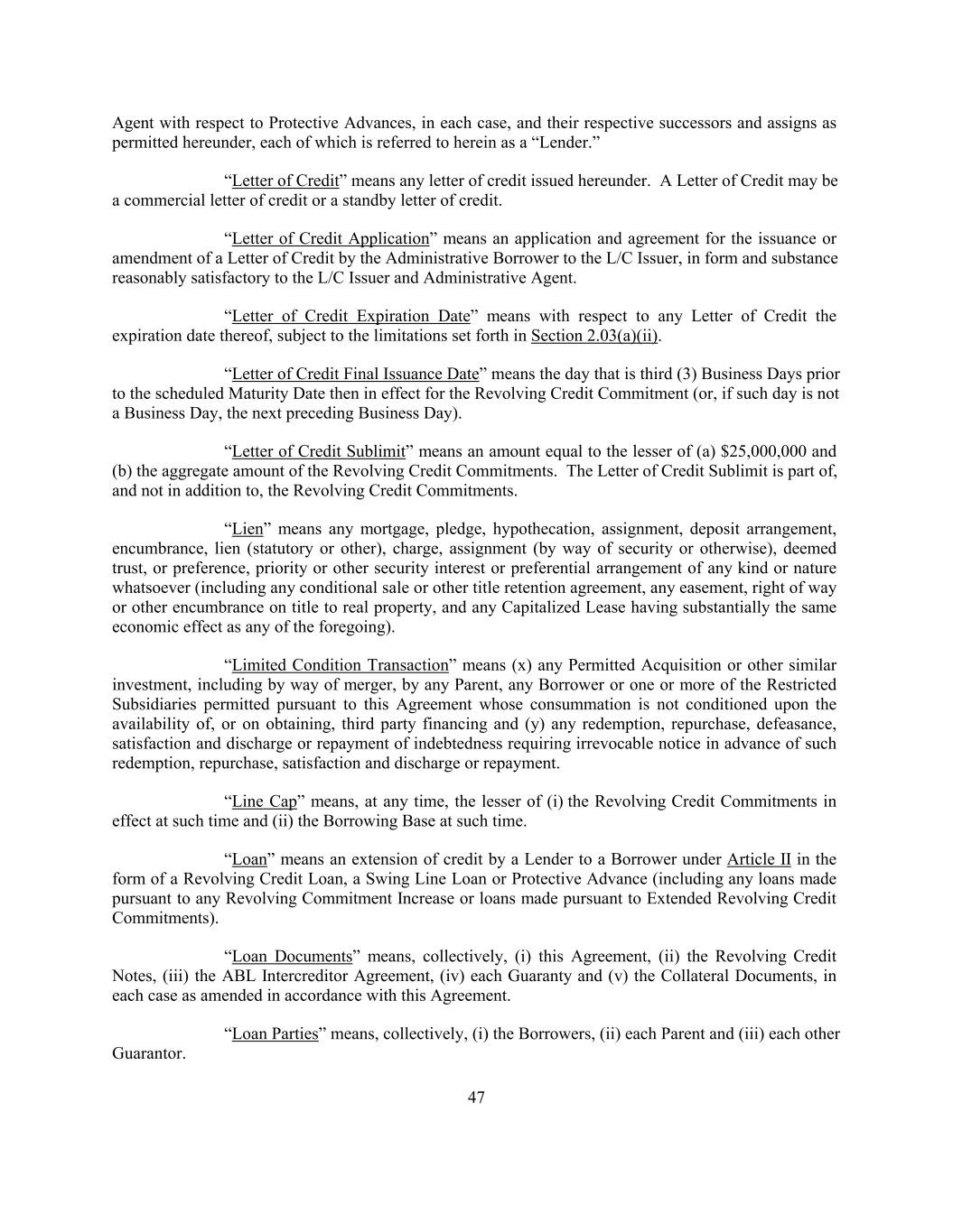 Agent with respect to Protective Advances, in each case, and their respective successors and assigns as permitted hereunder, each of which is referred to herein as a “Lender.” “Letter of Credit” means any letter of credit issued hereunder. A Letter of Credit may be a commercial letter of credit or a standby letter of credit. “Letter of Credit Application” means an application and agreement for the issuance or amendment of a Letter of Credit by the Administrative Borrower to the L/C Issuer, in form and substance reasonably satisfactory to the L/C Issuer and Administrative Agent. “Letter of Credit Expiration Date” means with respect to any Letter of Credit the expiration date thereof, subject to the limitations set forth in Section 2.03(a)(ii). “Letter of Credit Final Issuance Date” means the day that is third (3) Business Days prior to the scheduled Maturity Date then in effect for the Revolving Credit Commitment (or, if such day is not a Business Day, the next preceding Business Day). “Letter of Credit Sublimit” means an amount equal to the lesser of (a) $25,000,000 and (b) the aggregate amount of the Revolving Credit Commitments. The Letter of Credit Sublimit is part of, and not in addition to, the Revolving Credit Commitments. “Lien” means any mortgage, pledge, hypothecation, assignment, deposit arrangement, encumbrance, lien (statutory or other), charge, assignment (by way of security or otherwise), deemed trust, or preference, priority or other security interest or preferential arrangement of any kind or nature whatsoever (including any conditional sale or other title retention agreement, any easement, right of way or other encumbrance on title to real property, and any Capitalized Lease having substantially the same economic effect as any of the foregoing). “Limited Condition Transaction” means (x) any Permitted Acquisition or other similar investment, including by way of merger, by any Parent, any Borrower or one or more of the Restricted Subsidiaries permitted pursuant to this Agreement whose consummation is not conditioned upon the availability of, or on obtaining, third party financing and (y) any redemption, repurchase, defeasance, satisfaction and discharge or repayment of indebtedness requiring irrevocable notice in advance of such redemption, repurchase, satisfaction and discharge or repayment. “Line Cap” means, at any time, the lesser of (i) the Revolving Credit Commitments in effect at such time and (ii) the Borrowing Base at such time. “Loan” means an extension of credit by a Lender to a Borrower under Article II in the form of a Revolving Credit Loan, a Swing Line Loan or Protective Advance (including any loans made pursuant to any Revolving Commitment Increase or loans made pursuant to Extended Revolving Credit Commitments). “Loan Documents” means, collectively, (i) this Agreement, (ii) the Revolving Credit Notes, (iii) the ABL Intercreditor Agreement, (iv) each Guaranty and (v) the Collateral Documents, in each case as amended in accordance with this Agreement. “Loan Parties” means, collectively, (i) the Borrowers, (ii) each Parent and (iii) each other Guarantor. 47
